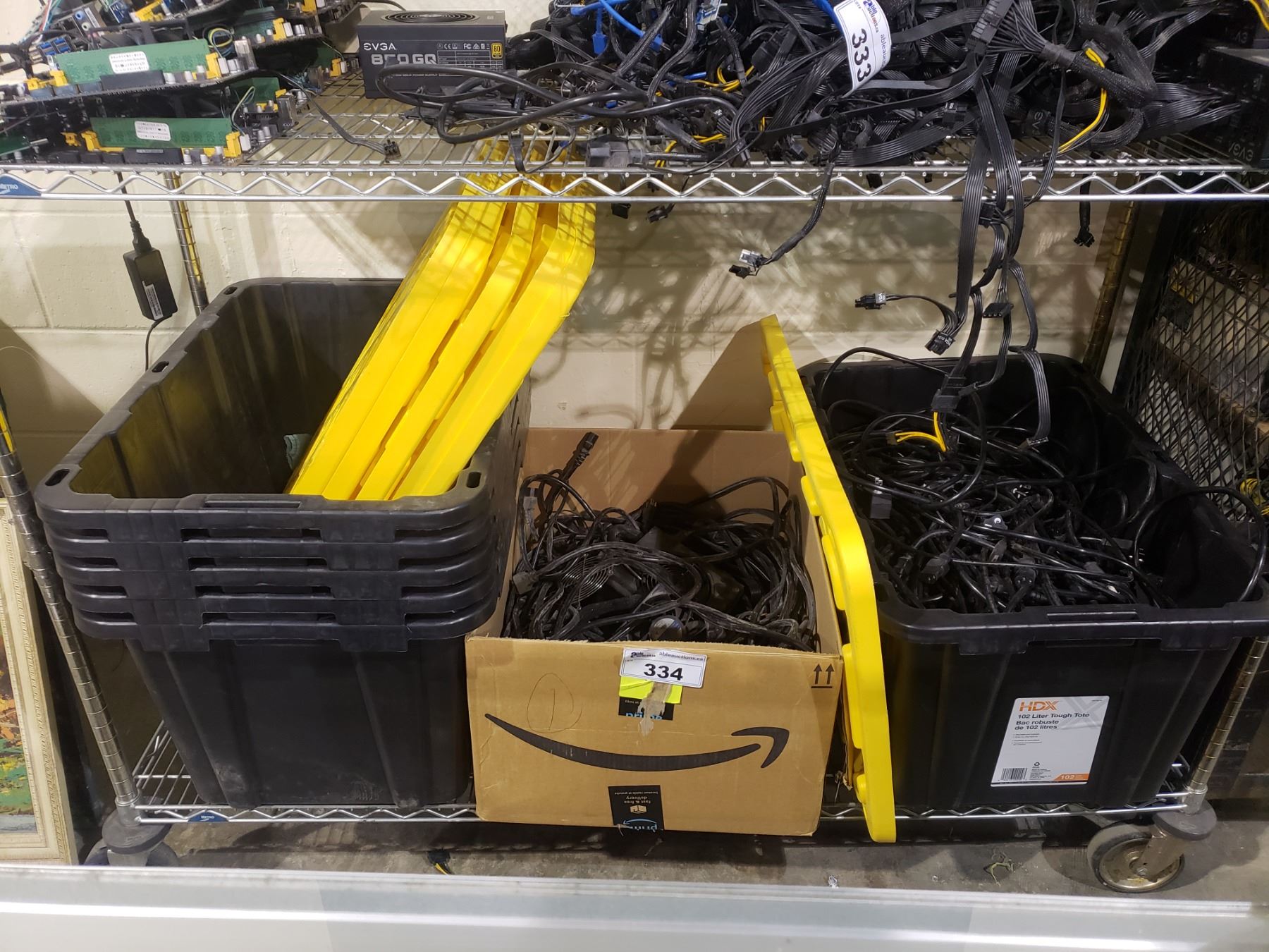 SHELF OF ASSORTED POWER CORDS & STORAGE TOTES