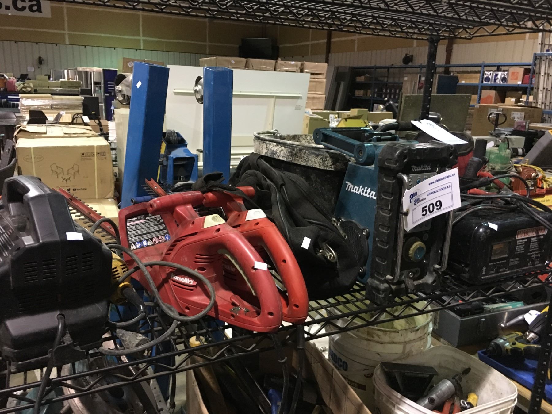 SHELF OF ASSORTED POWER TOOLS, HOMELITE HEDGE TRIMMERS, MAKITA WORK RADIO AND MORE