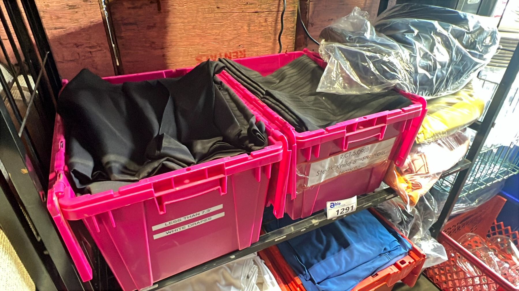SHELF OF ASSORTED PROFESSIONAL EVENT / BANQUET TABLE LINENS IN LARGE FOLD TOP BINS *BINS INCLUDED*