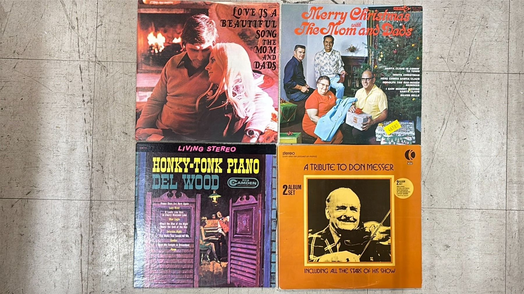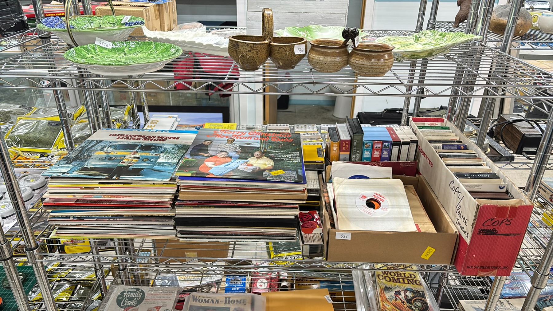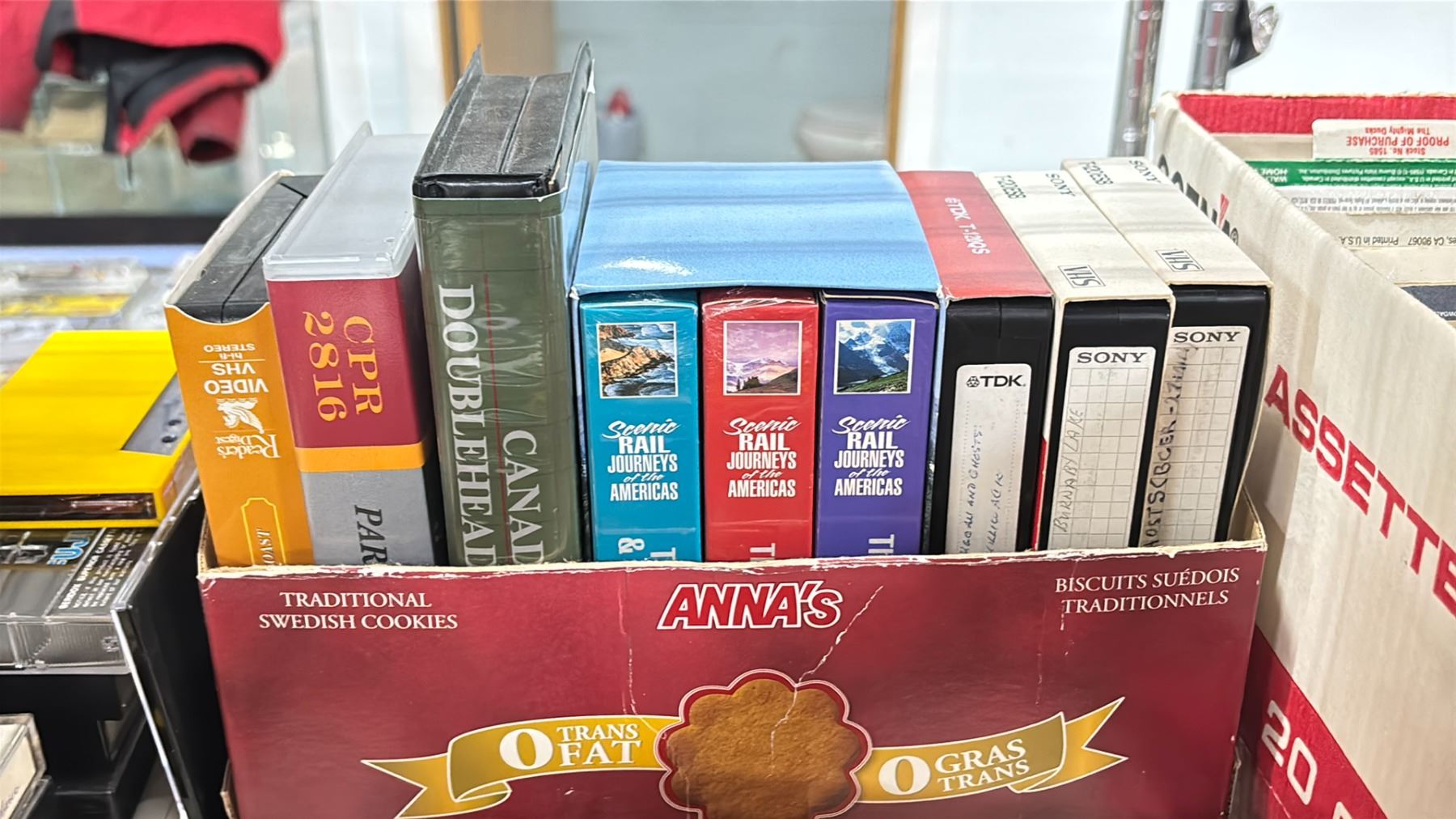 SHELF OF ASSORTED RECORDS, VHS & CASSETTE TAPES