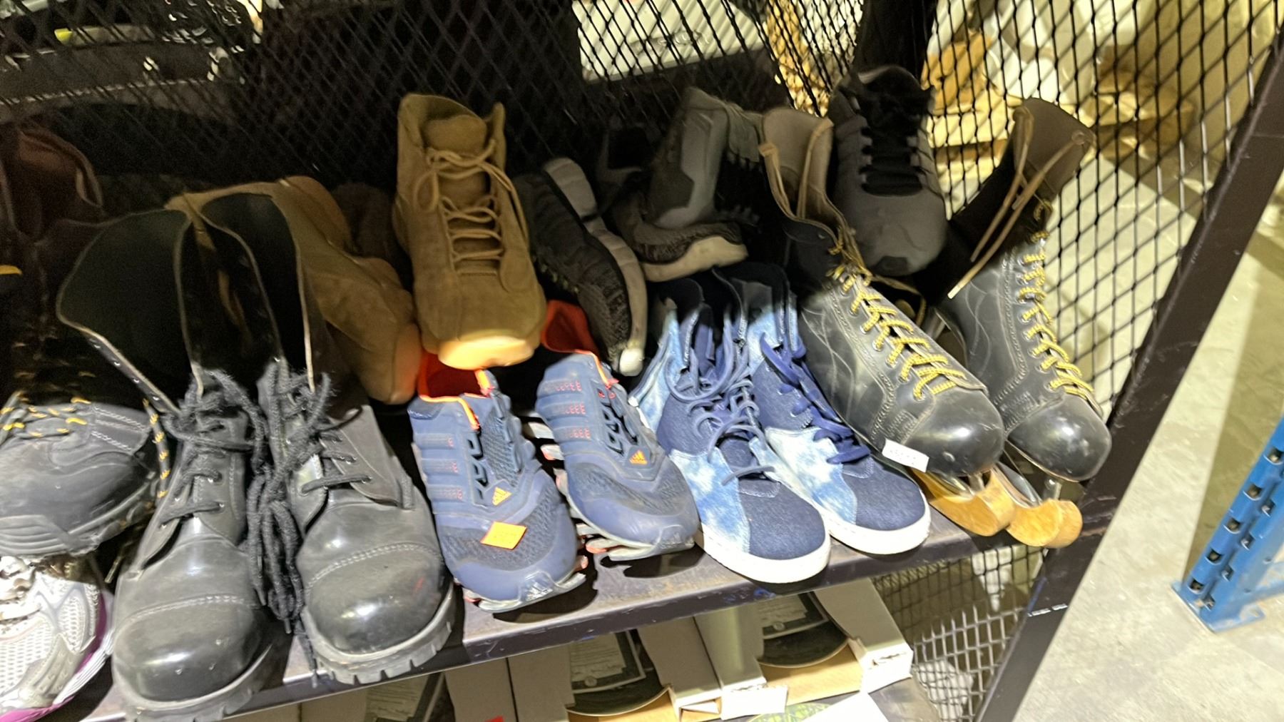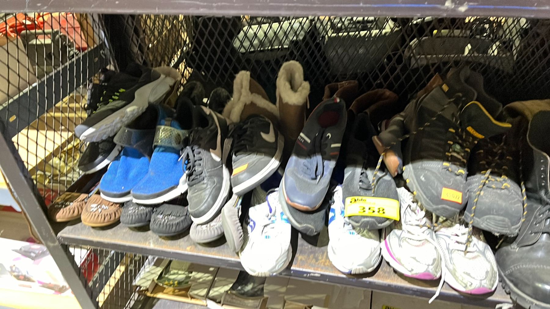 SHELF OF ASSORTED SHOES & ICE SKATES
