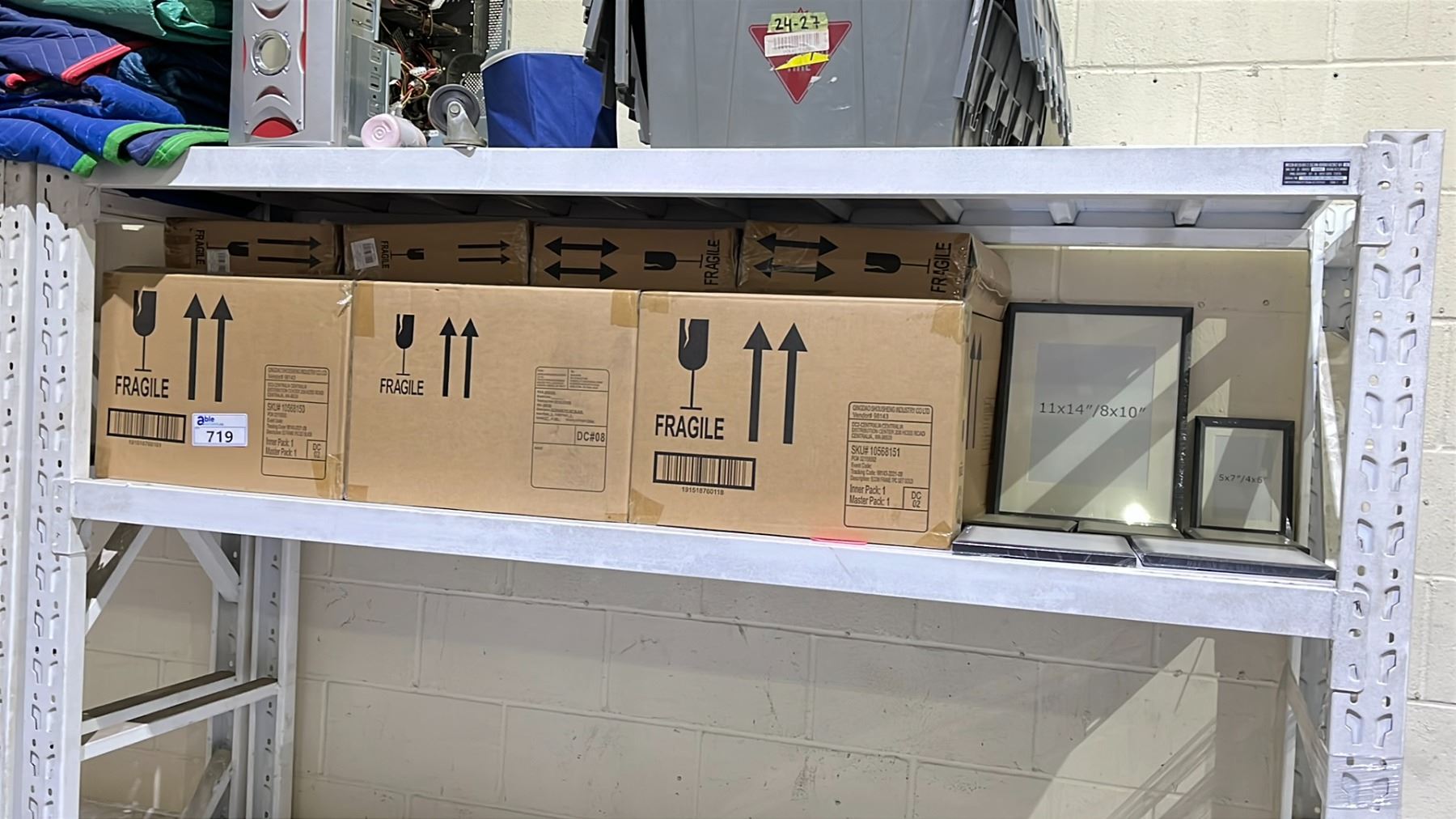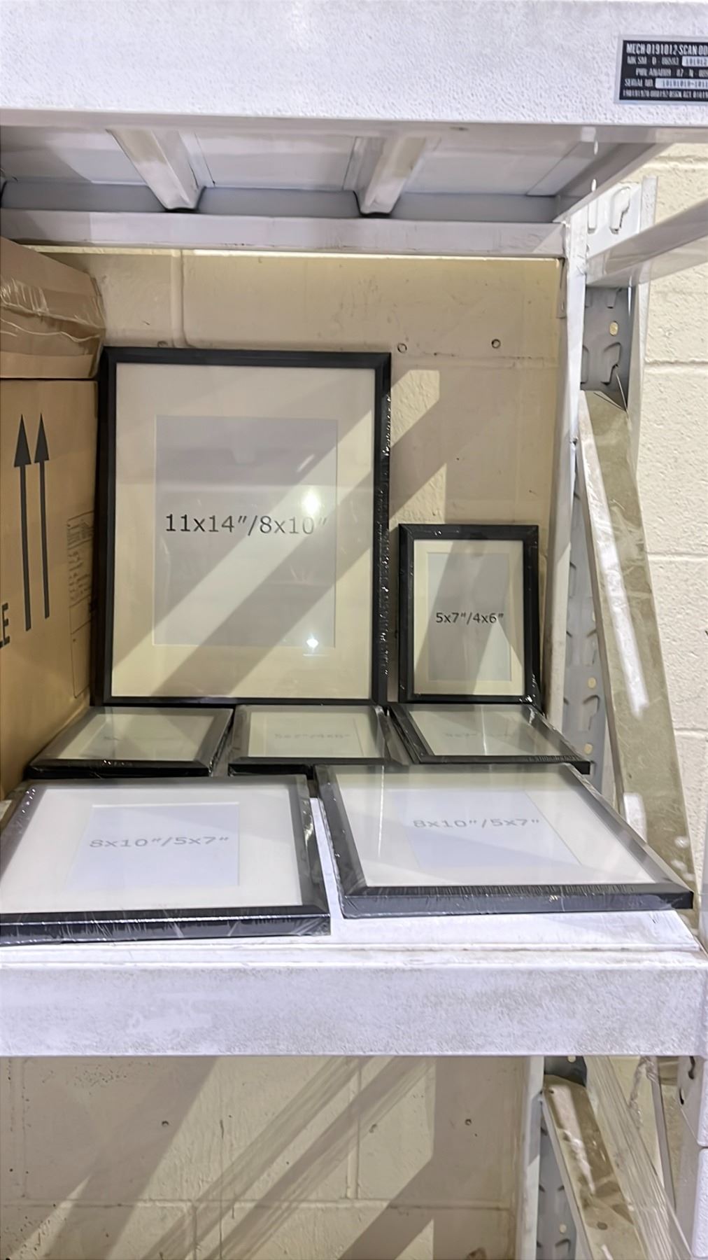SHELF OF ASSORTED SIZE PICTURE FRAMES