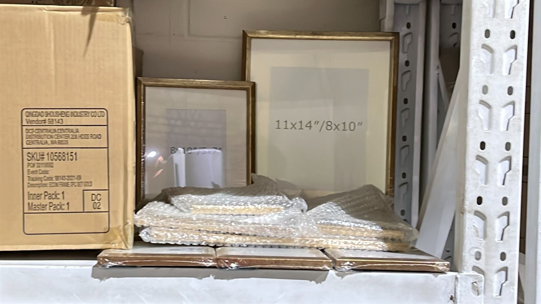 SHELF OF ASSORTED SIZE PICTURE FRAMES