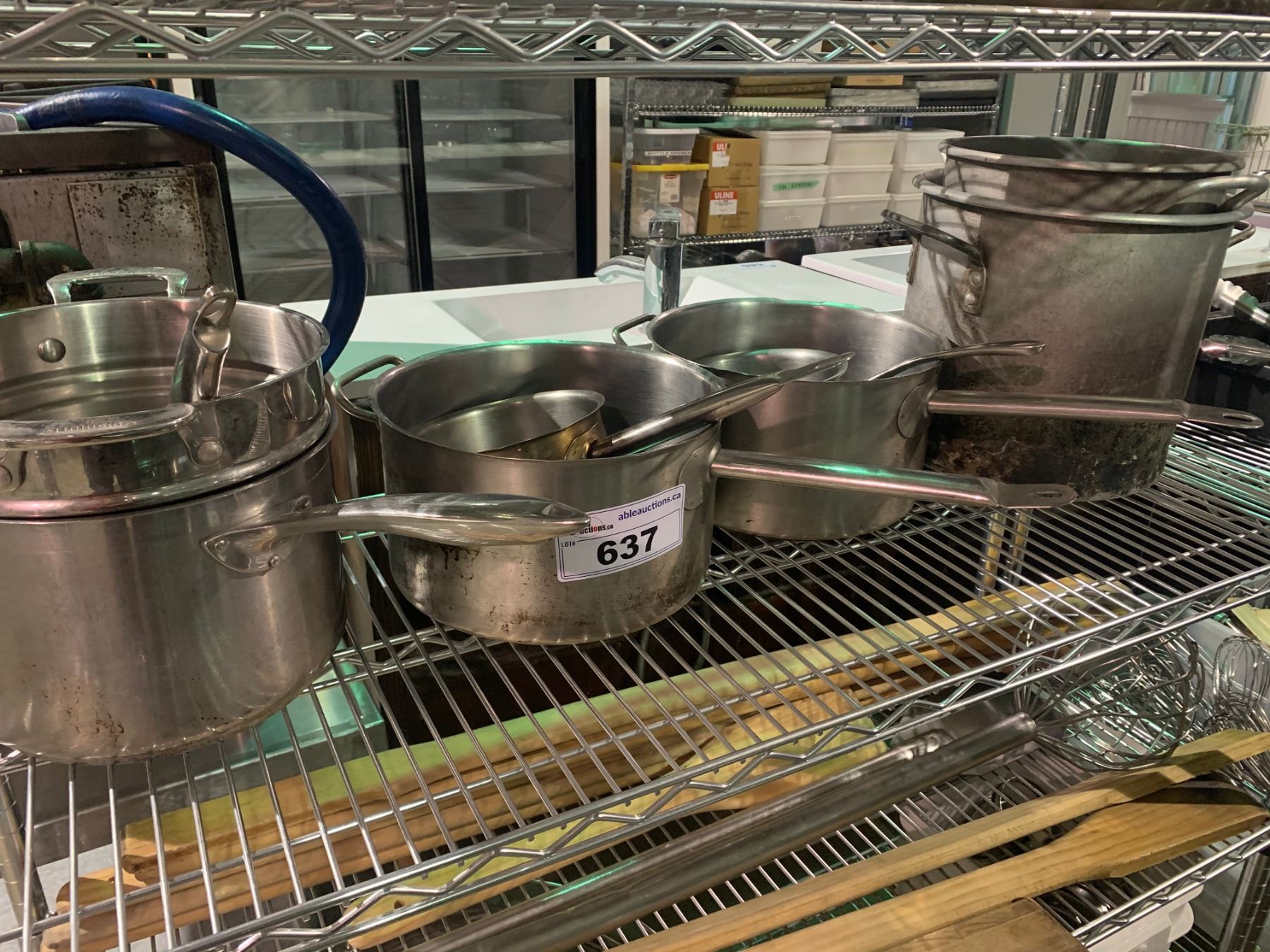 SHELF OF ASSORTED SIZED COMMERCIAL STOCK POTS