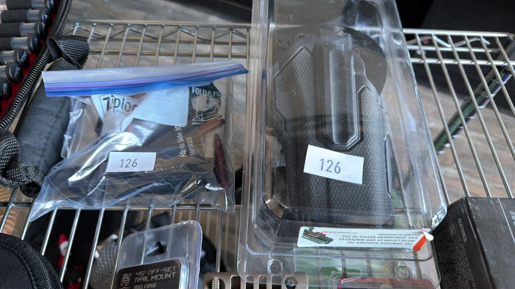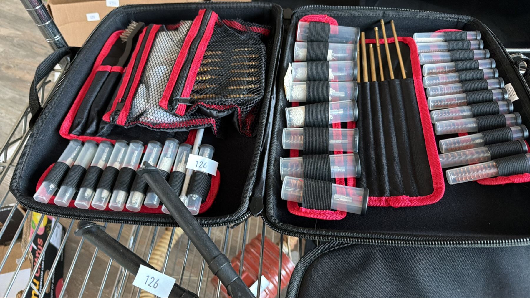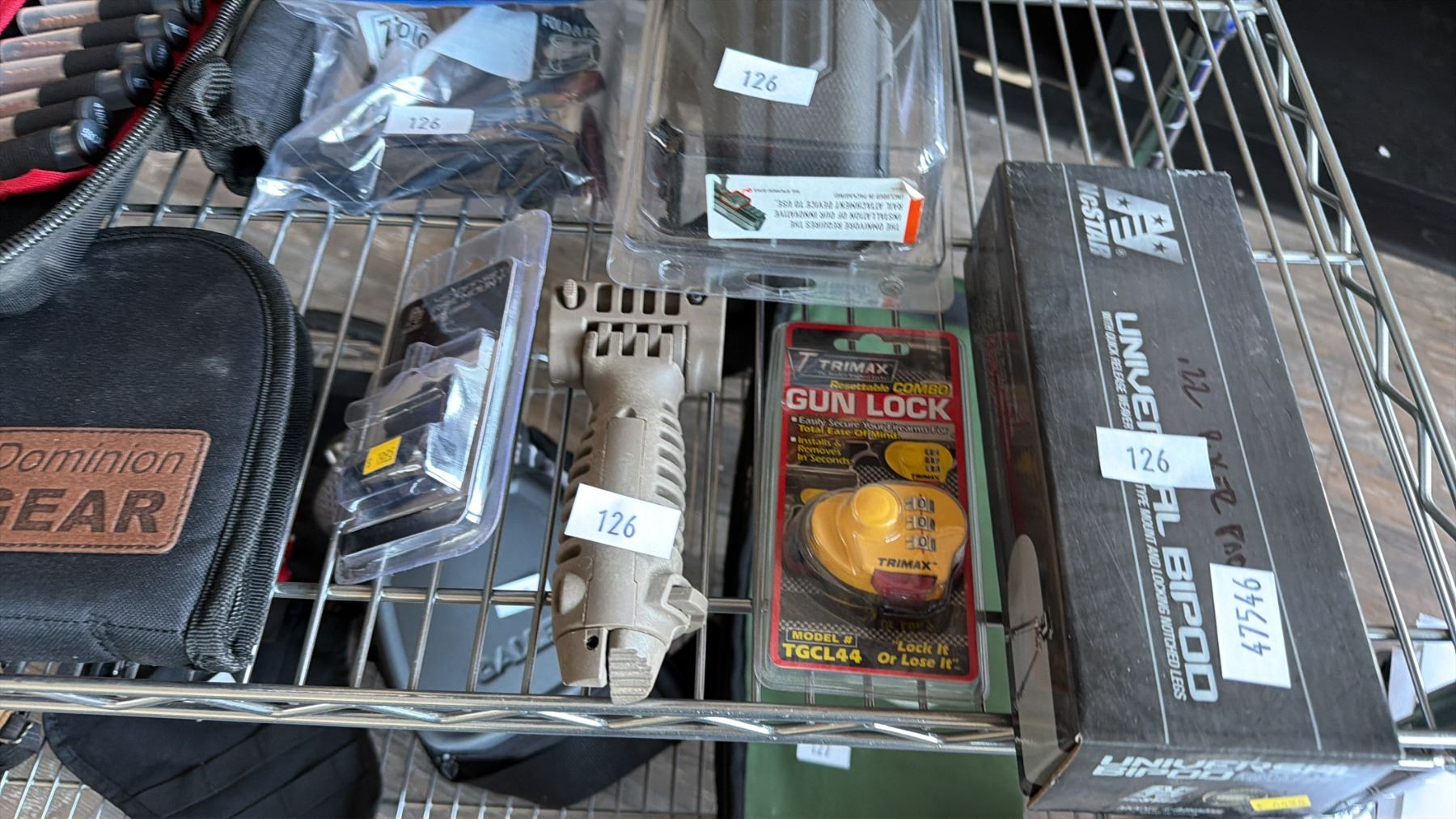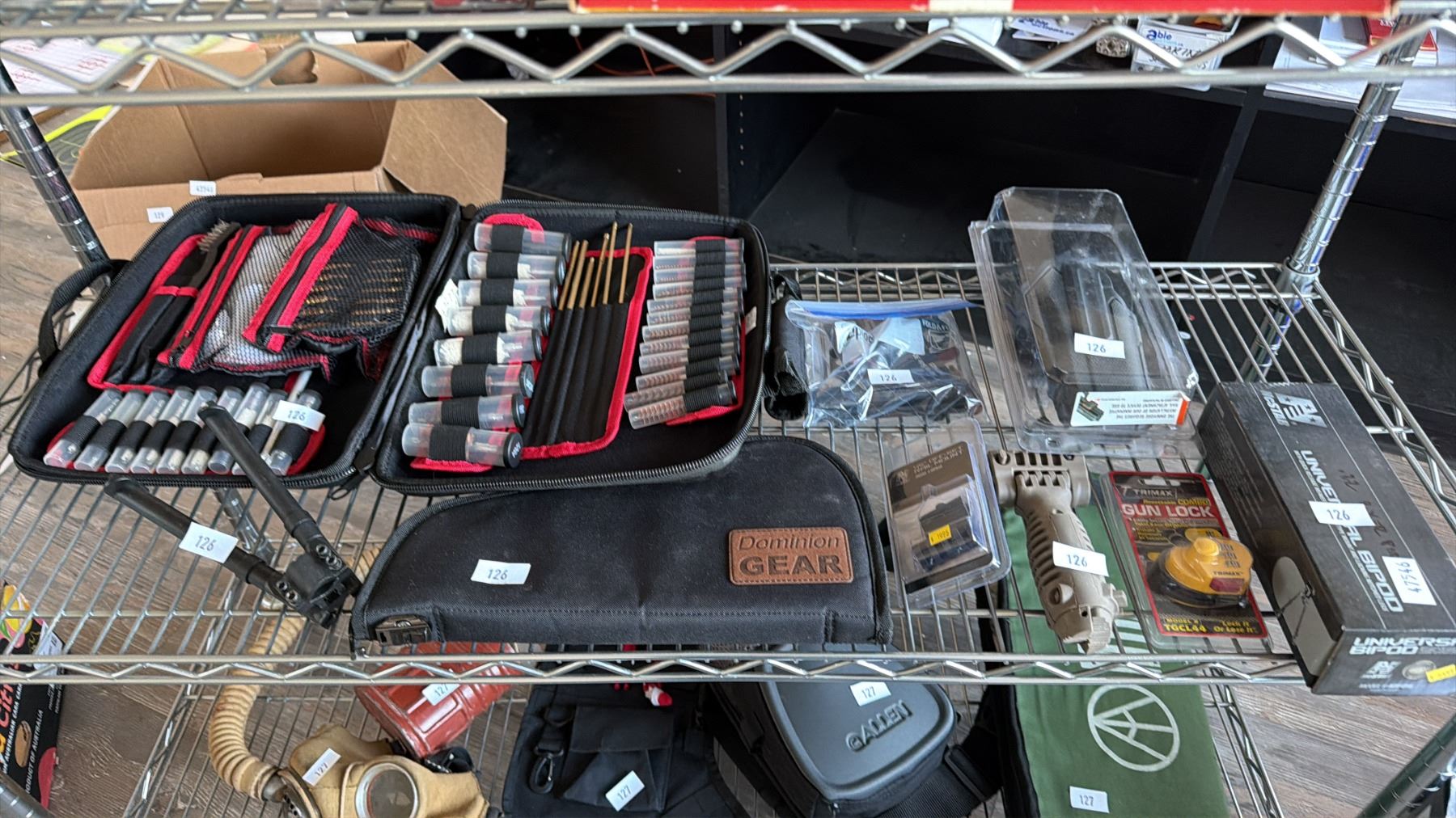 SHELF OF ASSORTED SPORT SHOOTING EQUIPMENT INCLUDING; TRIGGER LOCK, GUN CLEANING KIT, BIPOD & MORE\