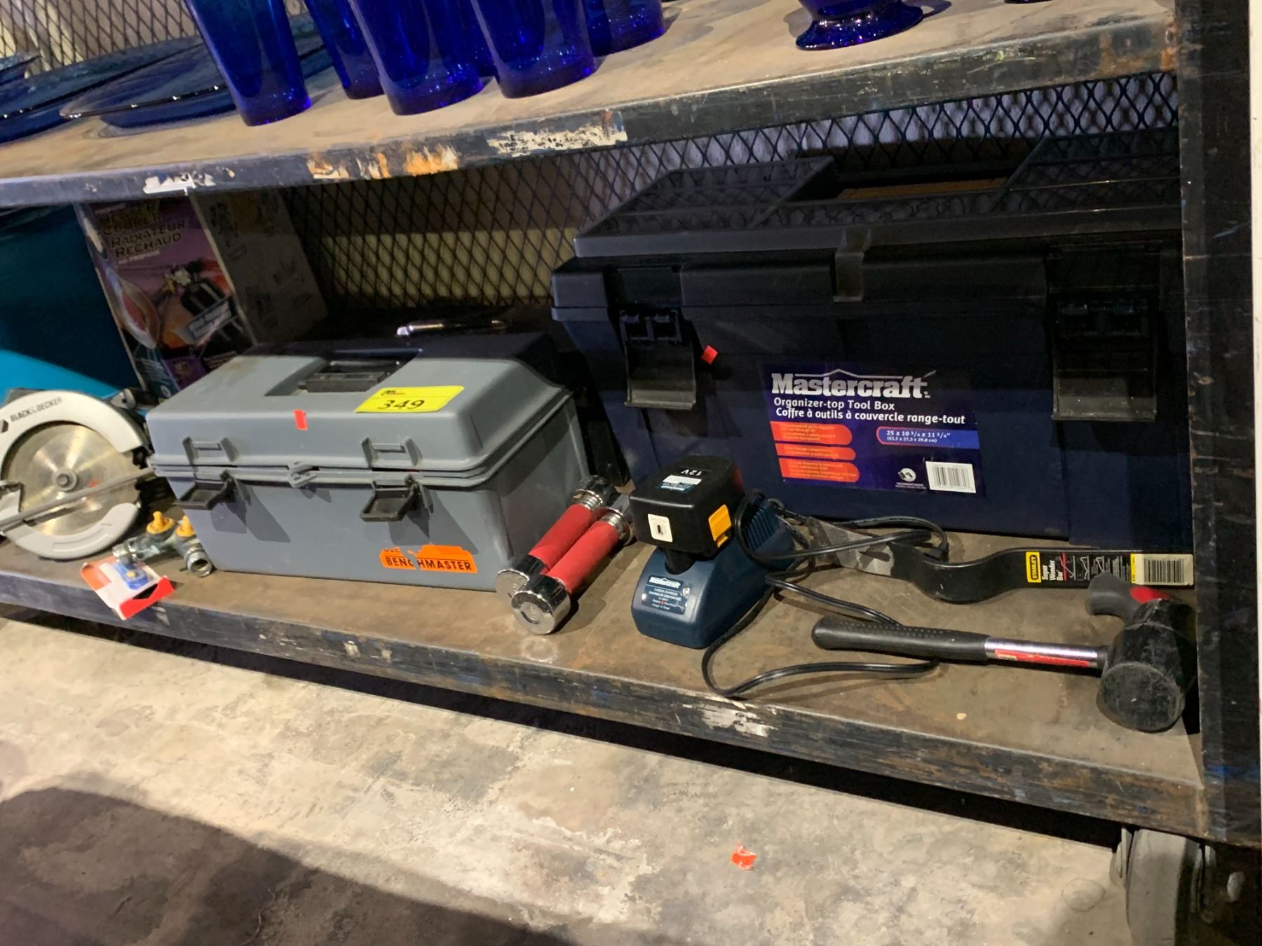 SHELF OF ASSORTED TOOLS; BLACK AND DECKER SAW, TOOL BOXES WITH CONTENTS, NORTHERN ESCAPE HEATER COOLER AND MORE