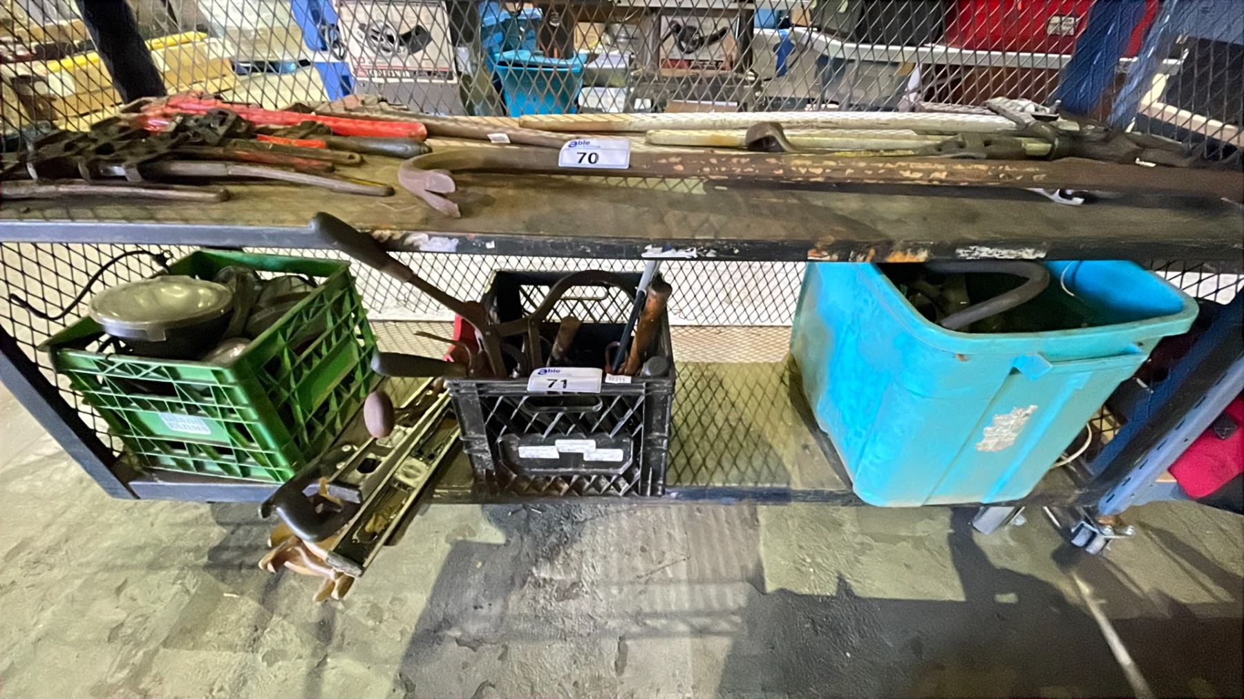 SHELF OF ASSORTED TOOLS INCLUDING; AUTOMOTIVE HEADLIGHTS, LEVELS, TIN SNIPS & MORE