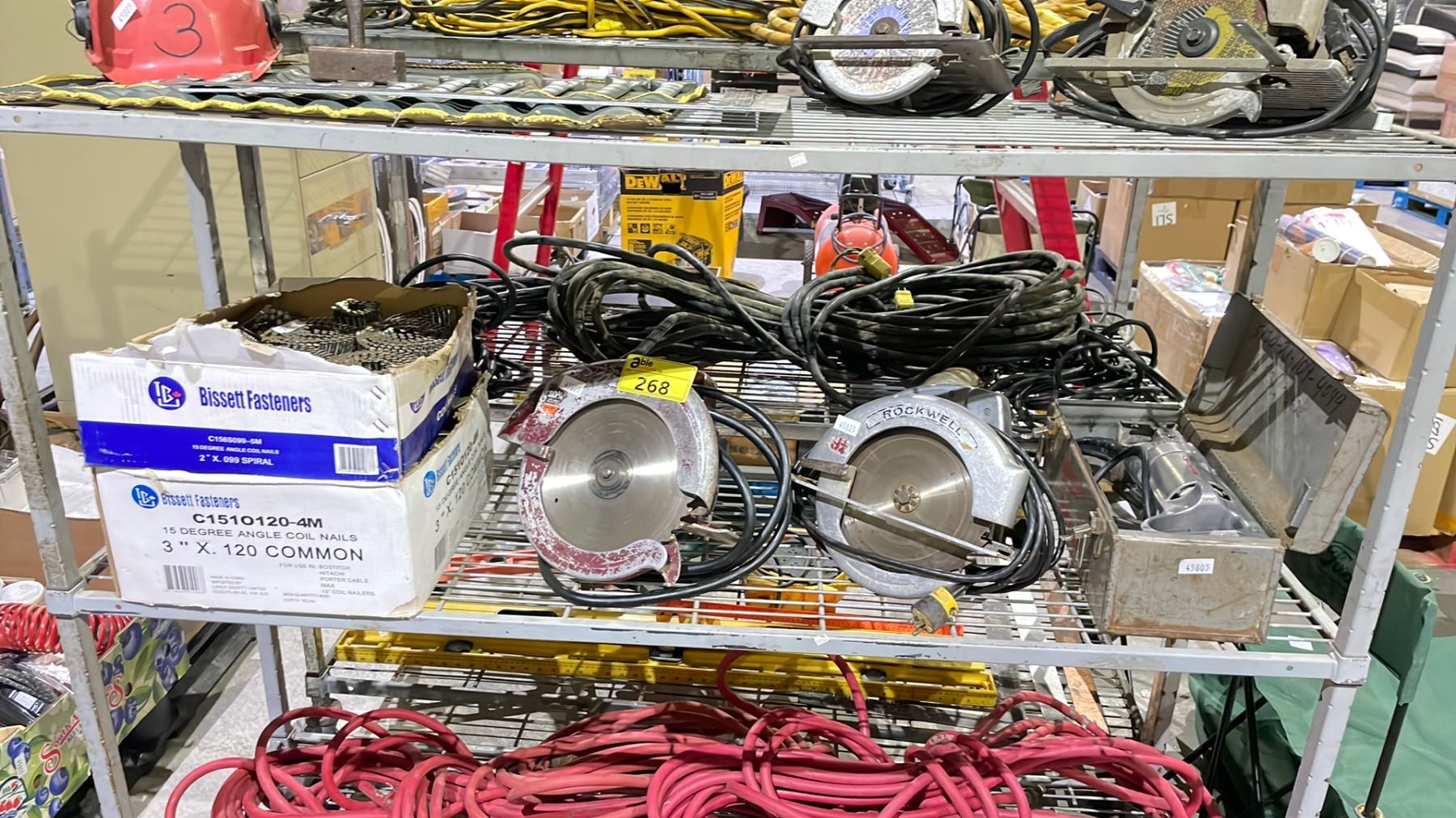 SHELF OF ASSORTED TOOLS INCLUDING; CIRCULAR SAWS, RECIPROCATING SAW & COIL NAILS
