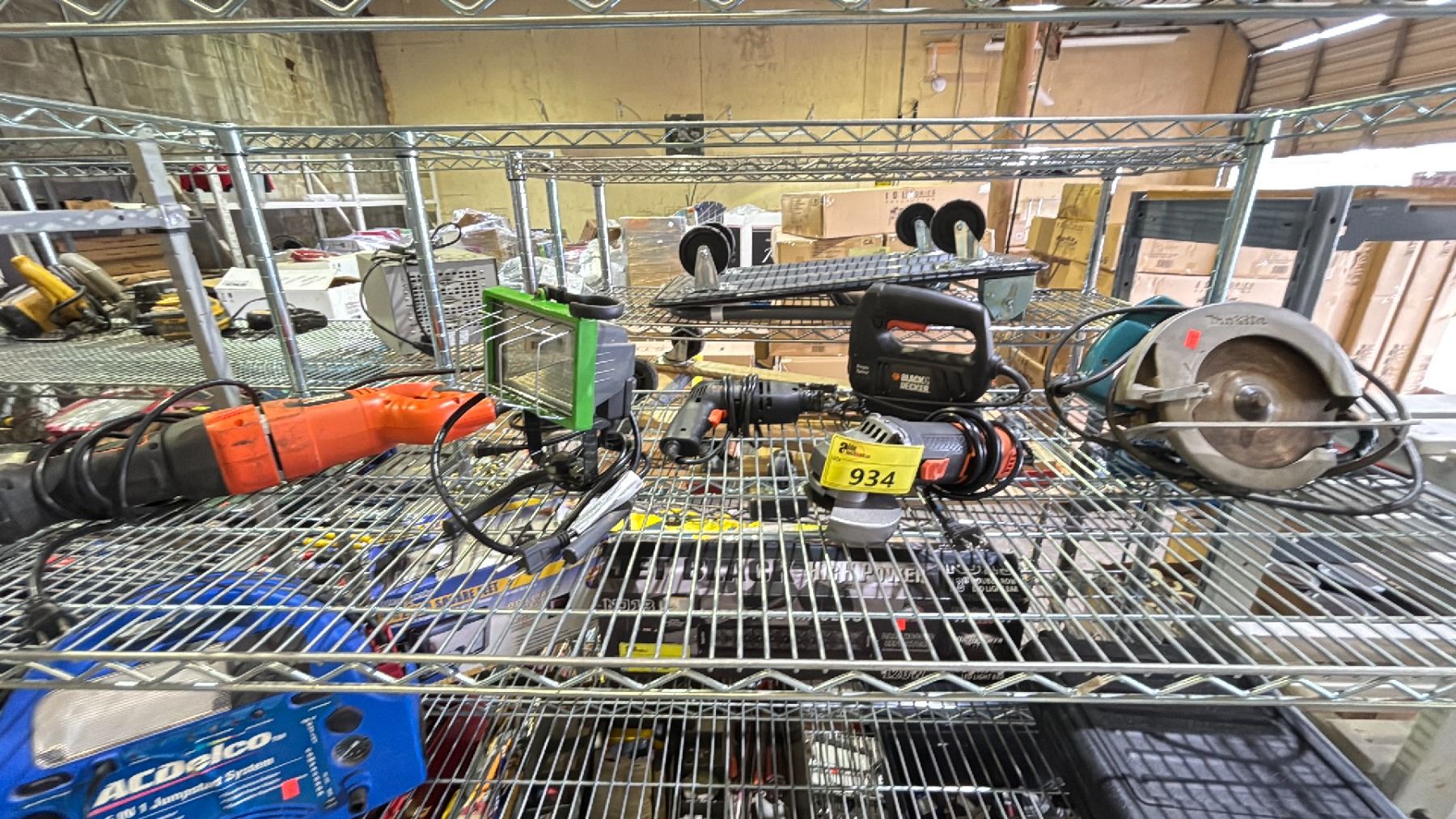 SHELF OF ASSORTED TOOLS INCLUDING; RECIPROCATING SAW, CIRCULAR SAW, ANGLE GRINDER & MORE