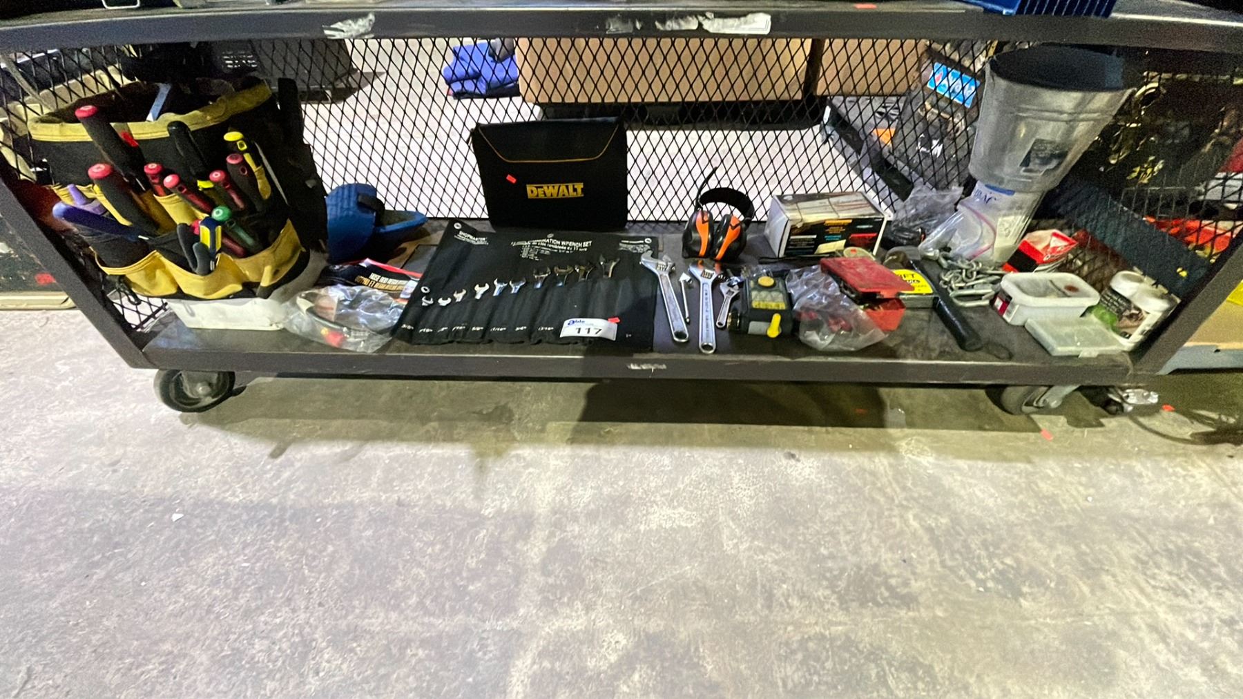 SHELF OF ASSORTED TOOLS, INCLUDING, WRENCH SET, TOOL BELT (WITH TOOLS) HAMMER MEASURING TAPE, & MORE