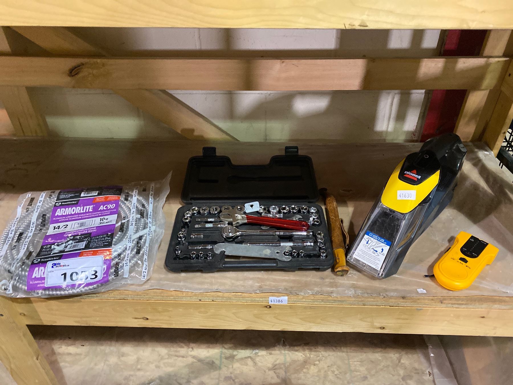 SHELF OF ASSORTED TOOLS, SOCKET SET, STUD FINDER, 32FT. ARMOURED WIRING