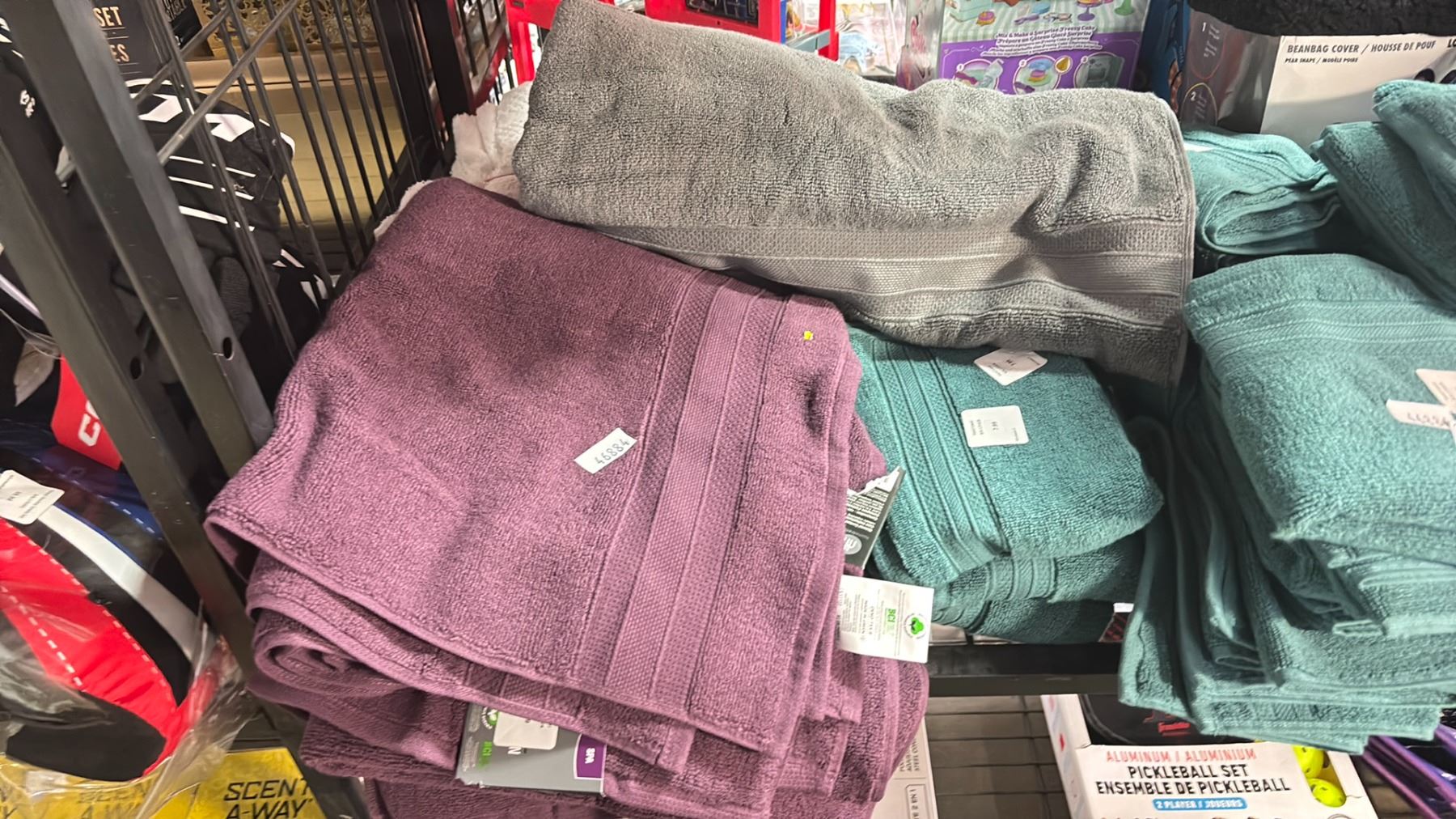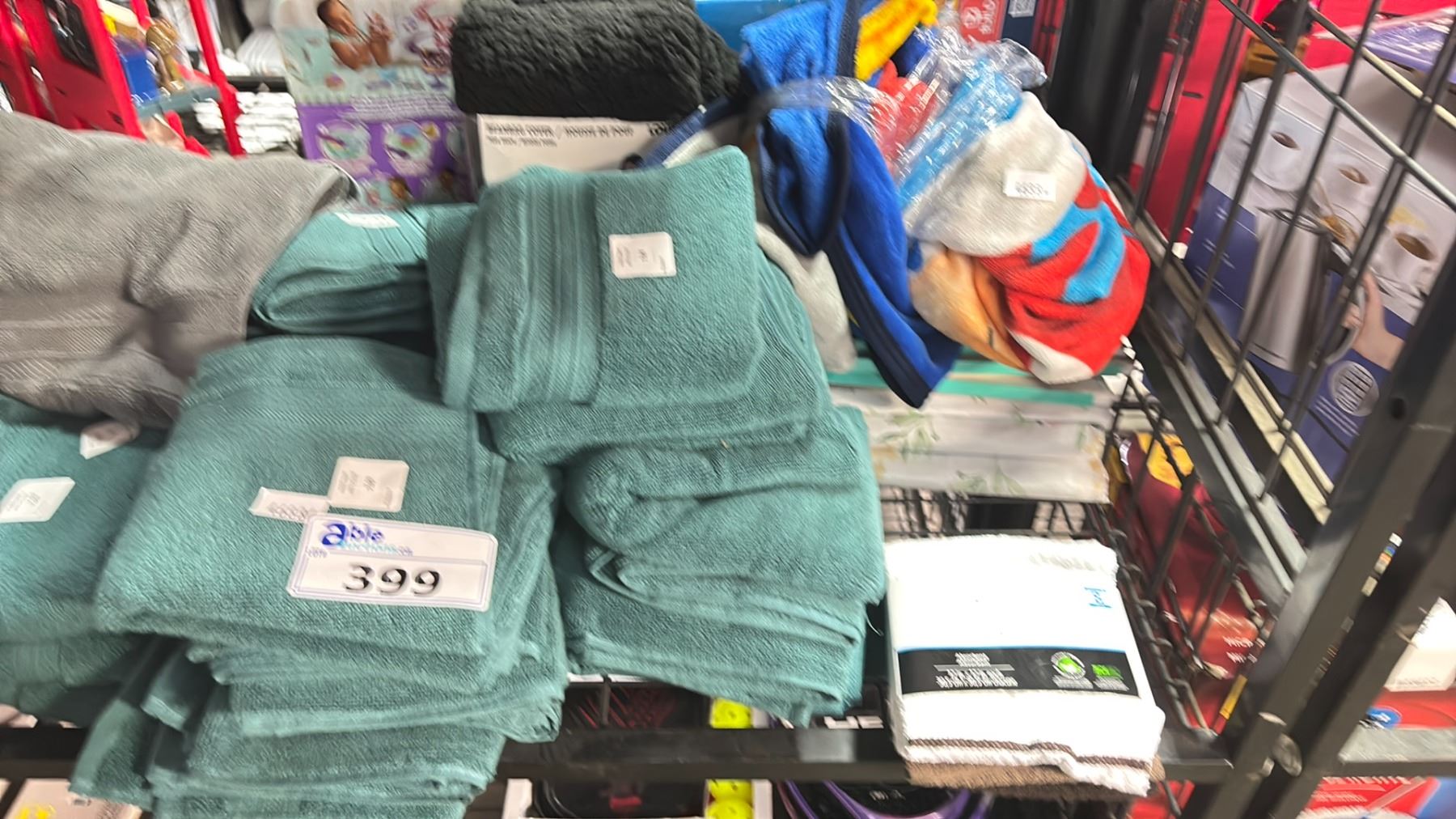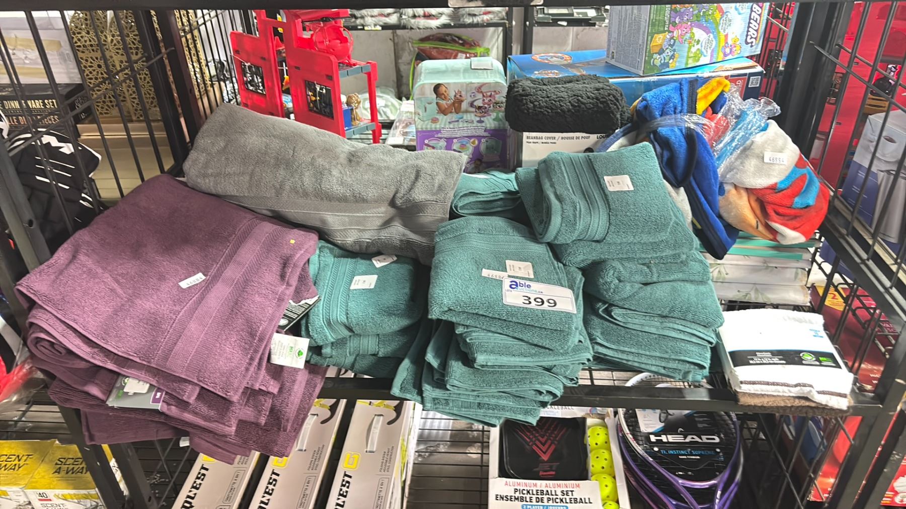 SHELF OF ASSORTED TOWELS, KITCHEN TOWELS & BEANBAG COVER