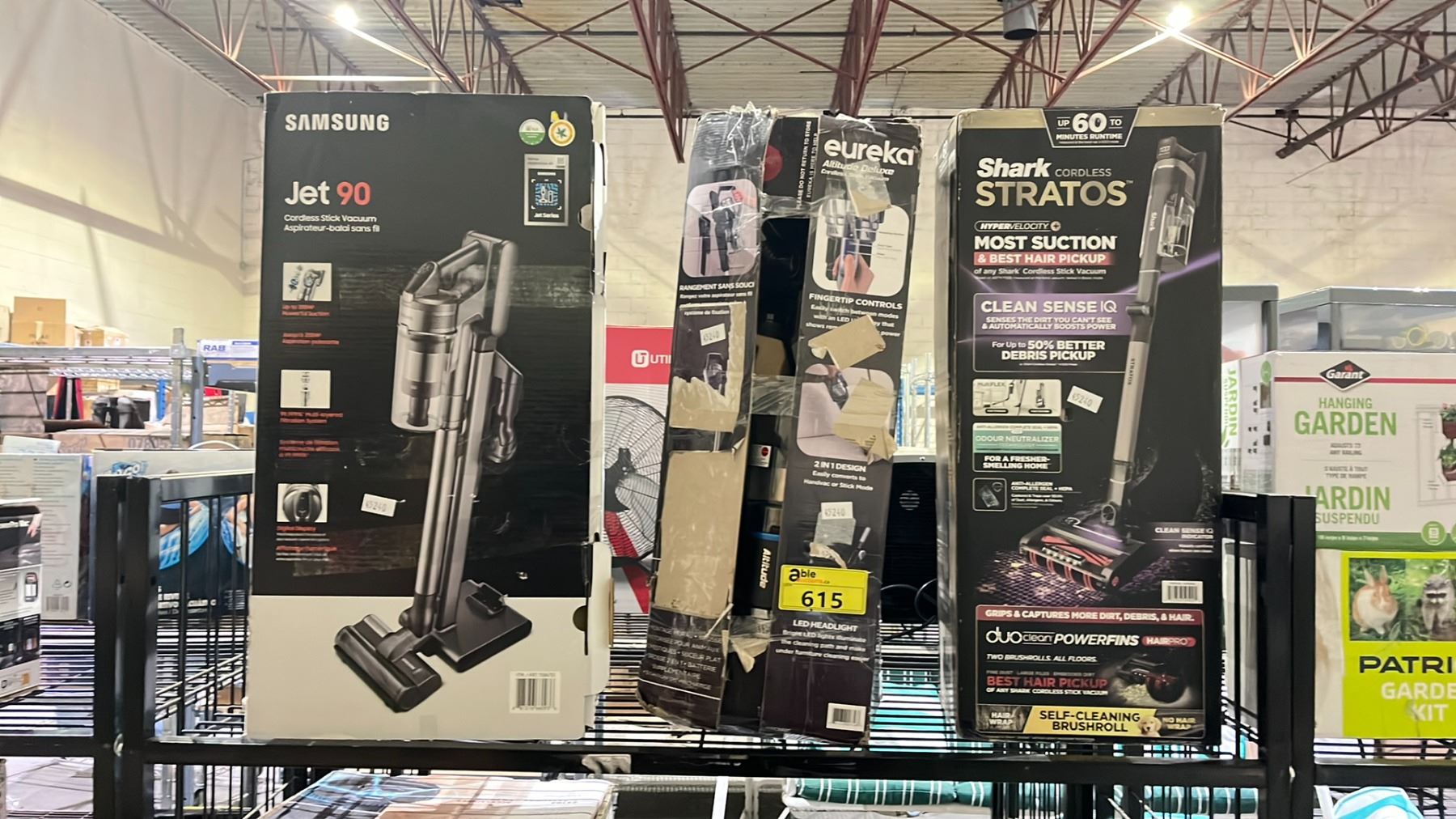 SHELF OF ASSORTED VACUUMS INCLUDING; SAMSUNG JET90, EUREKA ALTITUDE DELUXE & SHARK STRATOS CORDLESS (UNKNOWN CONDITION, MAY BE MISSING PIECES)