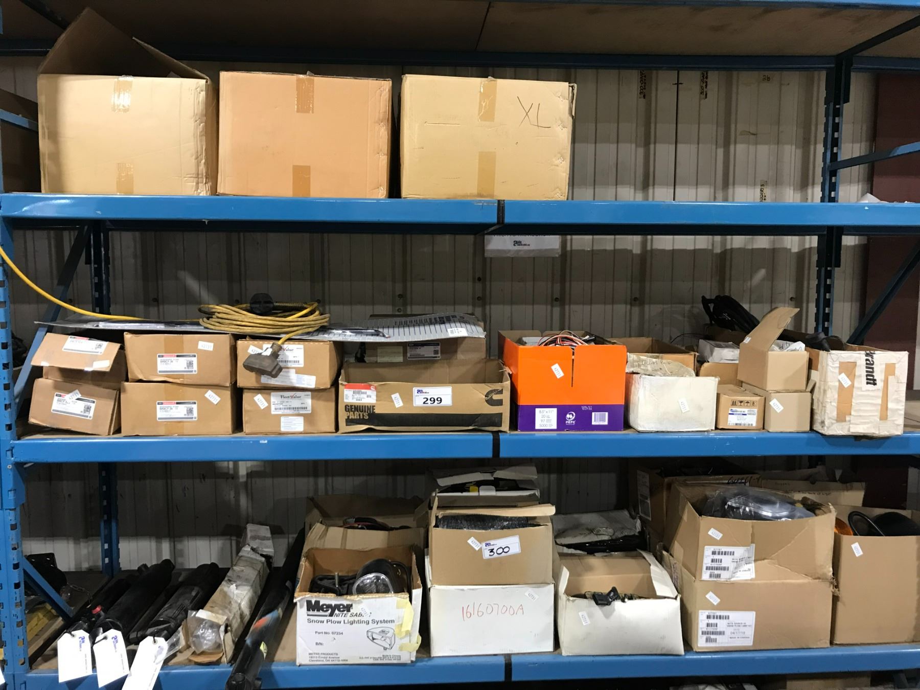 SHELF OF ASSORTED VEHICLE PARTS INCLUDING BRAKE CALIPERS, WIRES, AND VALVES