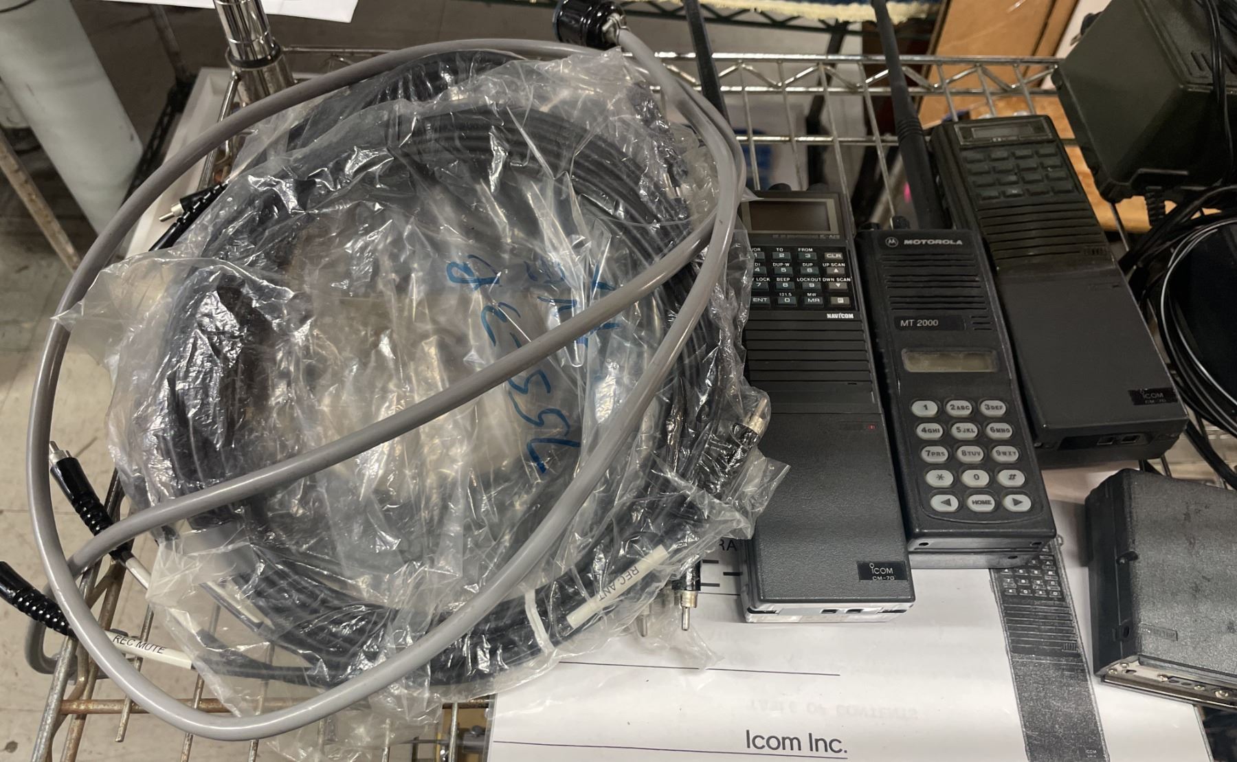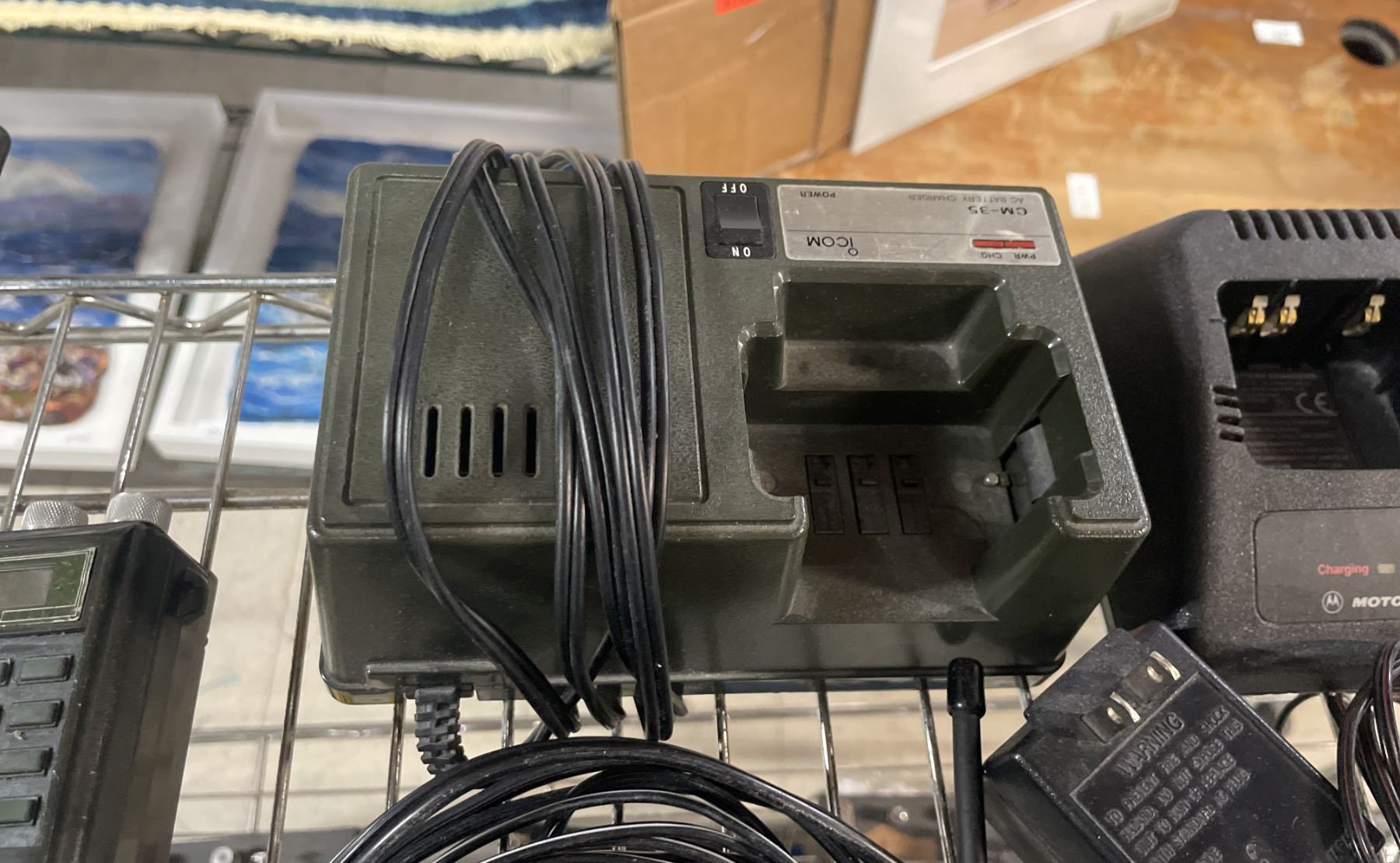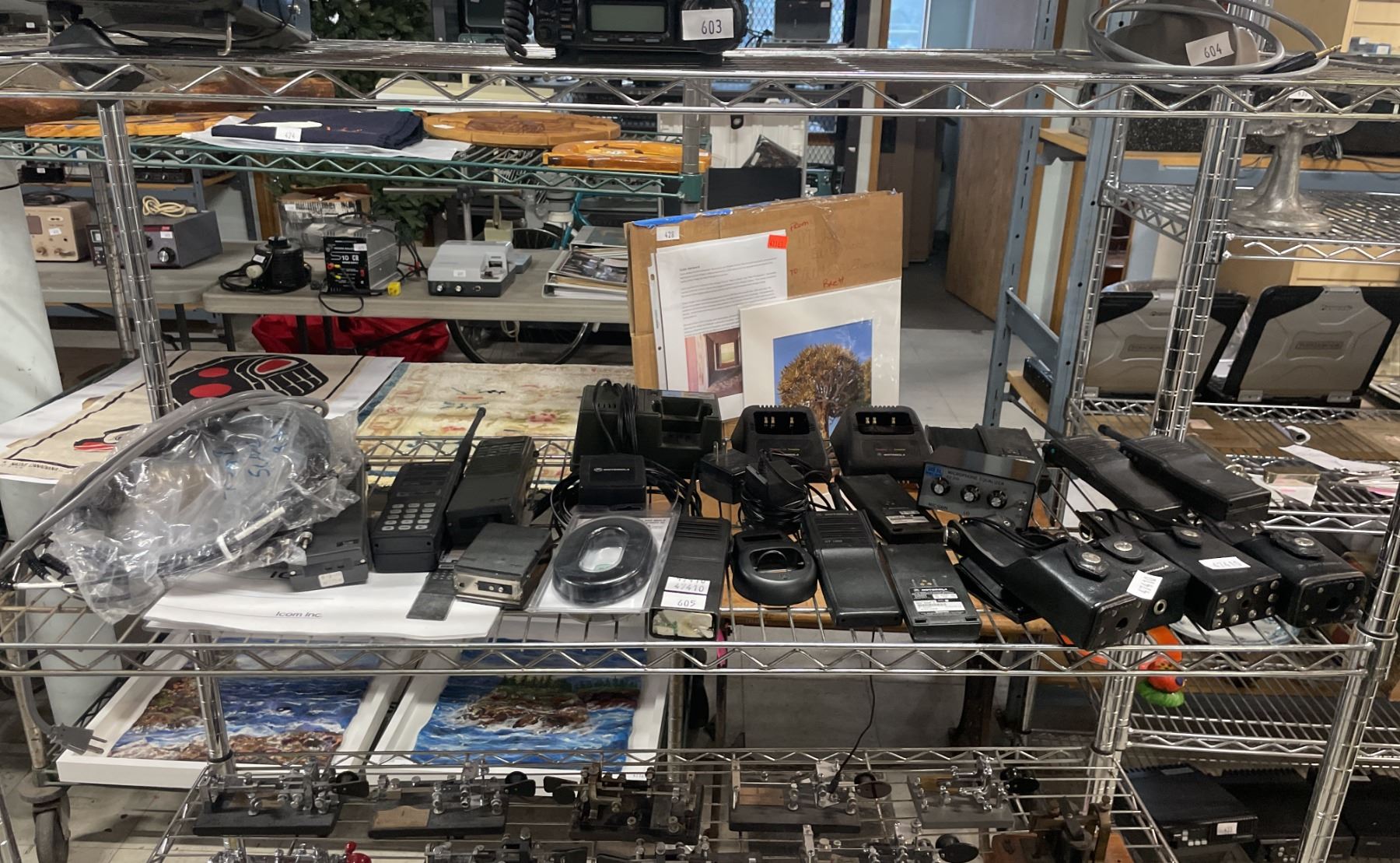 SHELF OF ASSORTED WALKIE TALKIES *SOME CHARGERS INCLUDED*