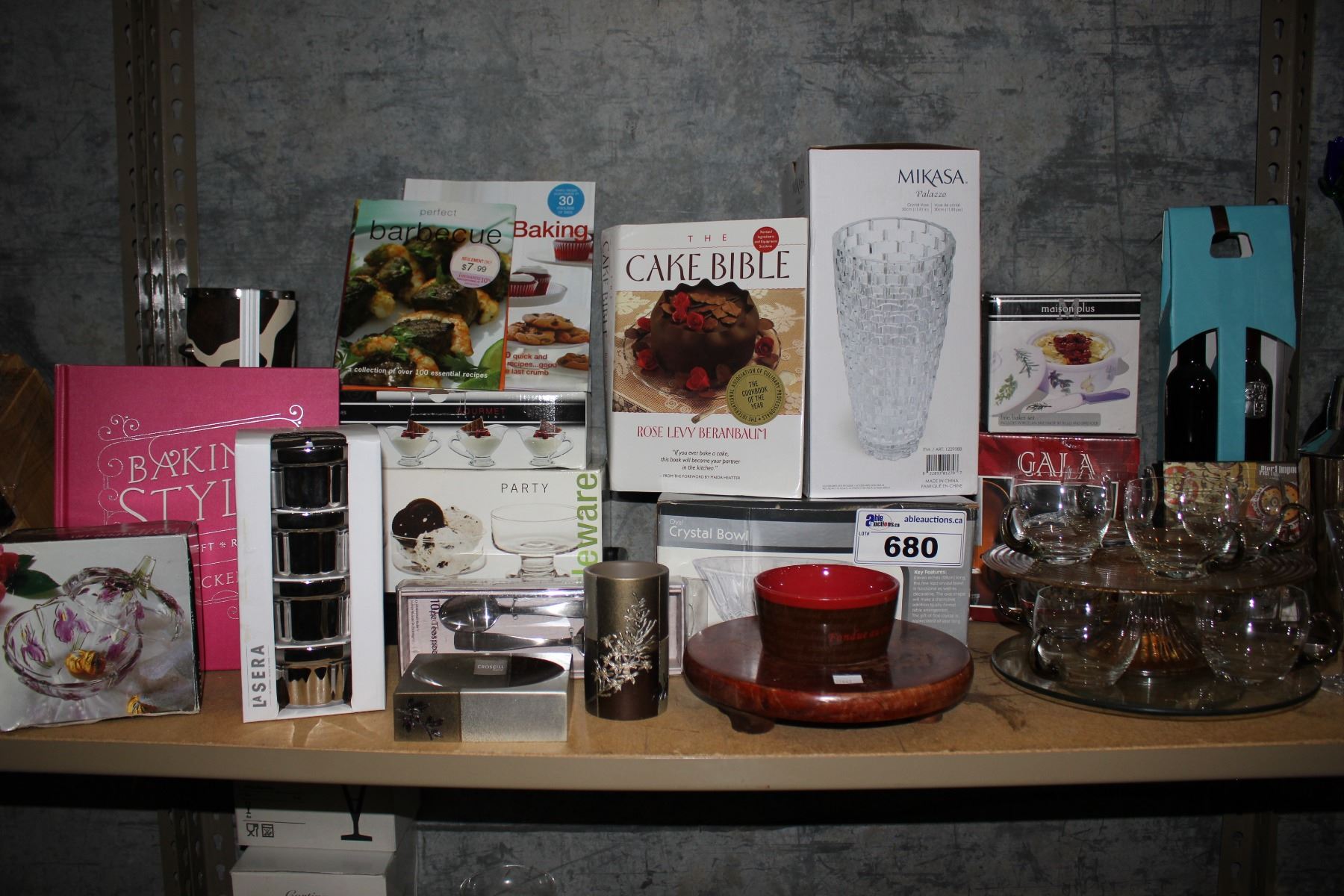 SHELF OF BAKING BOOKS, FOOD DISPLAYS AND MORE