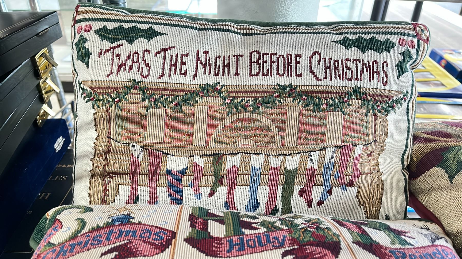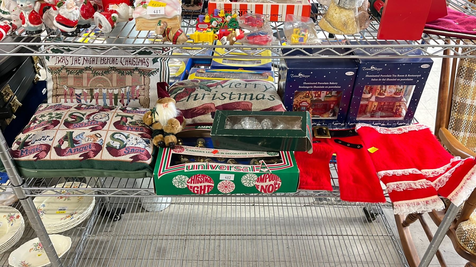 SHELF OF CHRISTMAS DECORATIONS - CHRISTMAS TREE DECORATIONS, THROW PILLOWS, ILLUMINATED CHRISTMAS STRUCTURES & MORE
