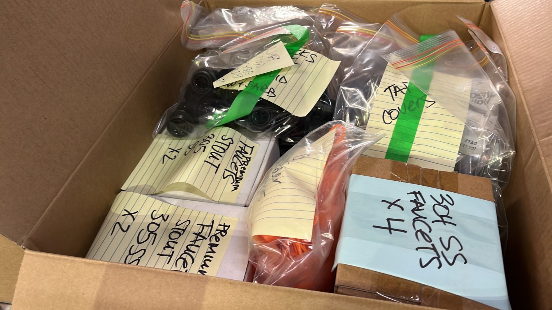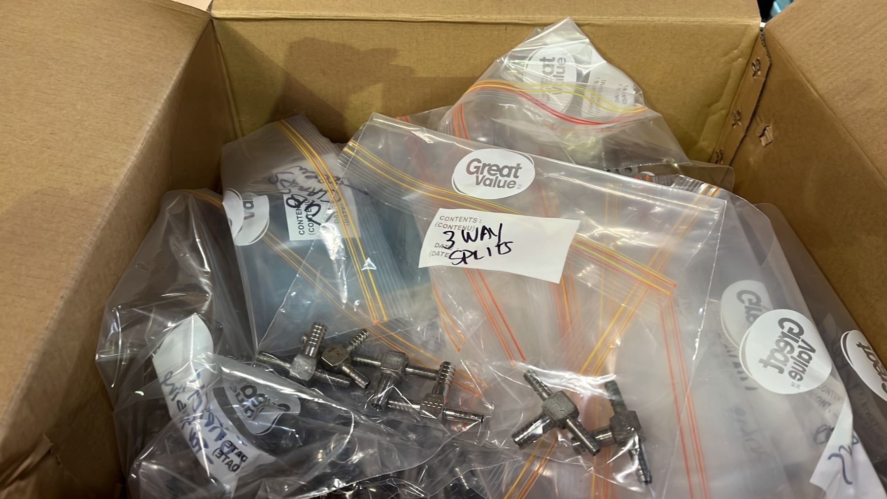 SHELF OF CO2 CAPS, BALL LOCKS, FAUCETS, GASKETS, O RING SET, TUBING PARTS + ACCESSORIES & CLAMPS