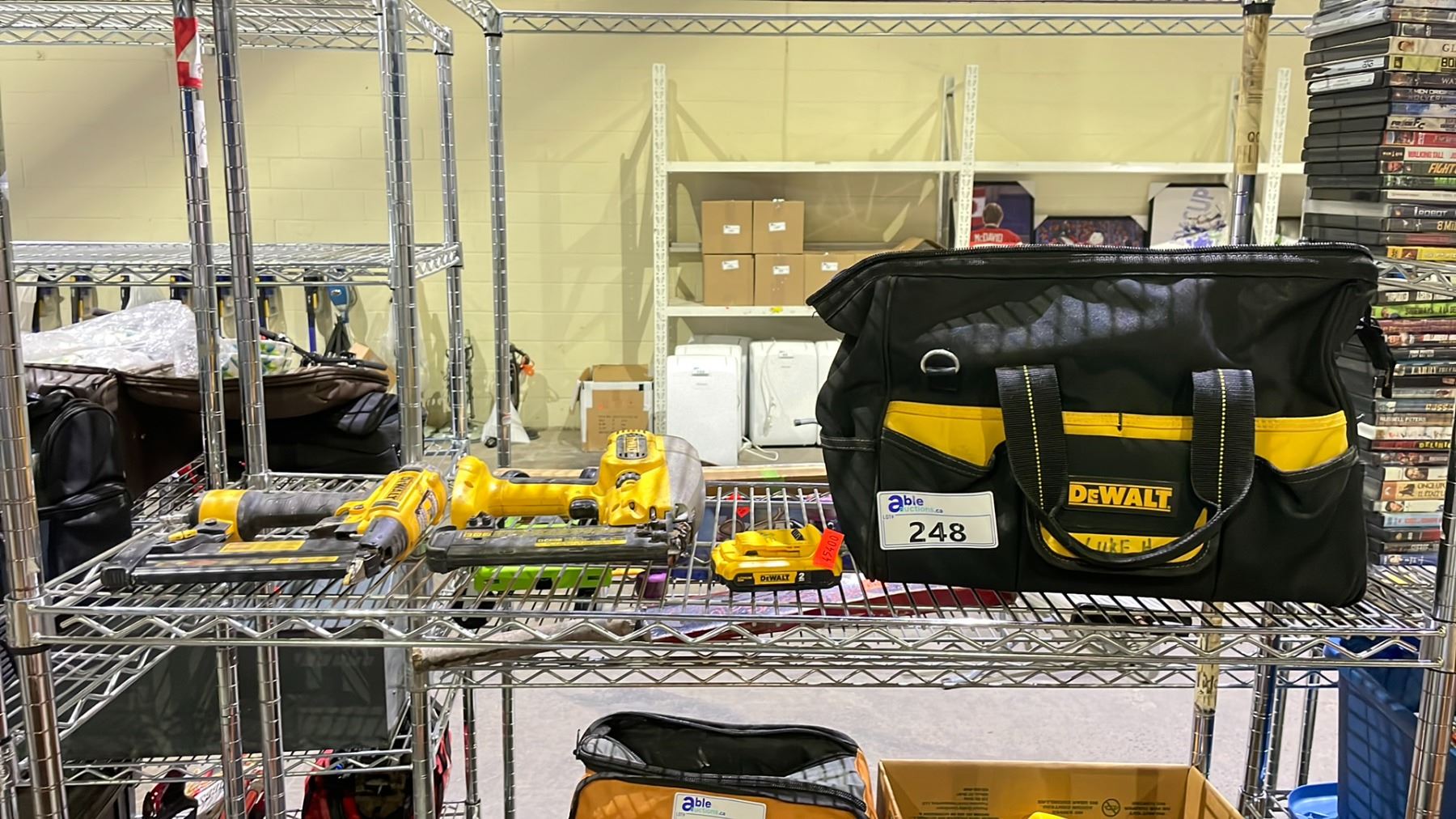 SHELF OF DEWALT TOOLS INCLUDING; 2 BRAD NAILERS, 20V BATTERY & CARRY BAG