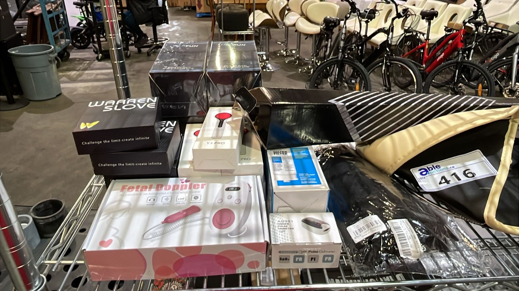 SHELF OF IPAD BAGS, FINGER PULSE OXIMETER, FETAL DOPPLER, WATER FILTER, DISH DRYING MATT & MORE