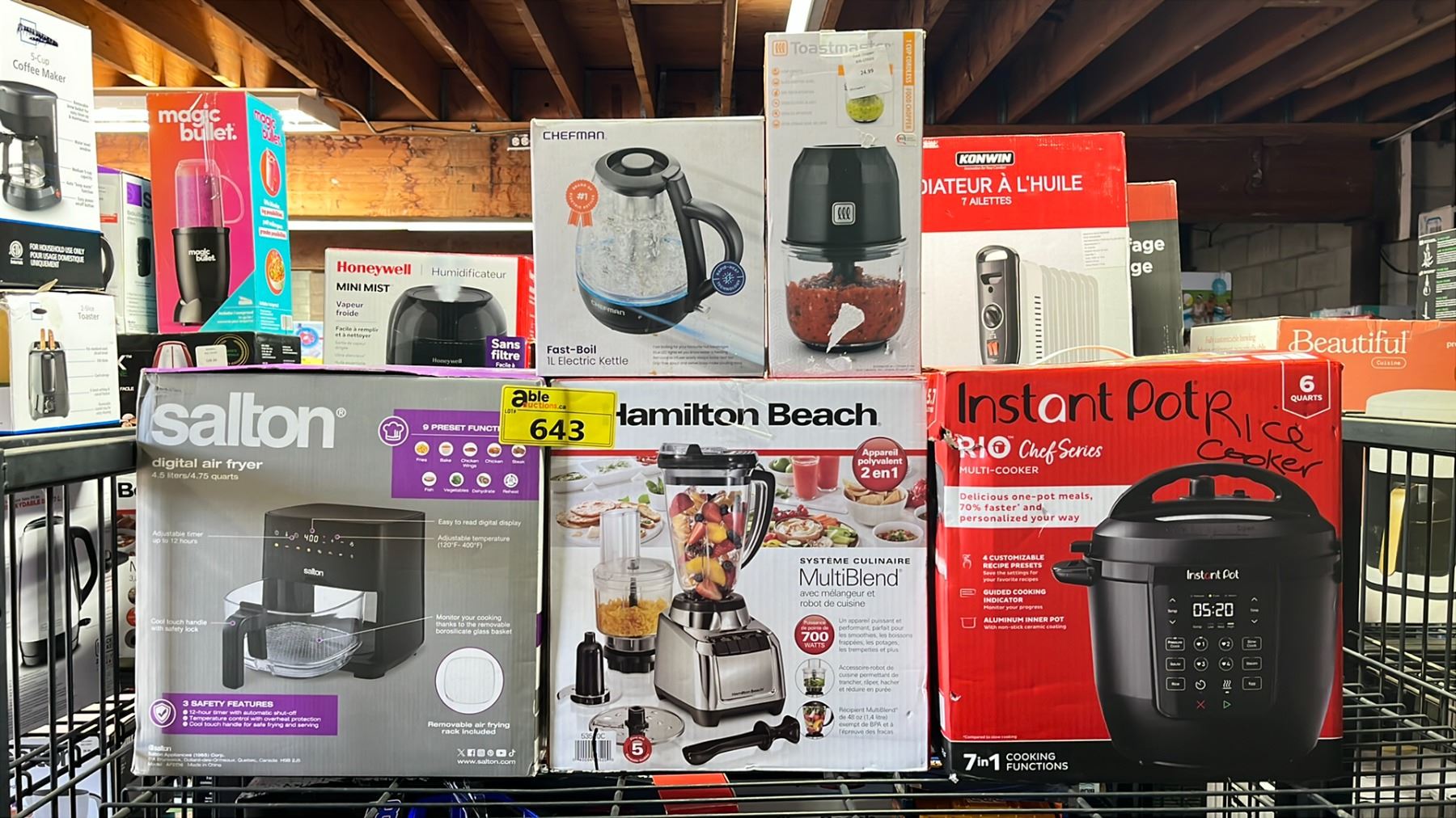 SHELF OF KITCHEN ITEMS: AIR FRYER, ELECTRIC KETTLE, FOOD CHOPPER, BLENDER & INSTANT POT