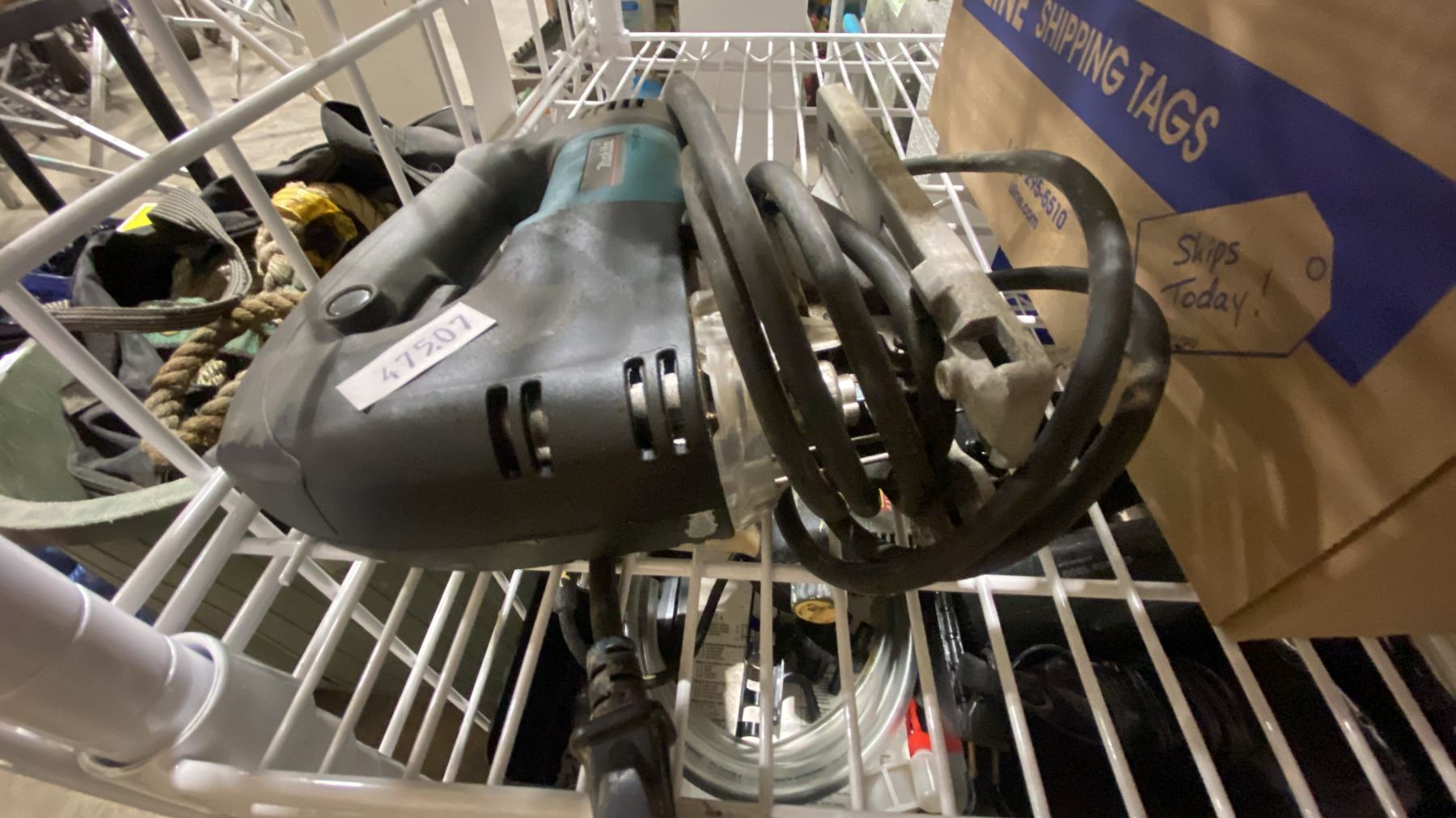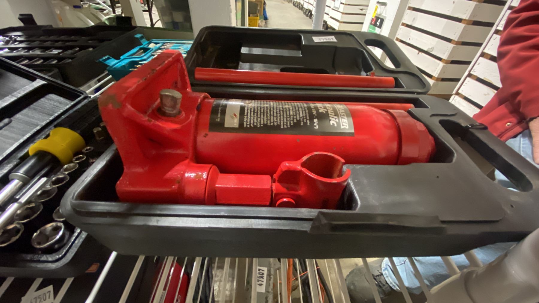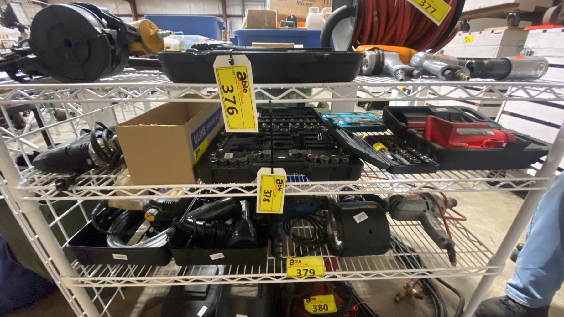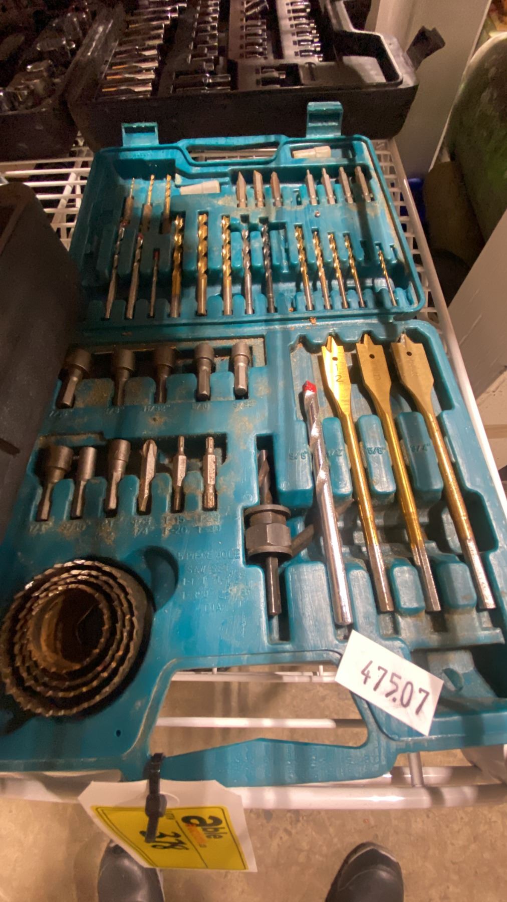 SHELF OF MAKITA ELECTRIC JIG SAW, MOTO MASTER HYDRAULIC BOTTLE JACK IN HARD TRANSPORT CASE, HARD CASE OF ASSORTED DRILL BITS, & 2 CASES OF ASSORTED SOCKETS / PCS *SHELF NOT INCLUDED*