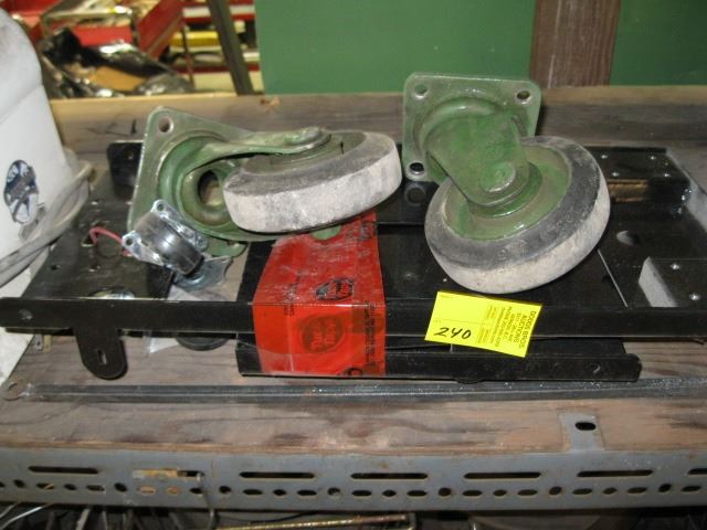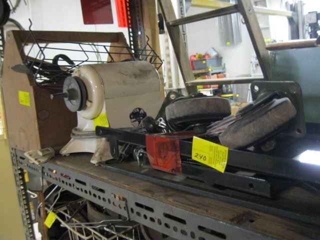 SHELF OF MISC. CHAMPION GRINDER MOTOR, CASTORS, TOTE BOX & CONTENTS