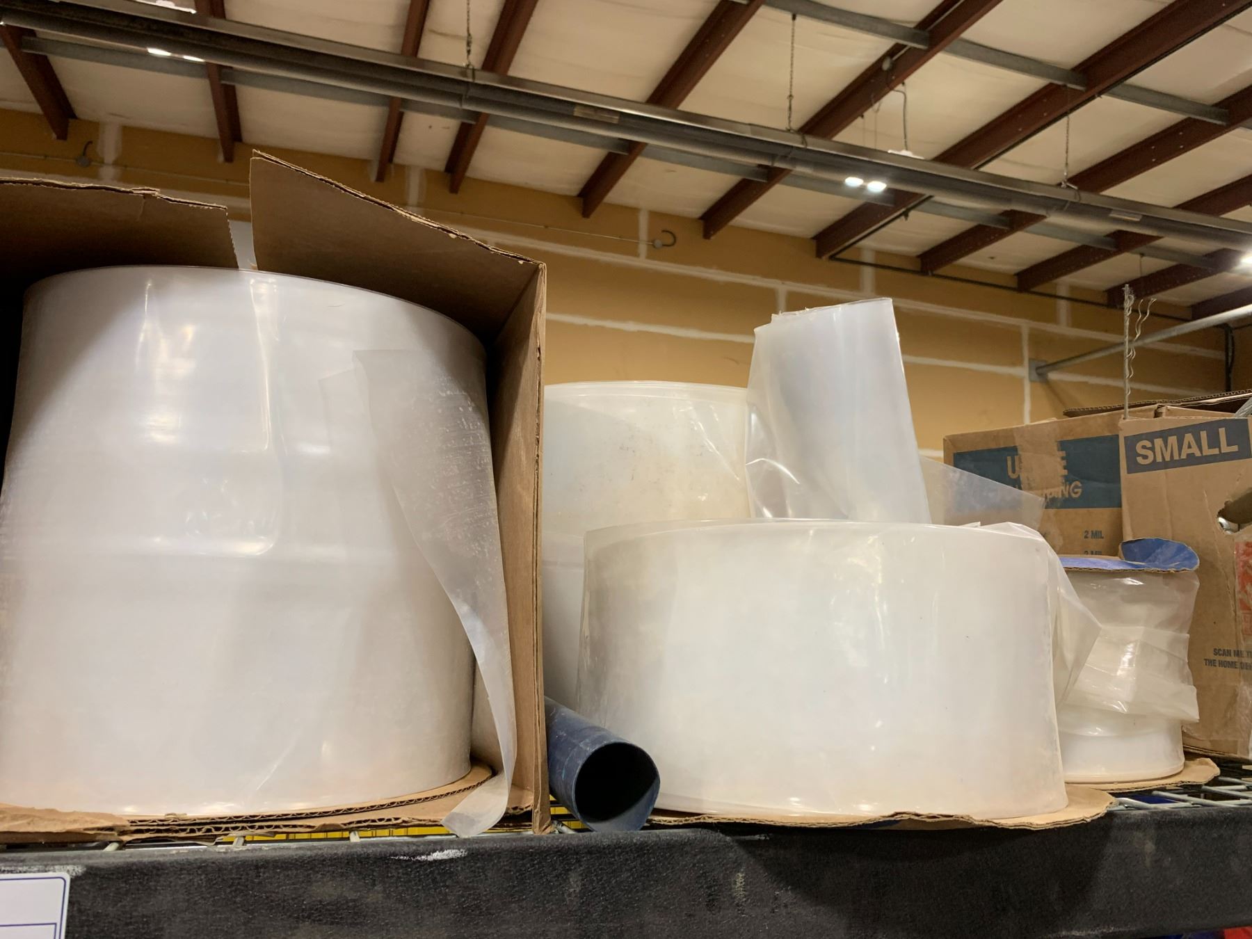 SHELF OF PLASTIC BAG ROLLS, BOX OF AIRCRAFT CABLE & BOX OF WOODWORKING PRODUCTS