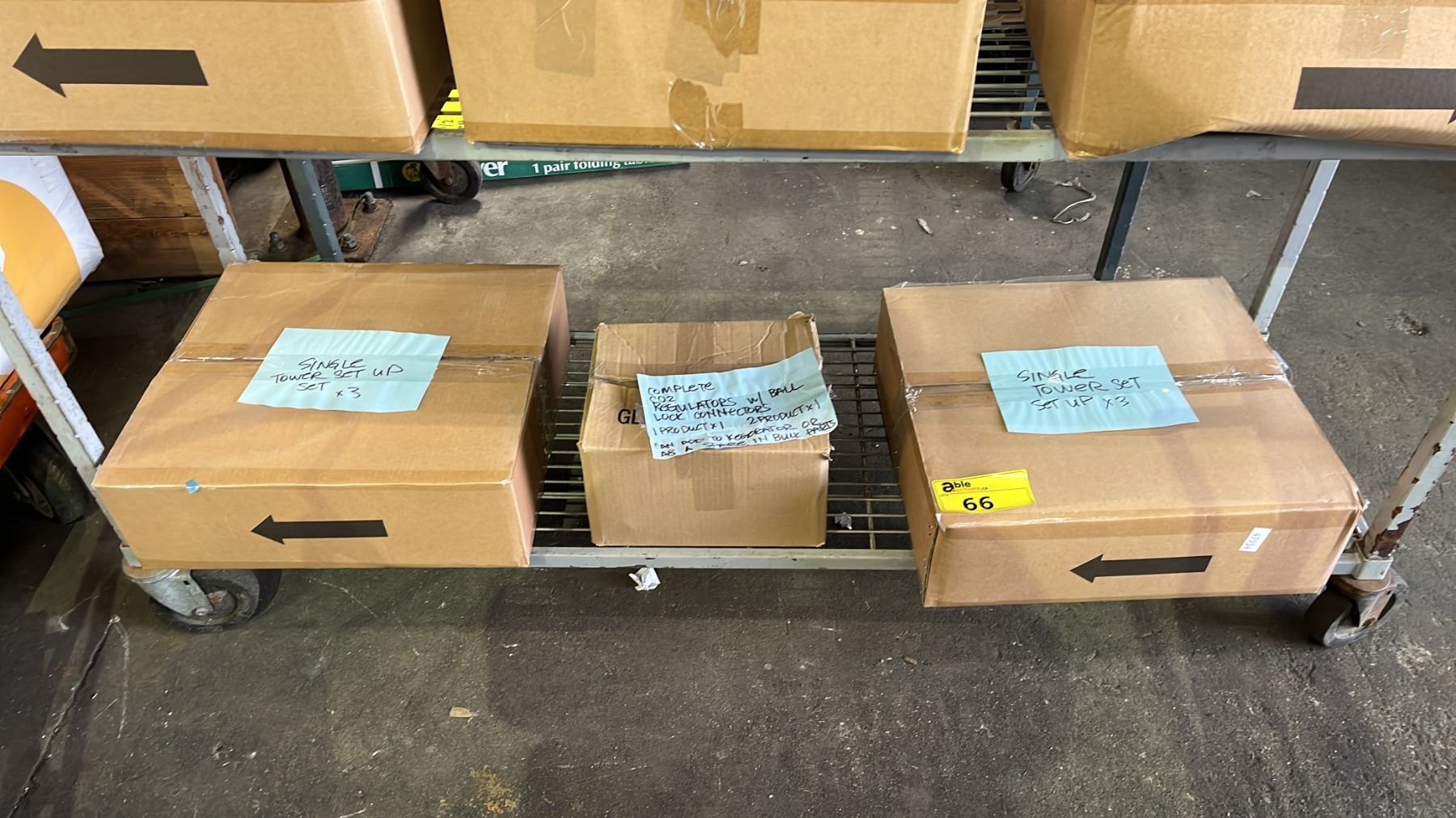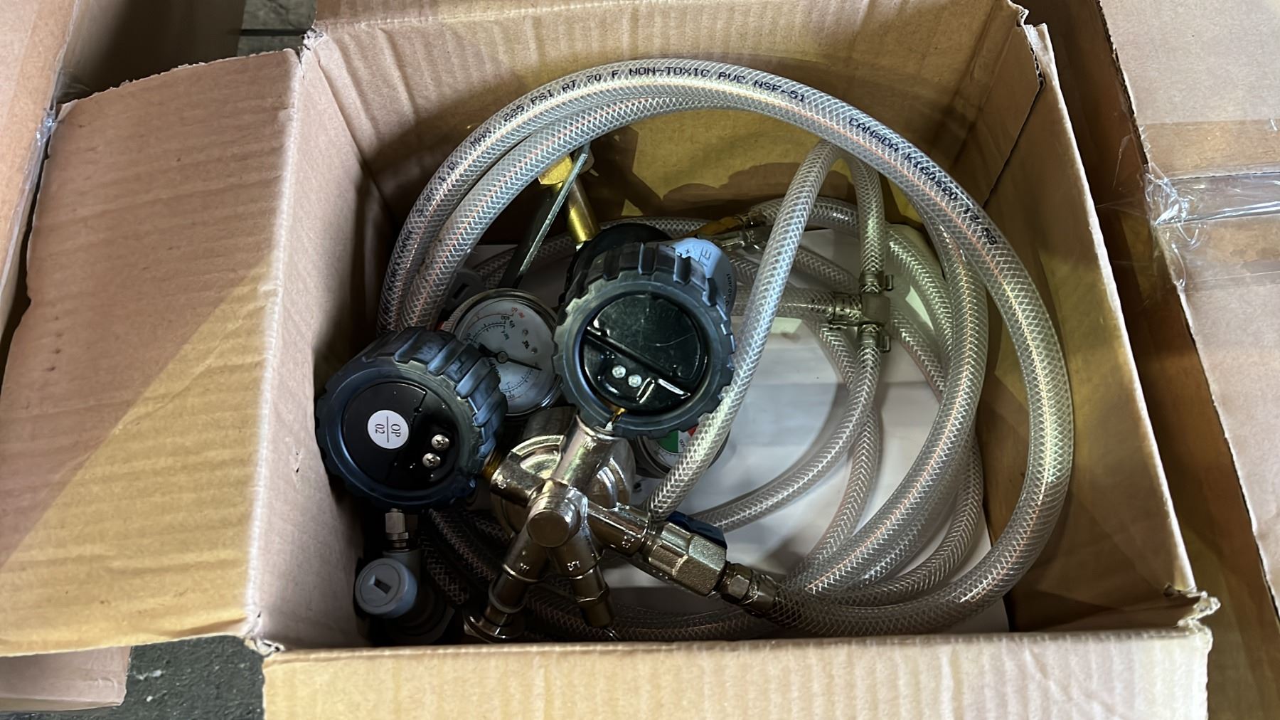SHELF OF SINGLE TOWER SETUPS, CO2 REGULATORS WITH BALL LOCK CONNECTORS FOR KEGERATORS