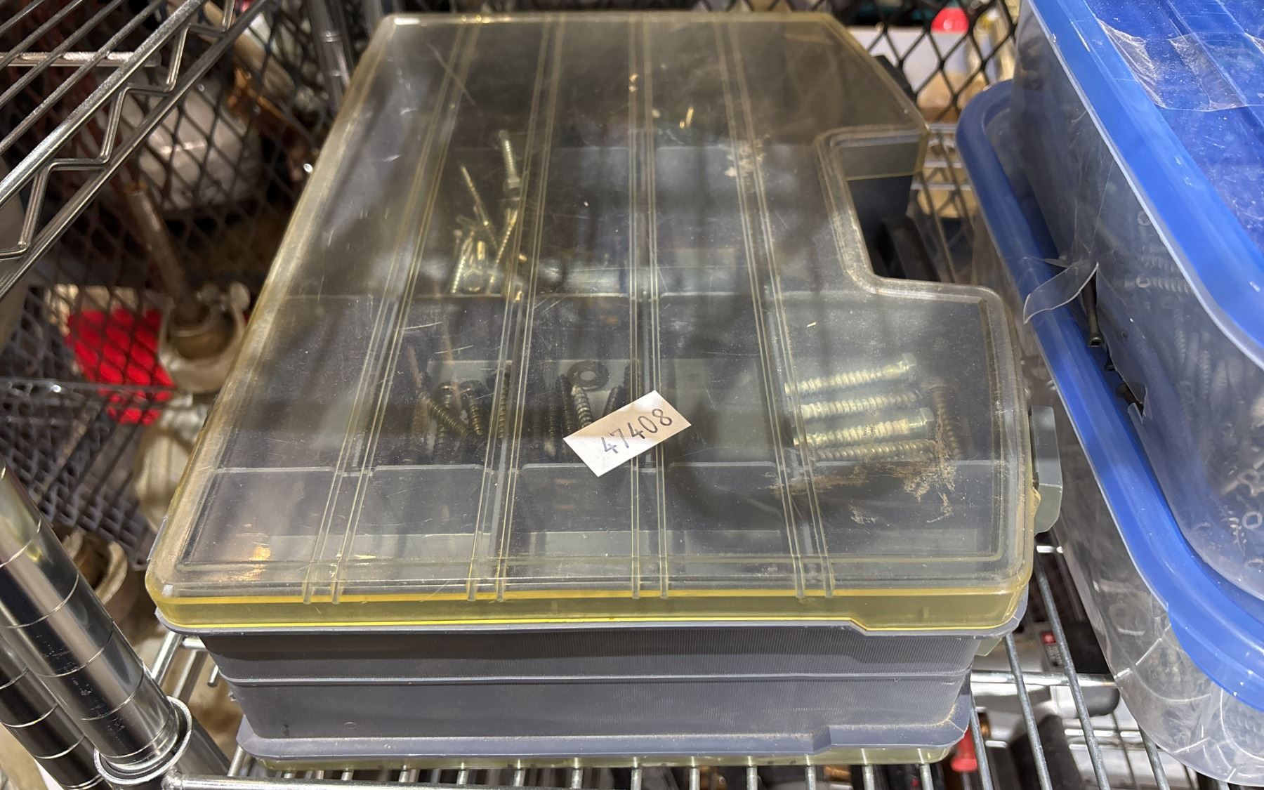 SHELF OF SMALL PARTS ORGANIZERS WITH ASSORTED SCREWS