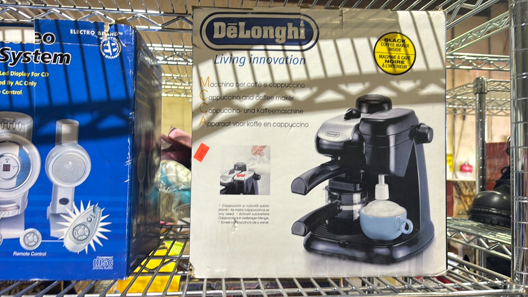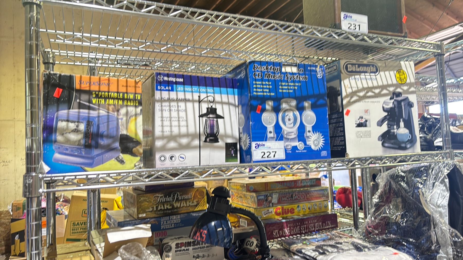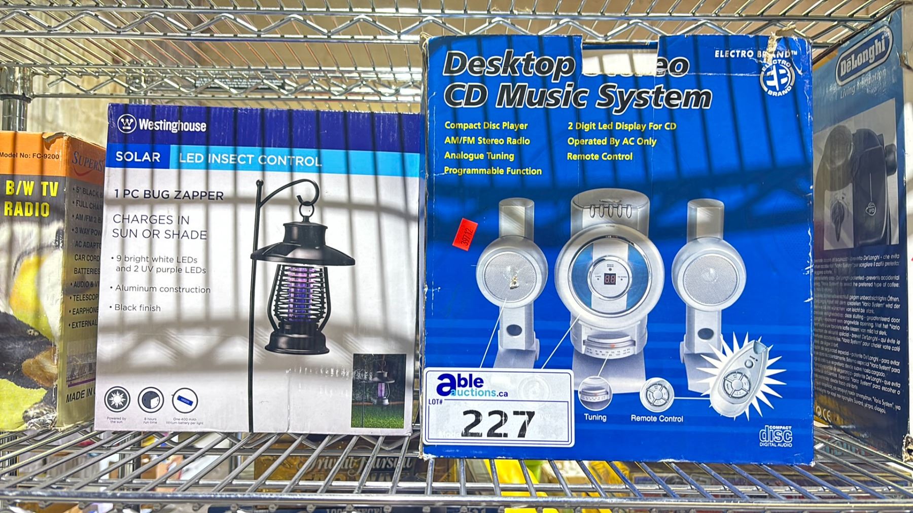 SHELF OF SOLAR BUG ZAPPER, DELONGHI CAPPUCCINO & COFFEE MAKER, 5" PORTABLE B/W TV RADIO, DESKTOP CD MUSIC SYSTEM