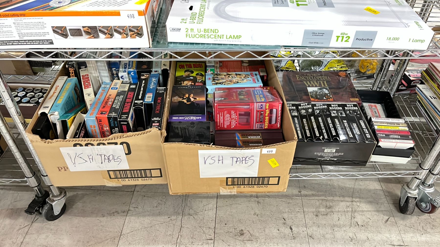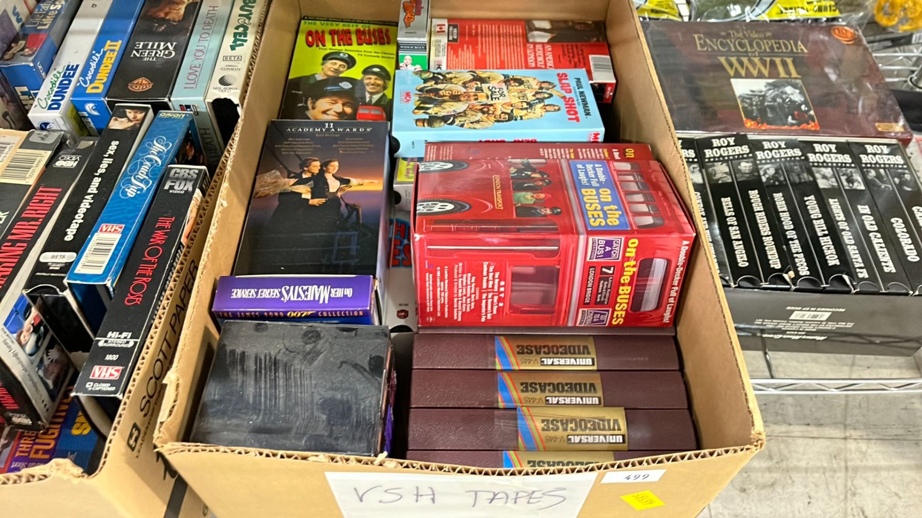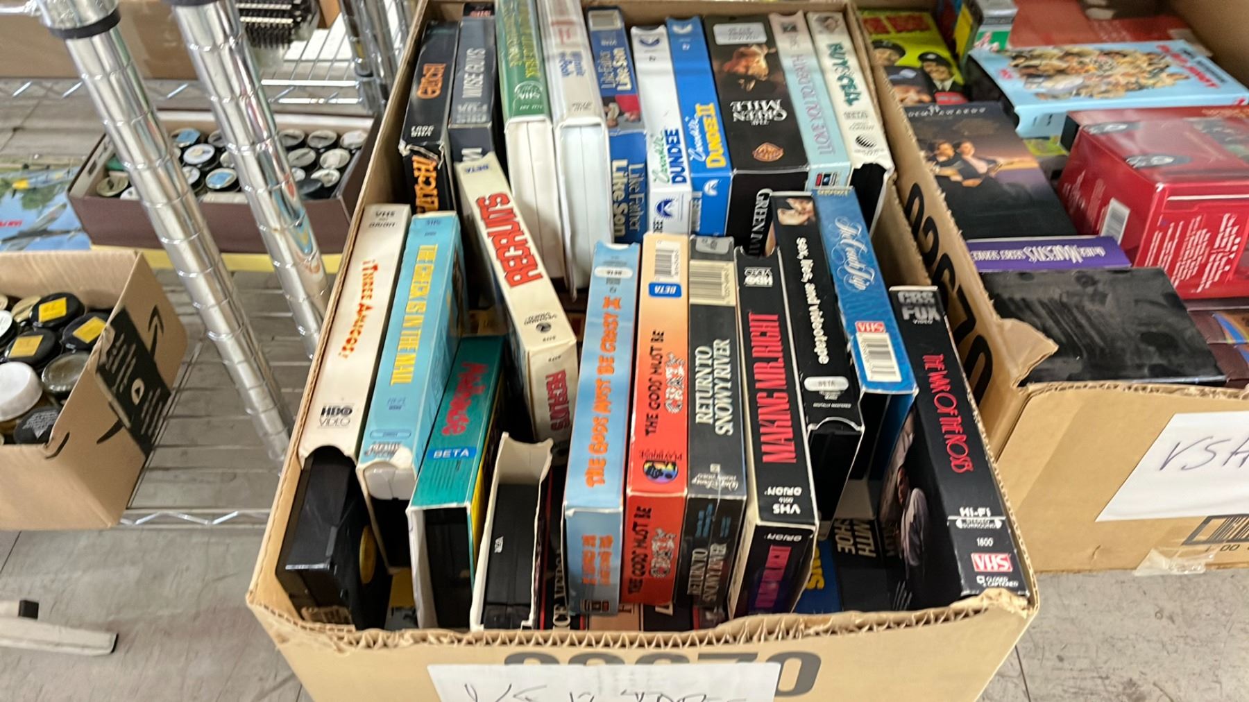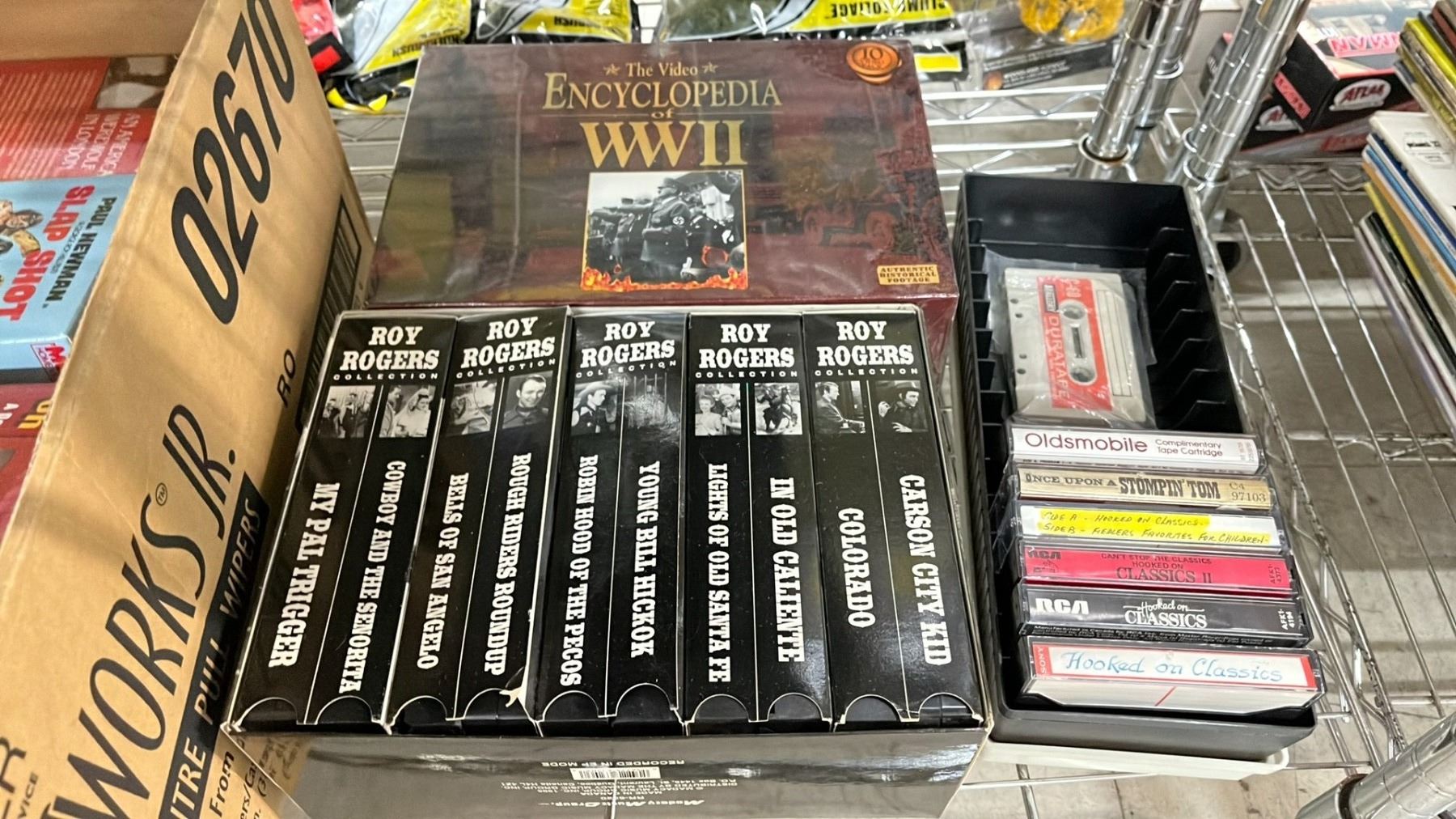 SHELF OF TAPE CASSETTES & VHS'S