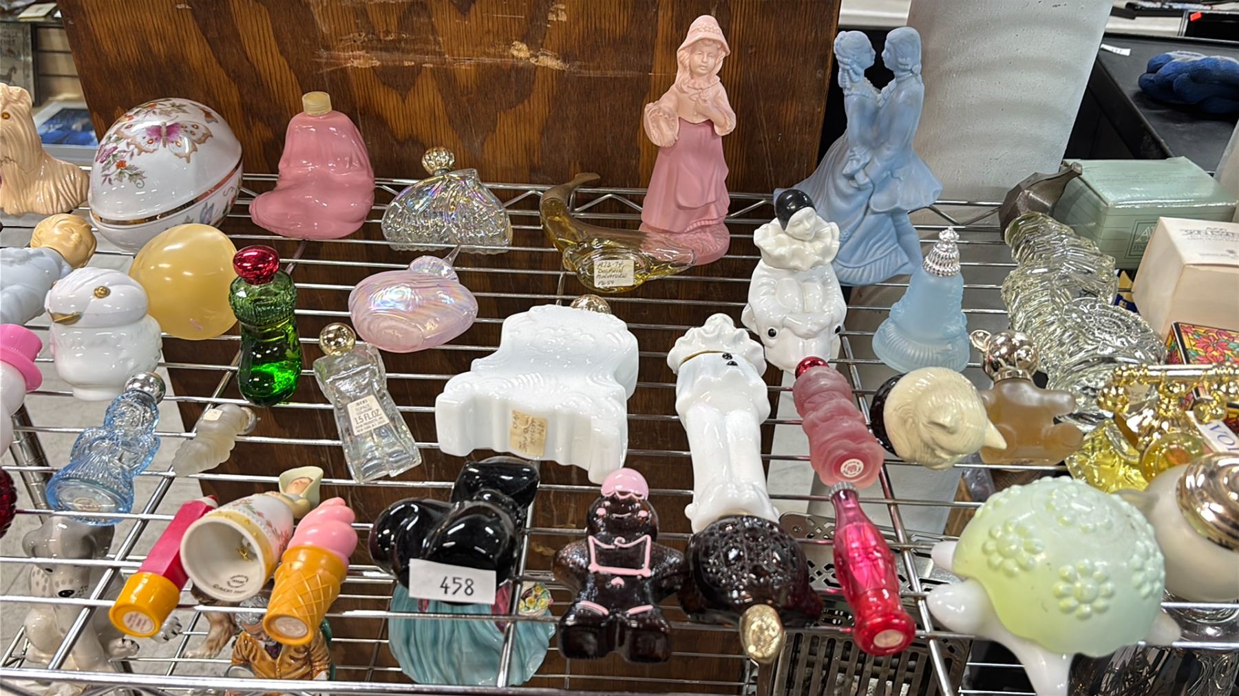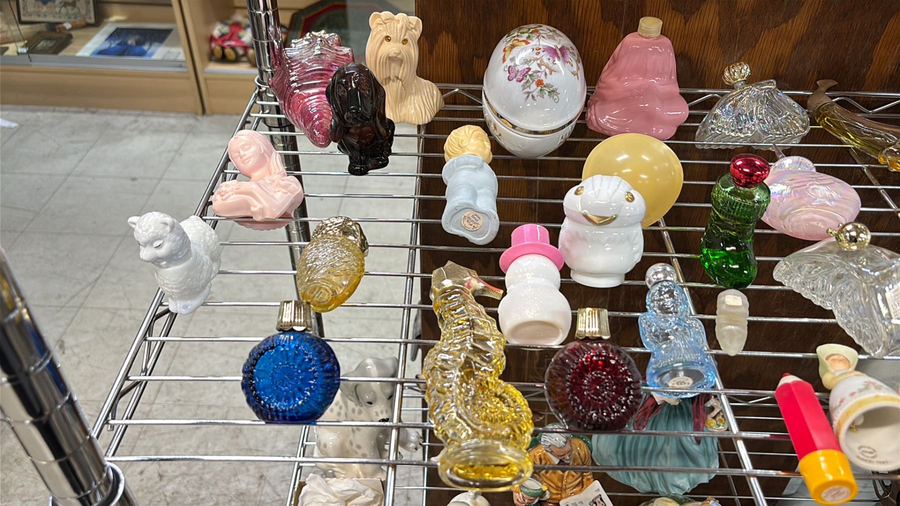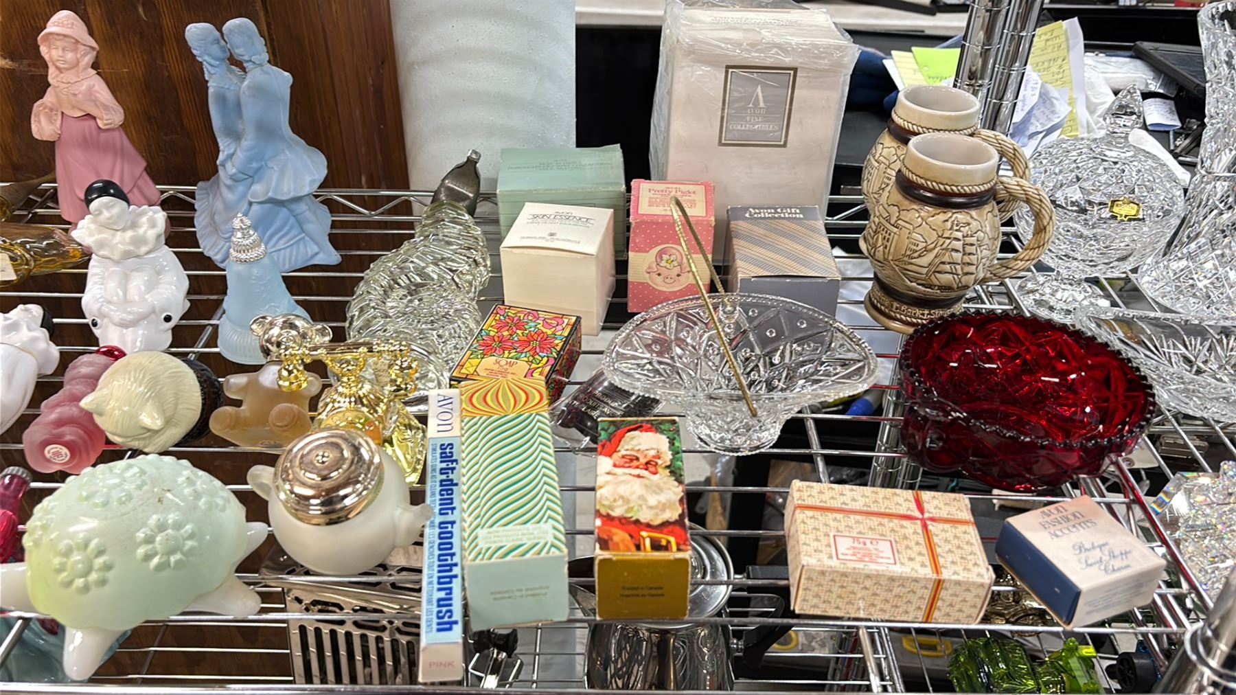 SHELF OF VARIOUS AVON PERFUME/COLOGNE BOTTLES