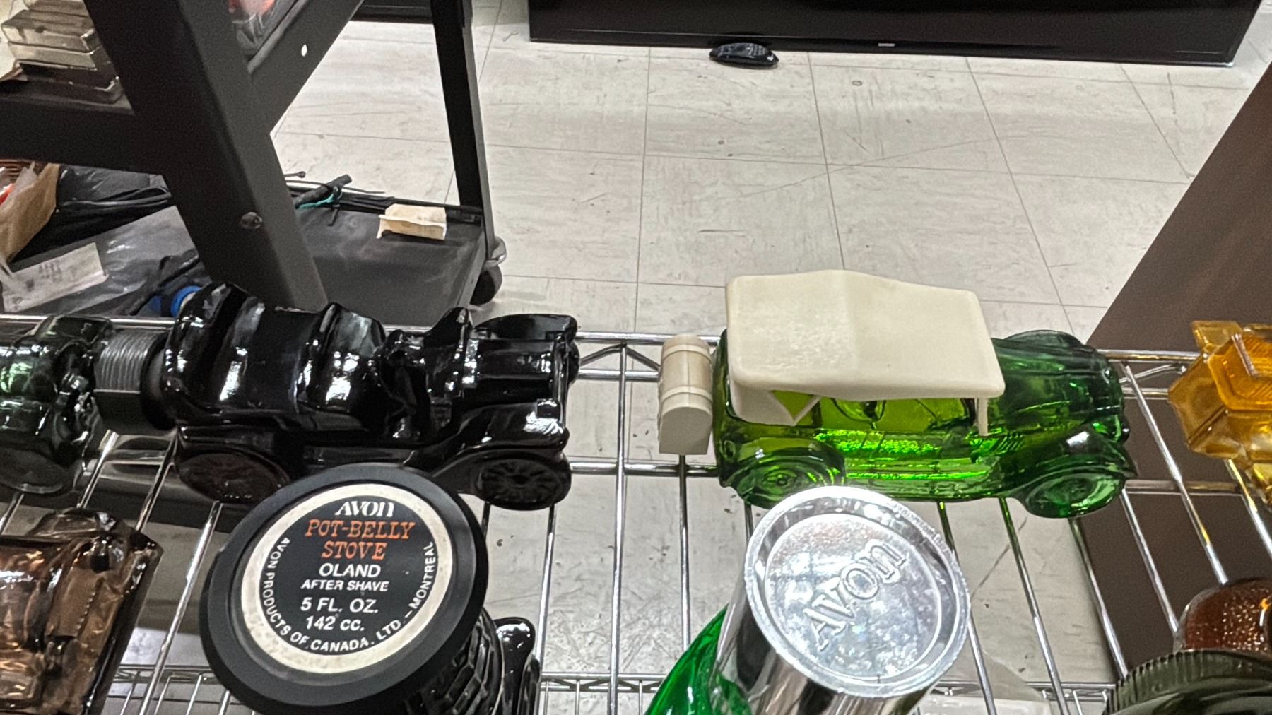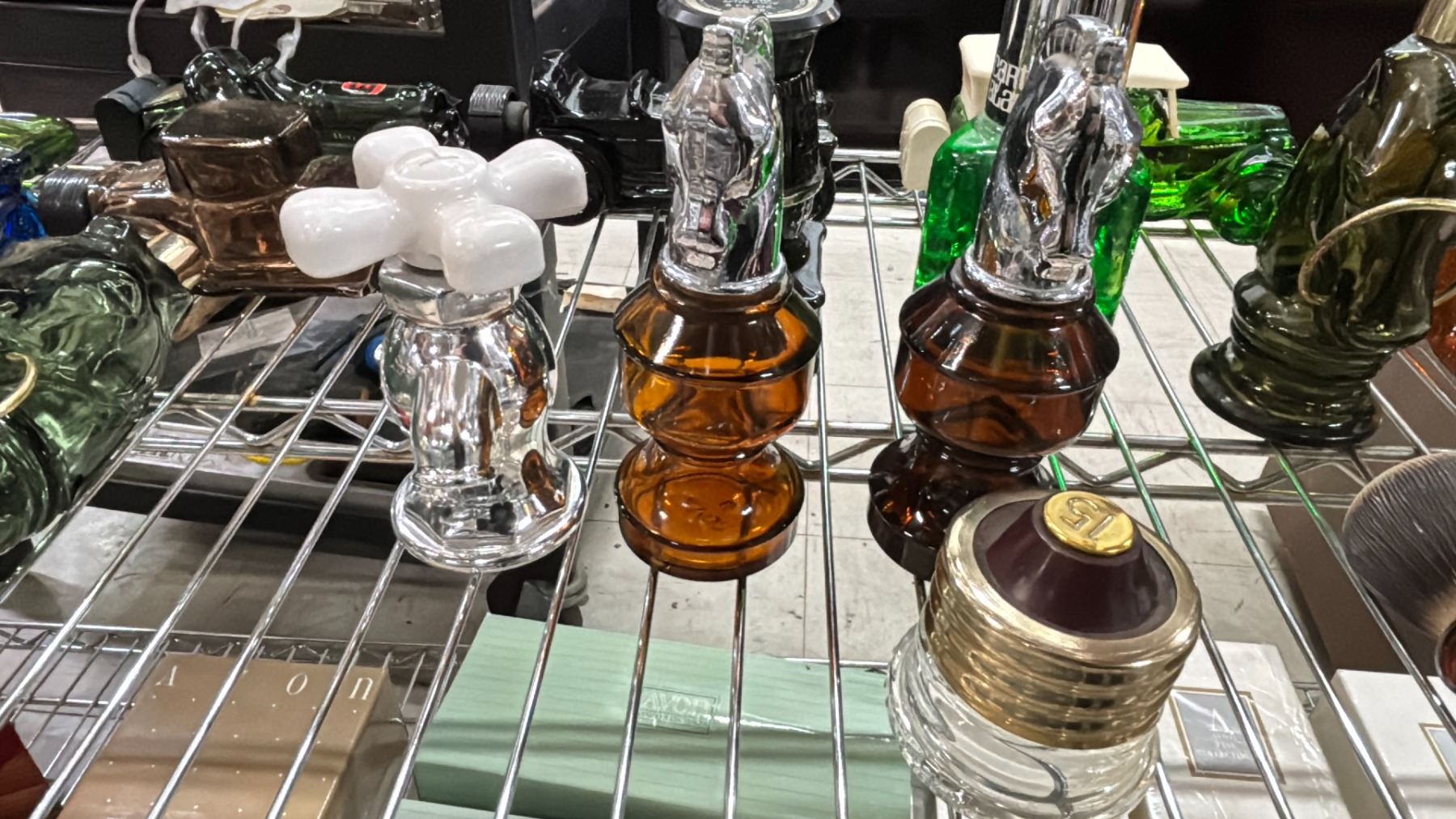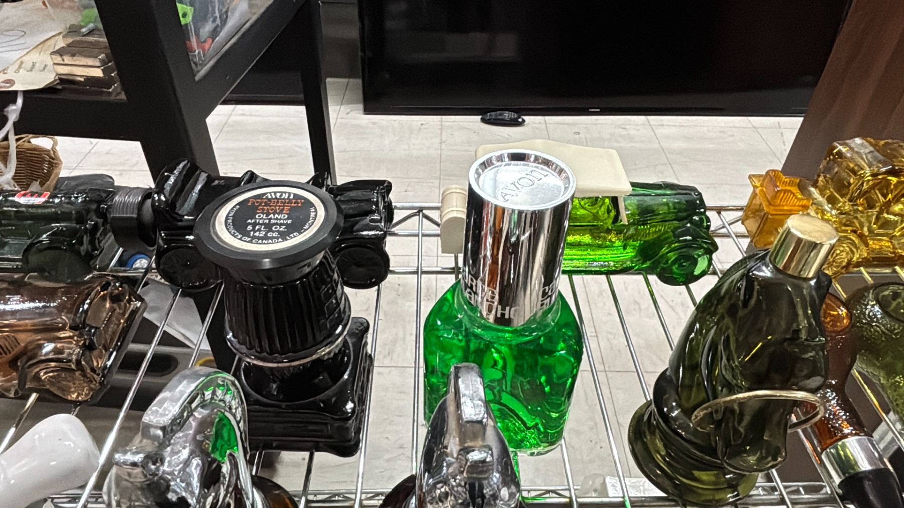 SHELF OF VARIOUS AVON PERFUME/COLOGNE BOTTLES