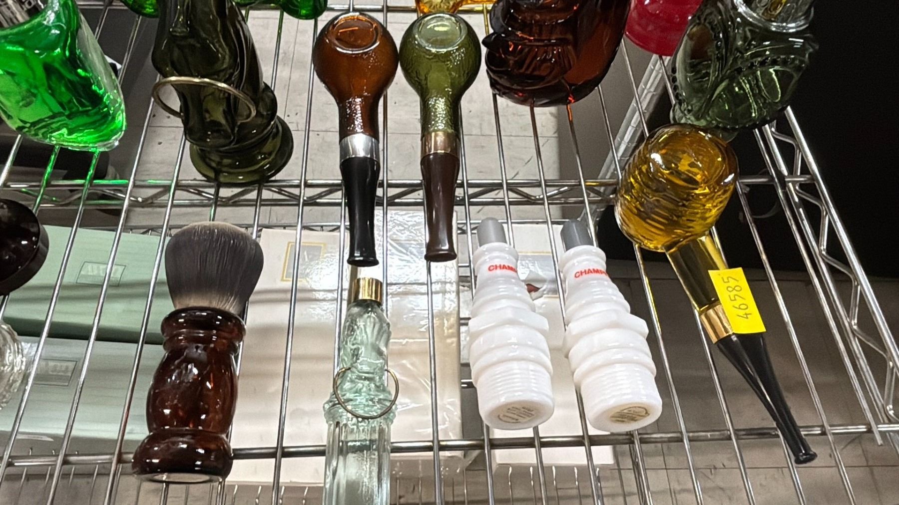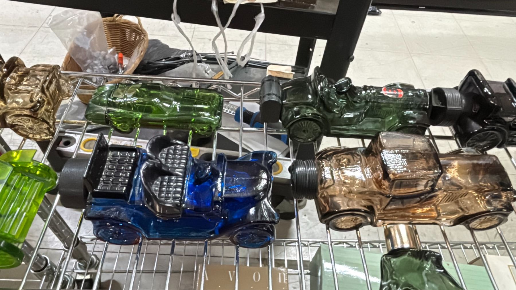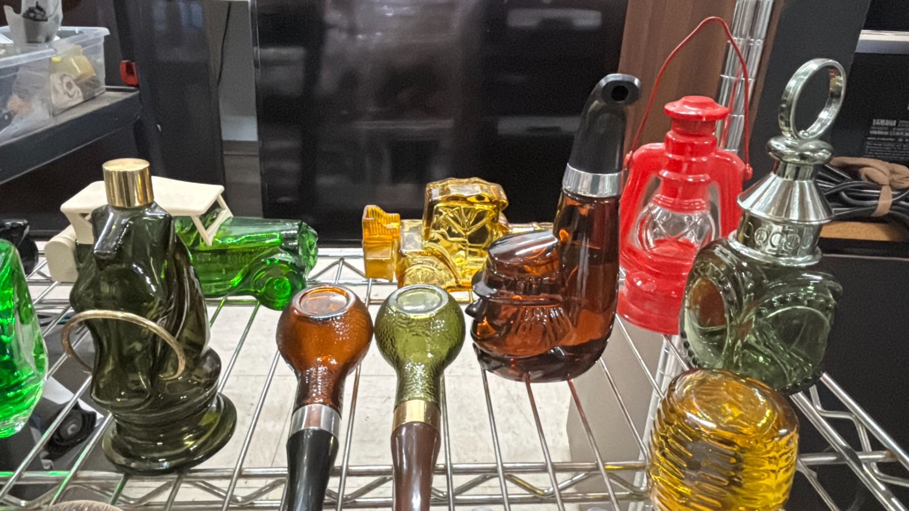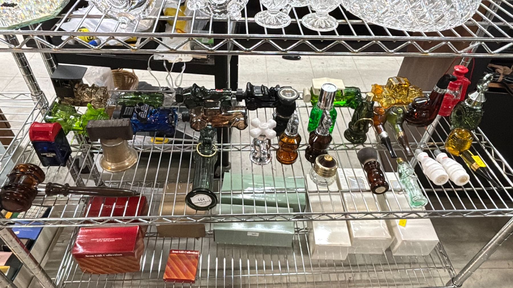 SHELF OF VARIOUS AVON PERFUME/COLOGNE BOTTLES
