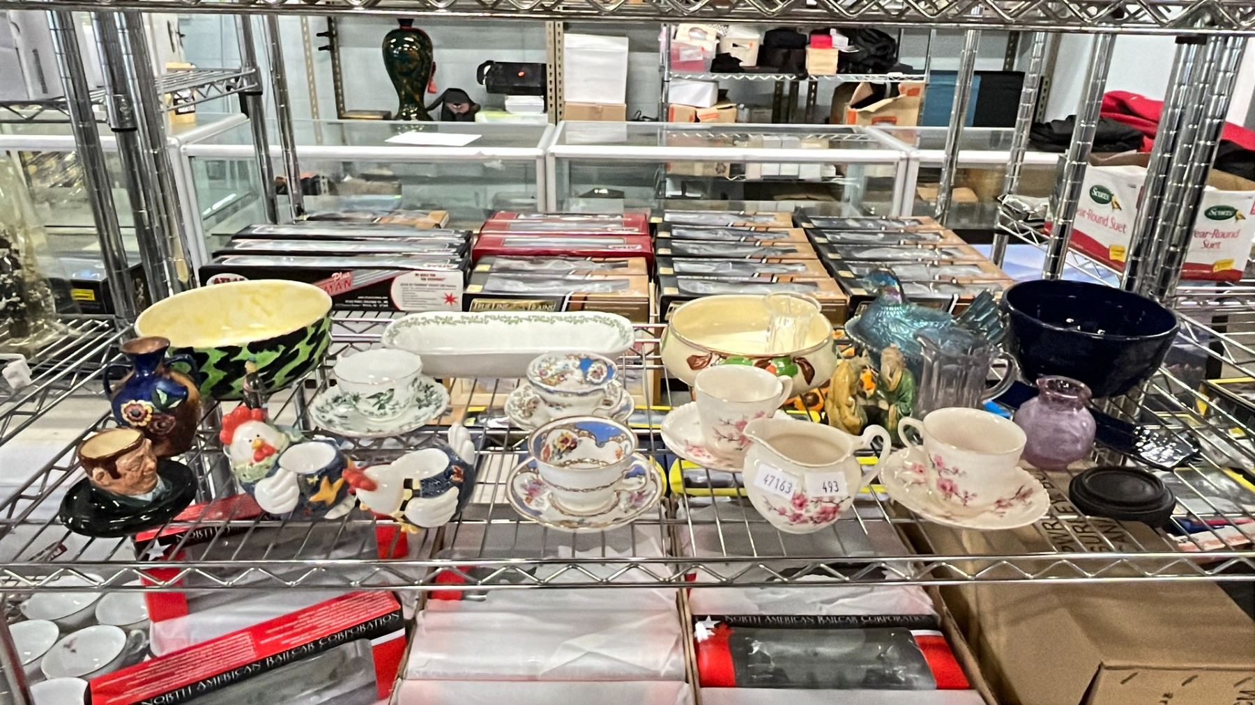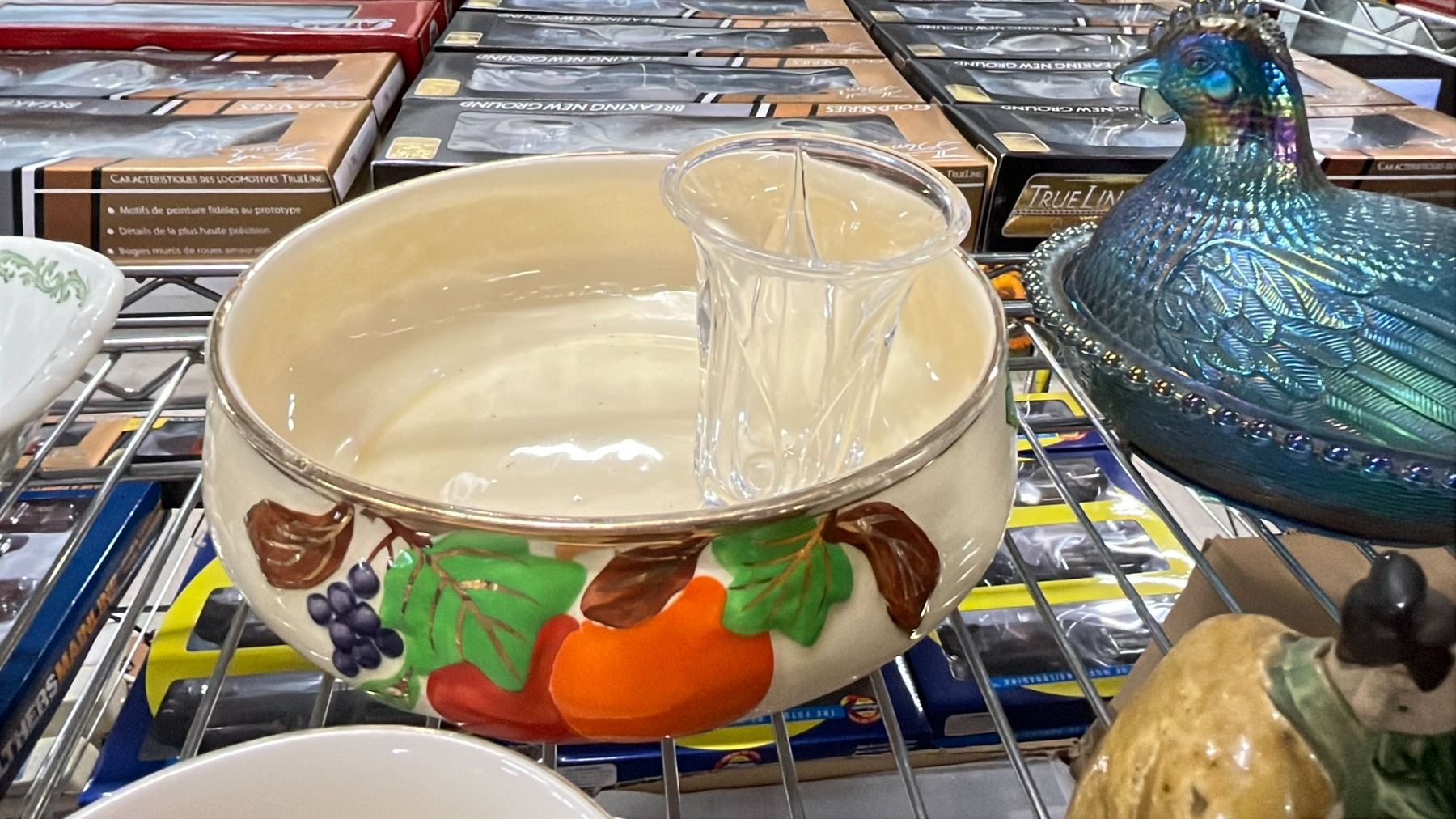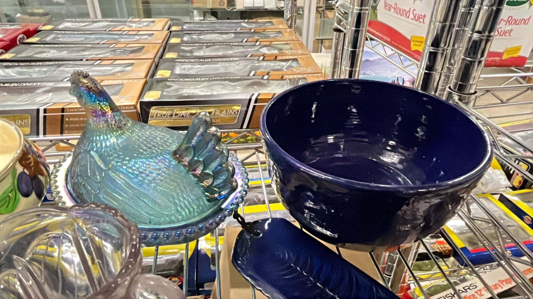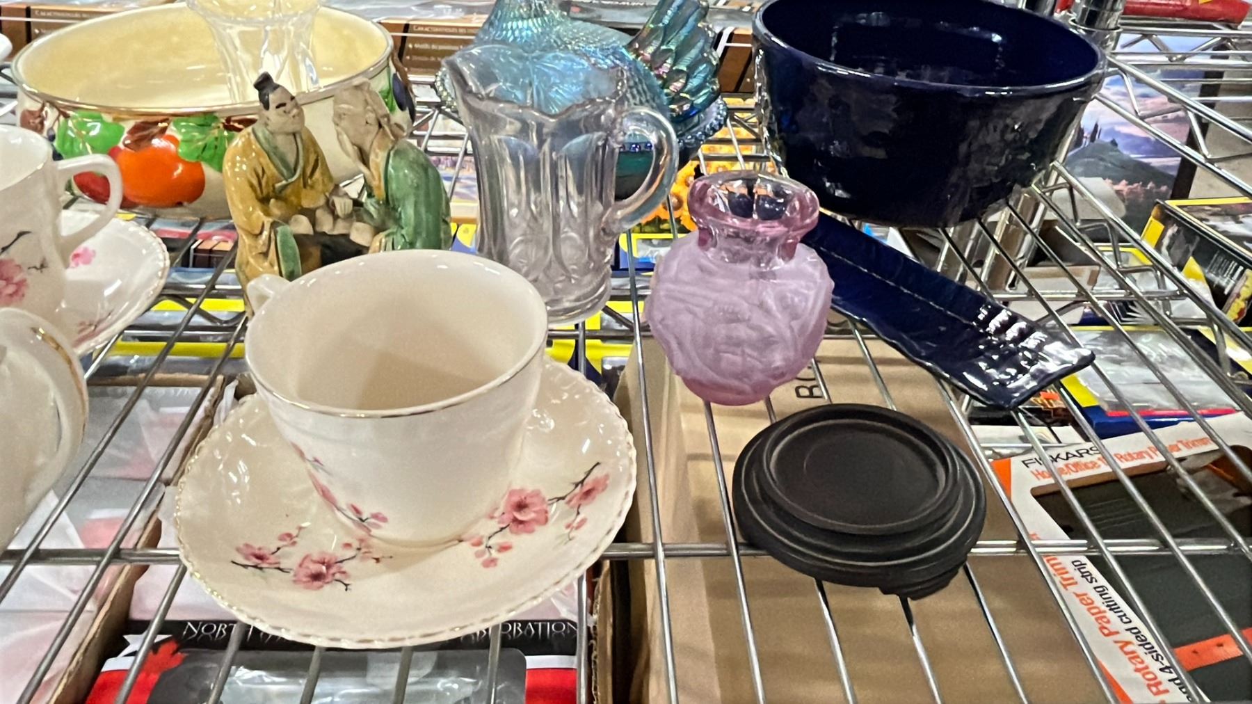 SHELF OF VARIOUS CHINA, CARNIVAL GLASS HEN & MORE
