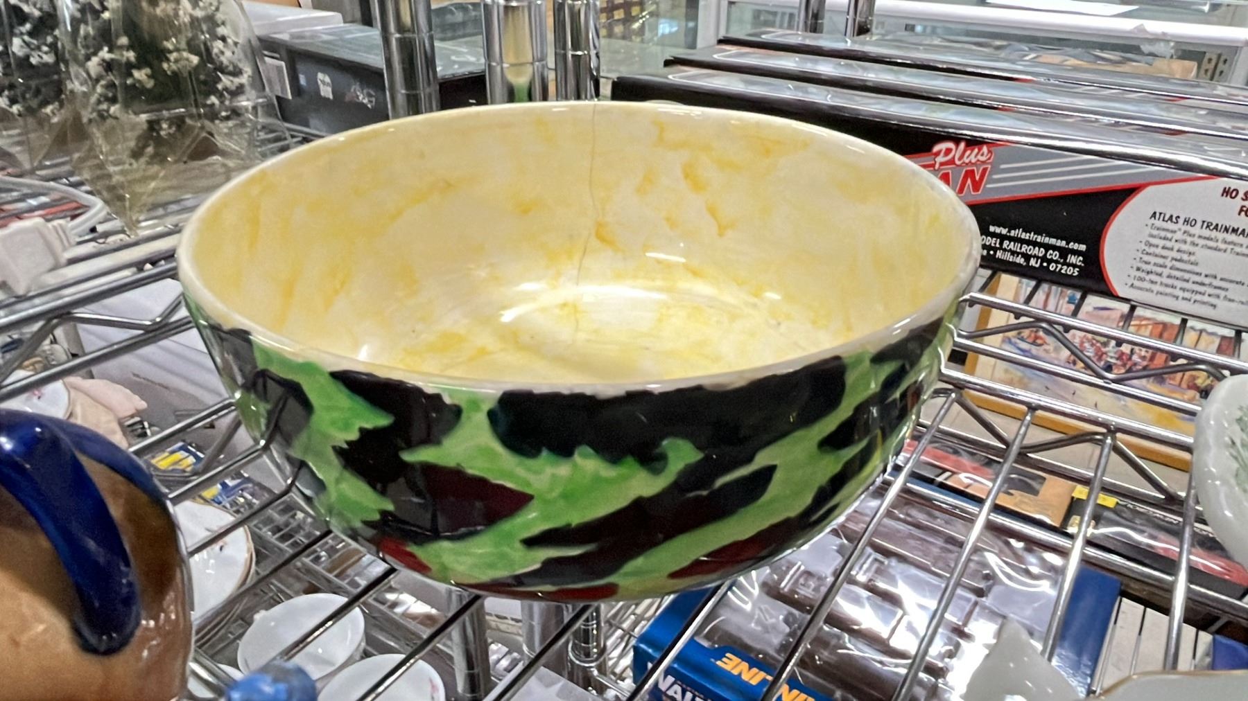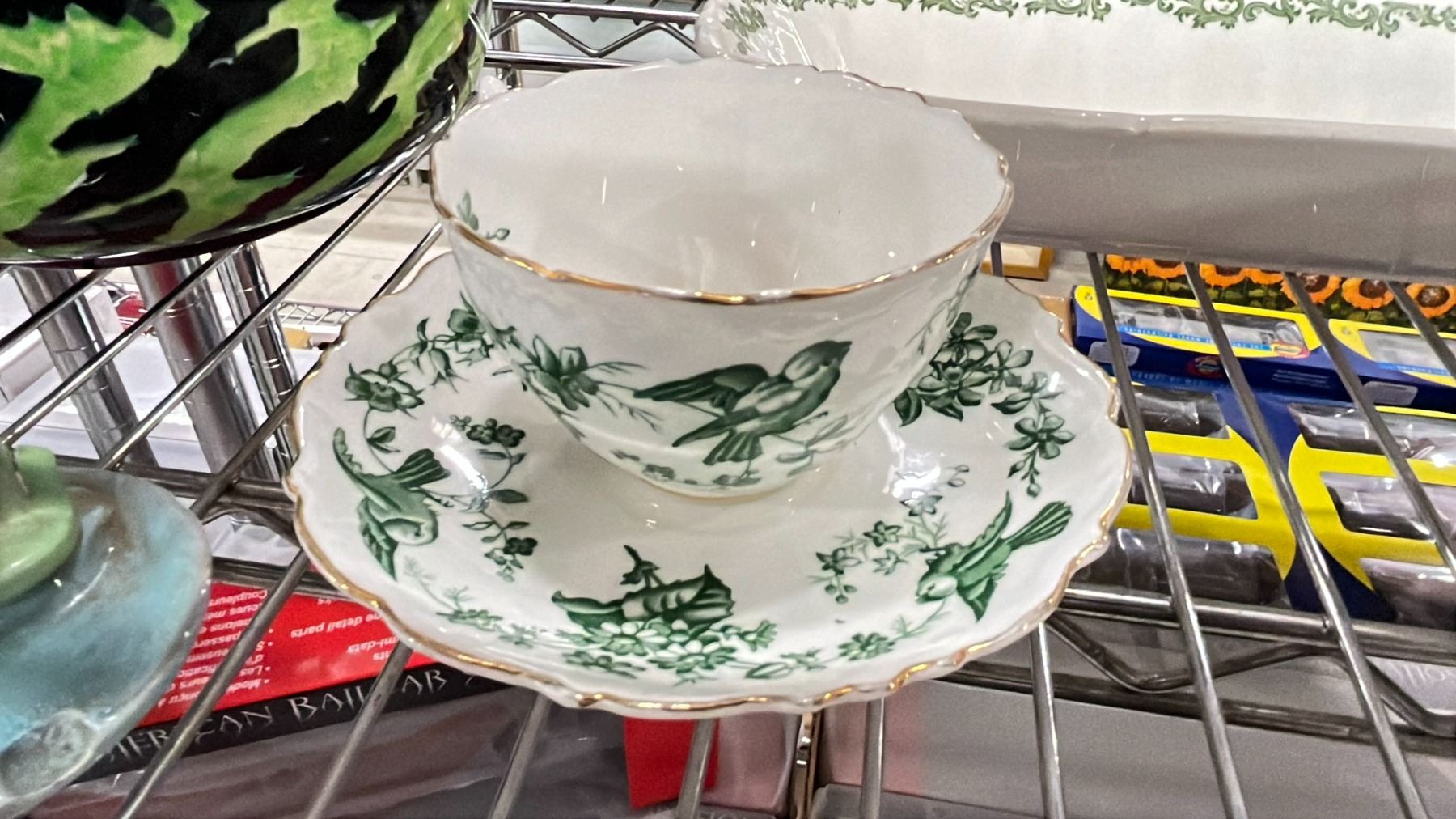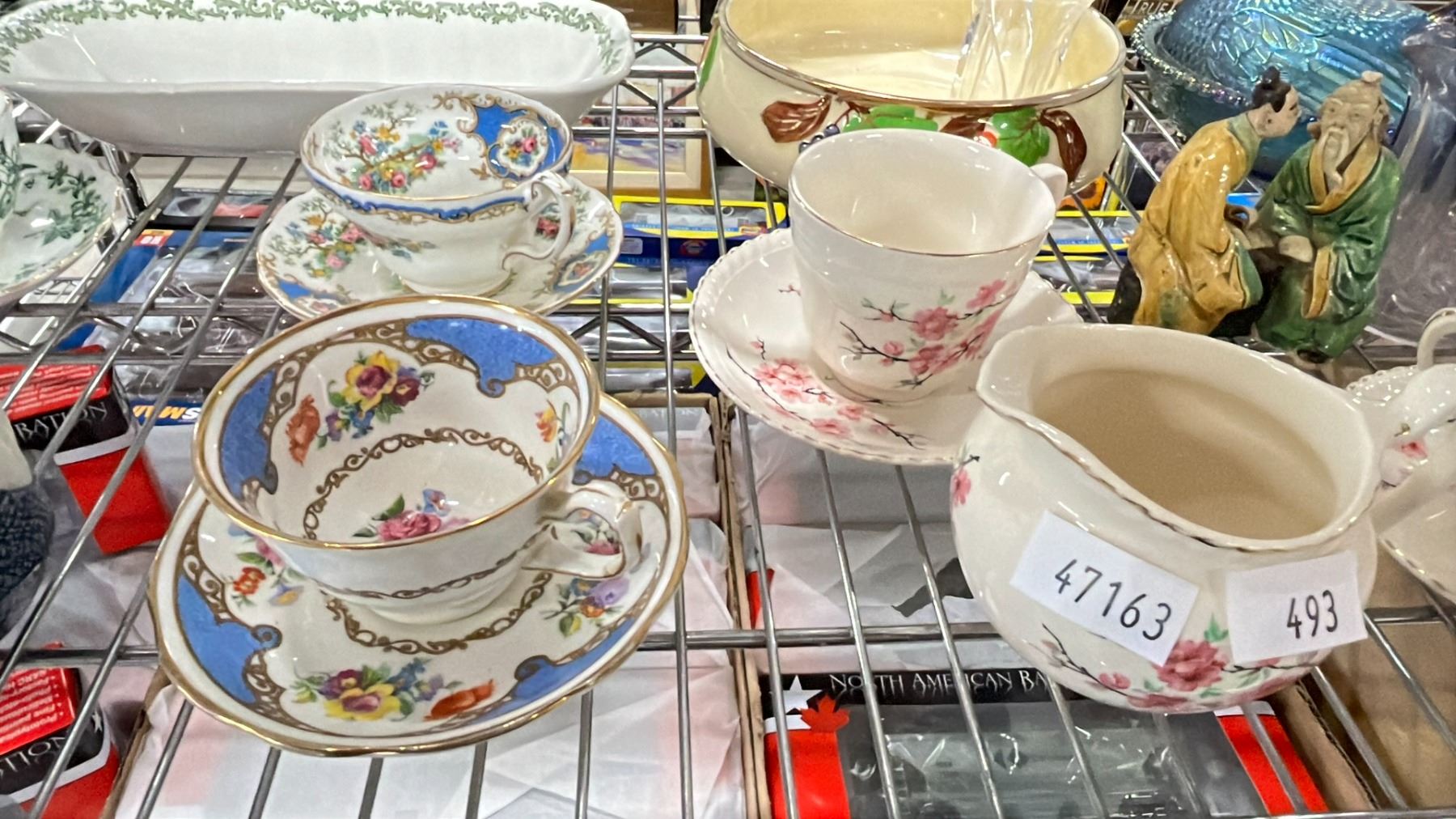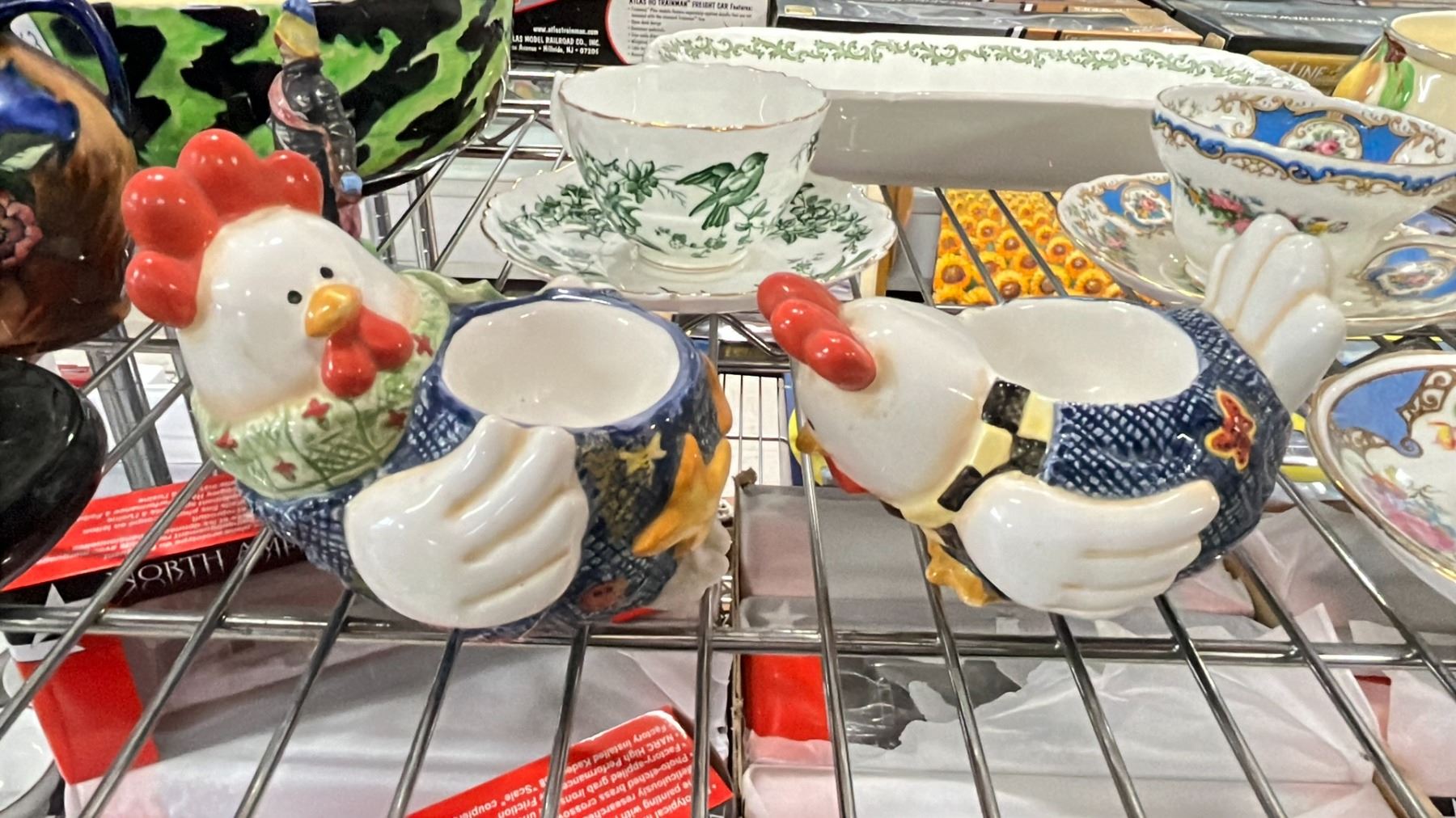 SHELF OF VARIOUS CHINA, CARNIVAL GLASS HEN & MORE