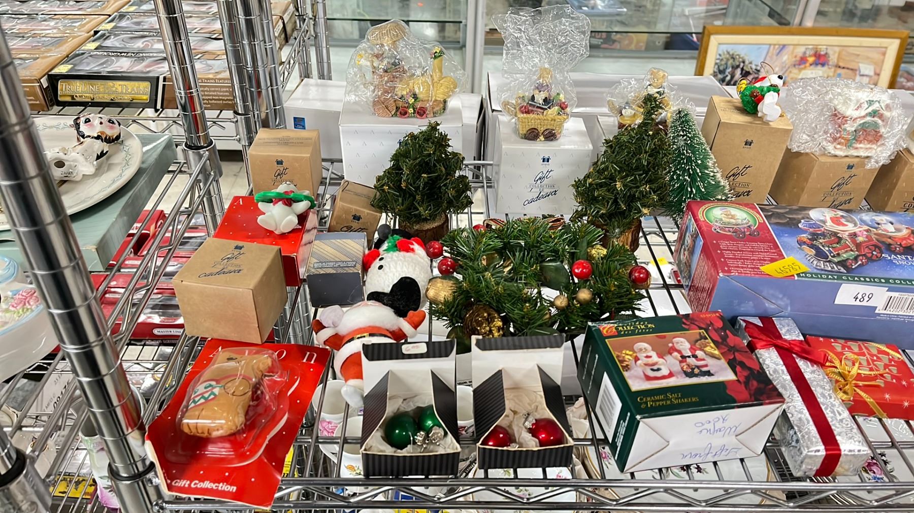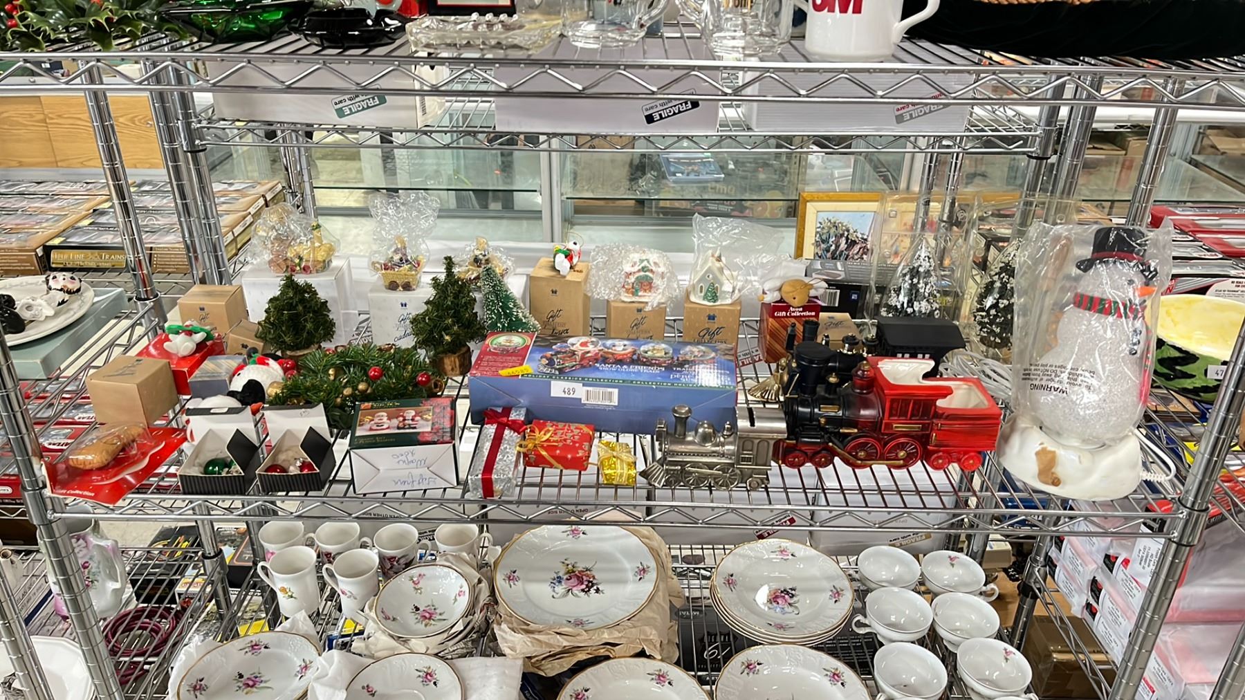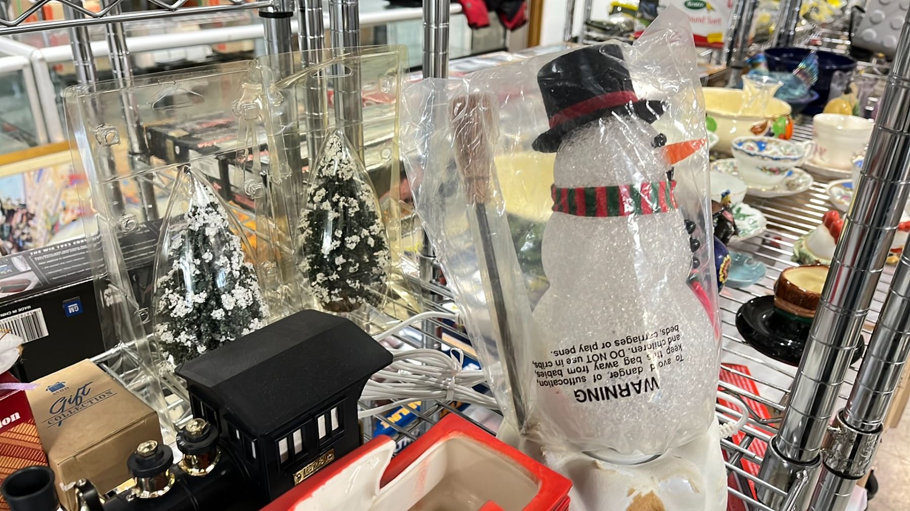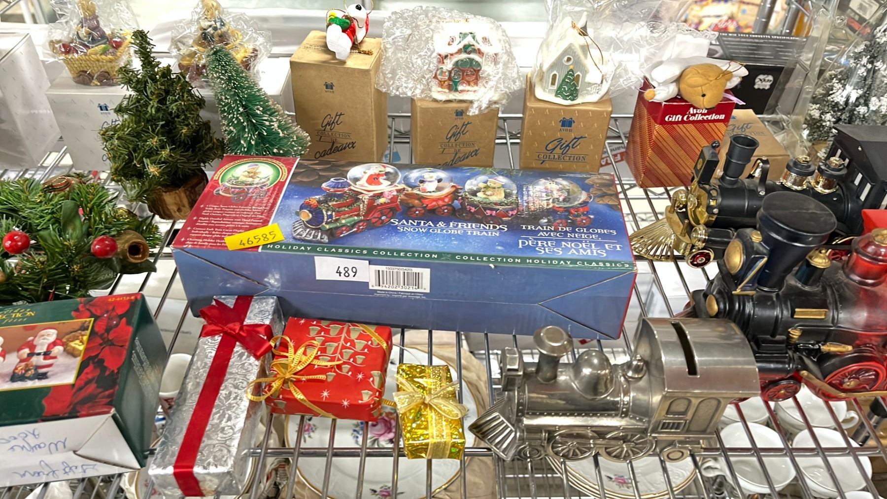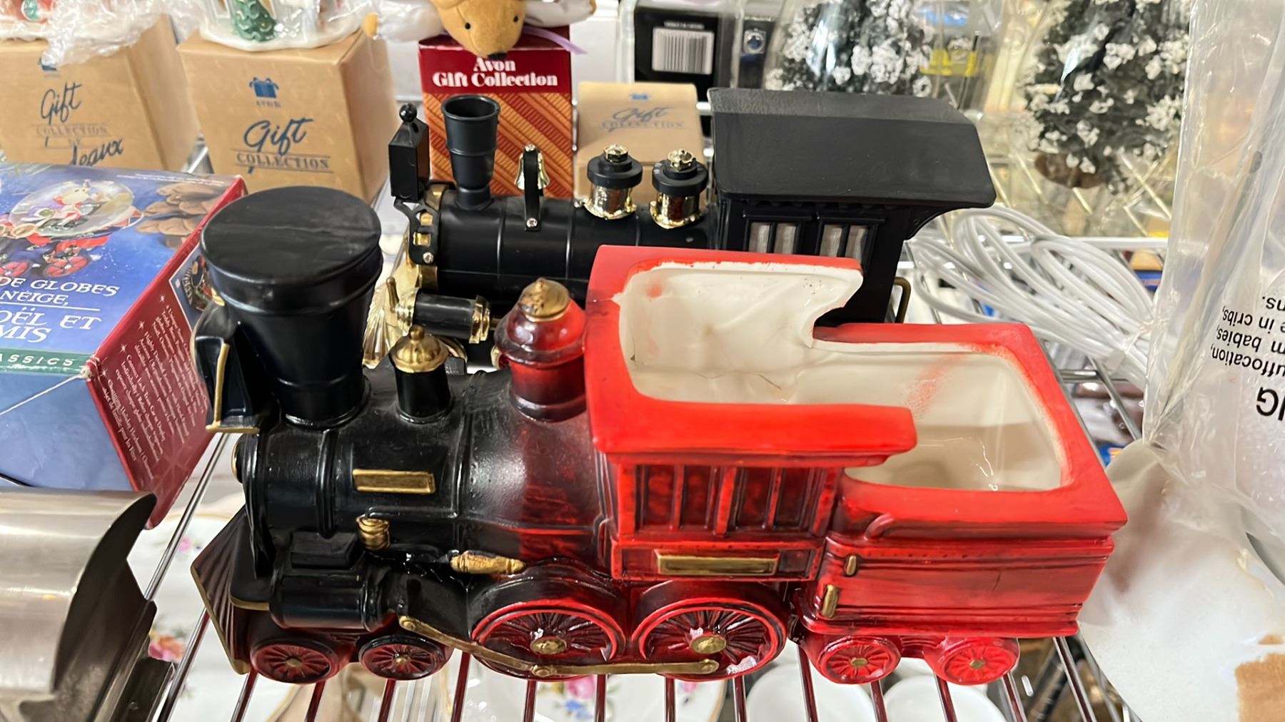 SHELF OF VARIOUS CHRISTMAS DECORATIONS, HOLIDAY TRAINS, ILLUMINATED SNOWMAN & MORE