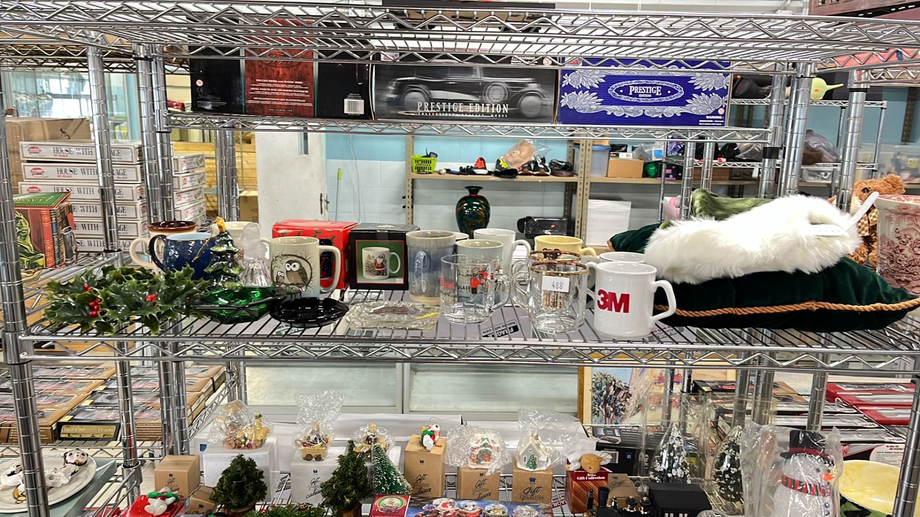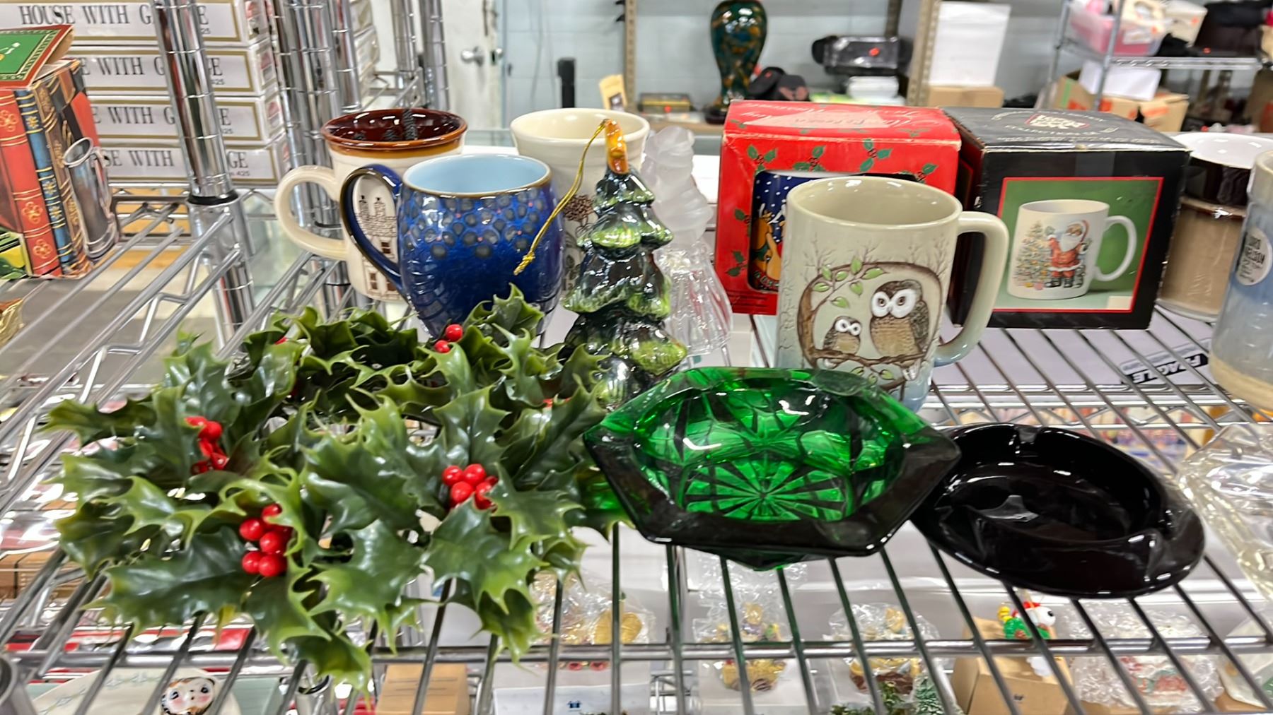 SHELF OF VARIOUS MUGS, CHRISTMAS DECOR & MORE