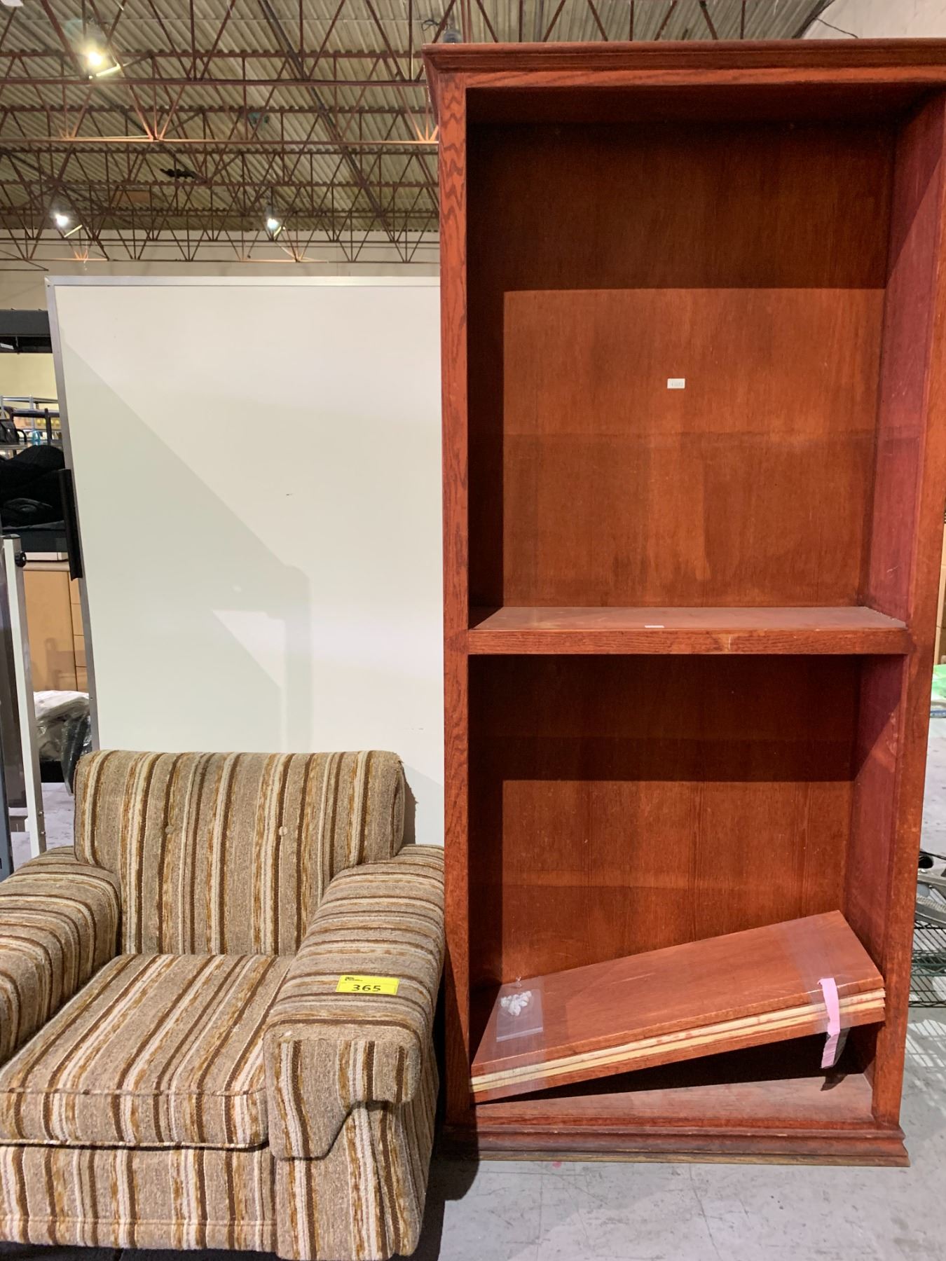 SHELF UNIT, MULTI COLOURED CHAIR AND WHITE BOARD