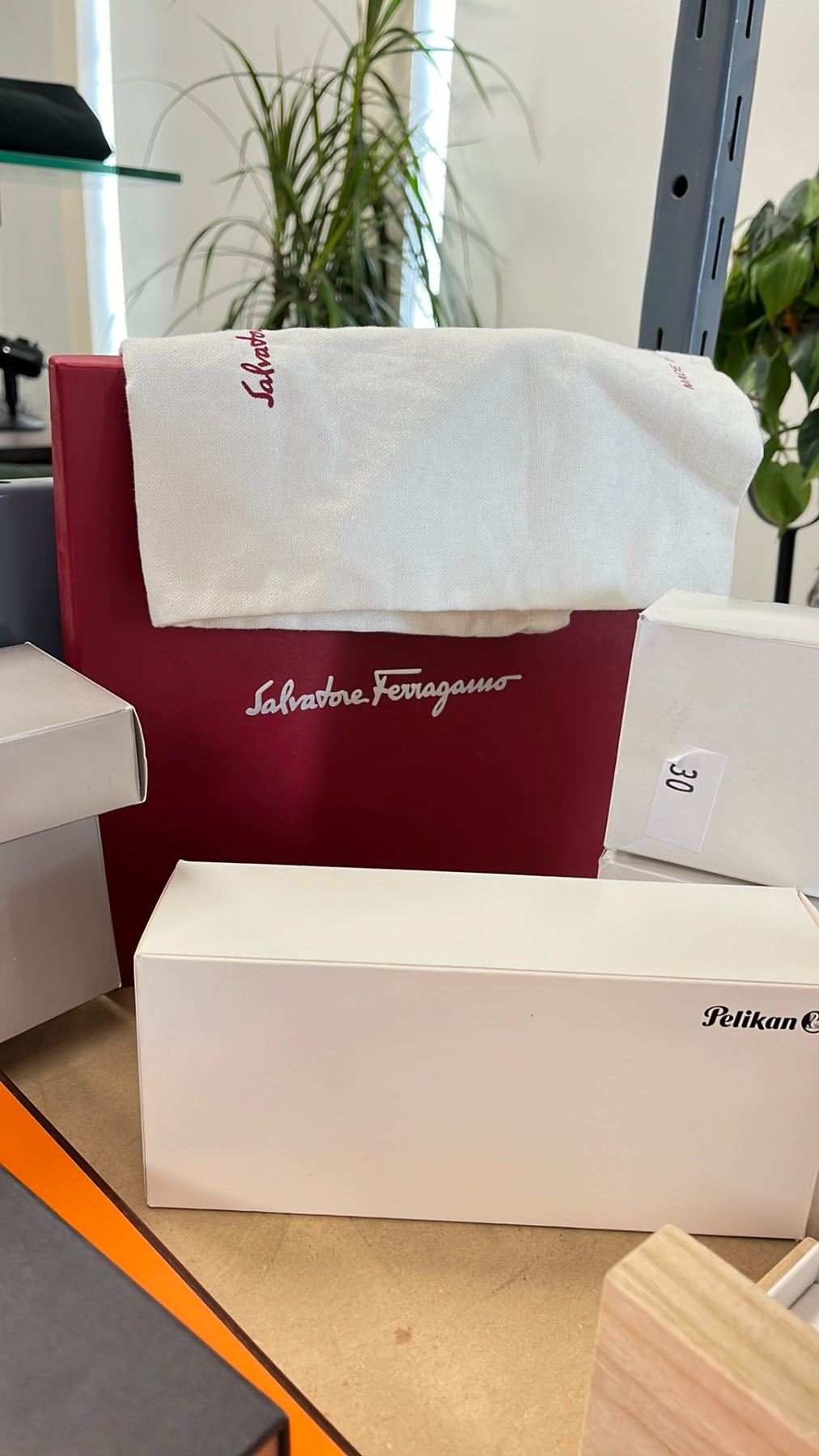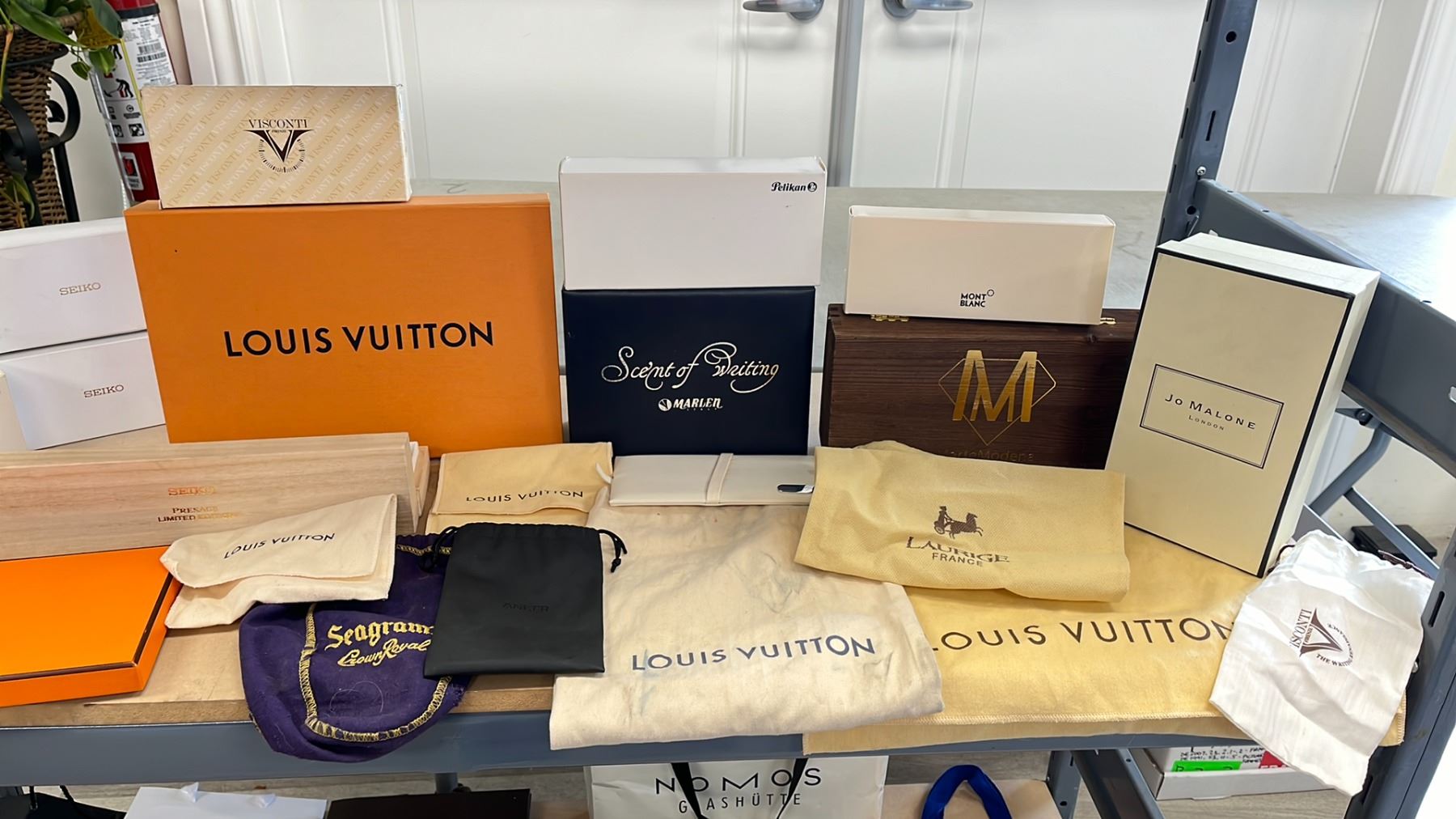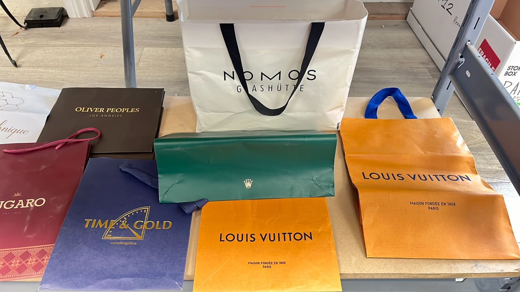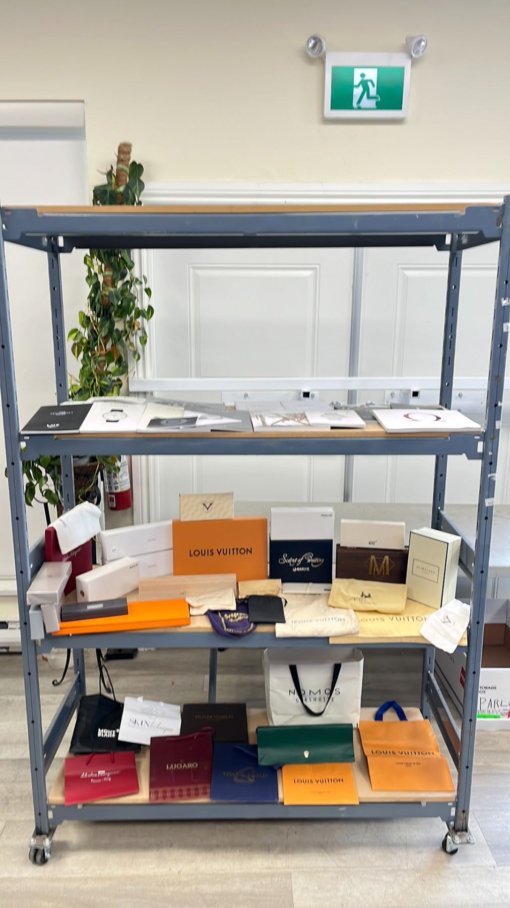 SHELFS OF DESIGNER PACKAGING, BAGS, BOXES FROM BRANDS SUCH AS LOUIS VUITTON, TIMED GOLD, LUGARO,