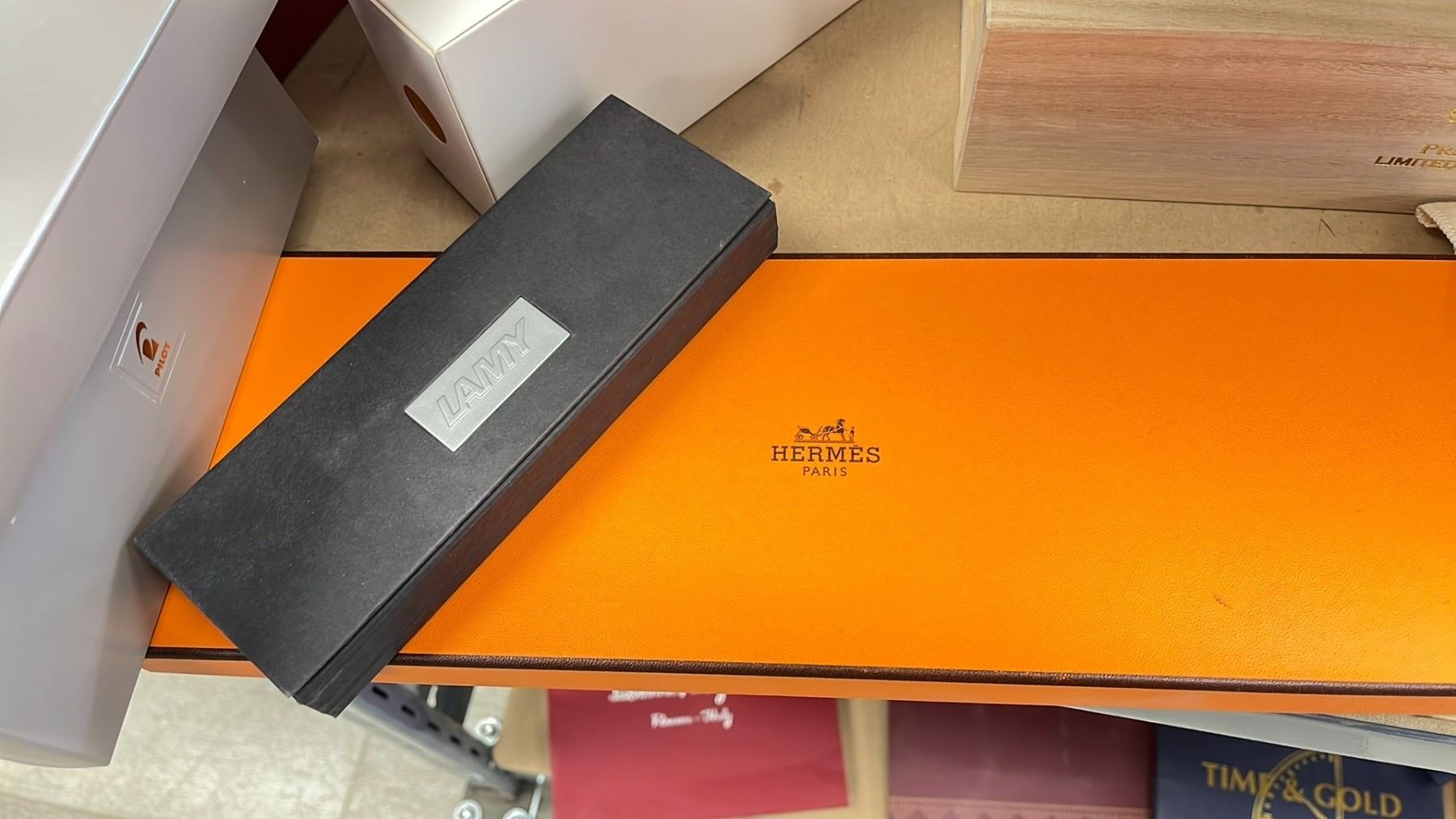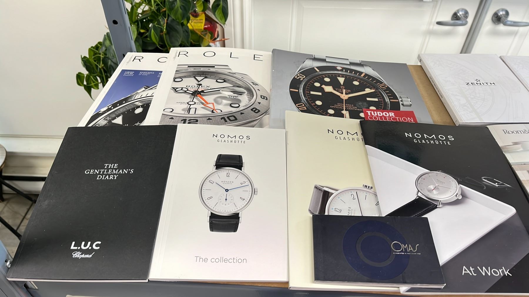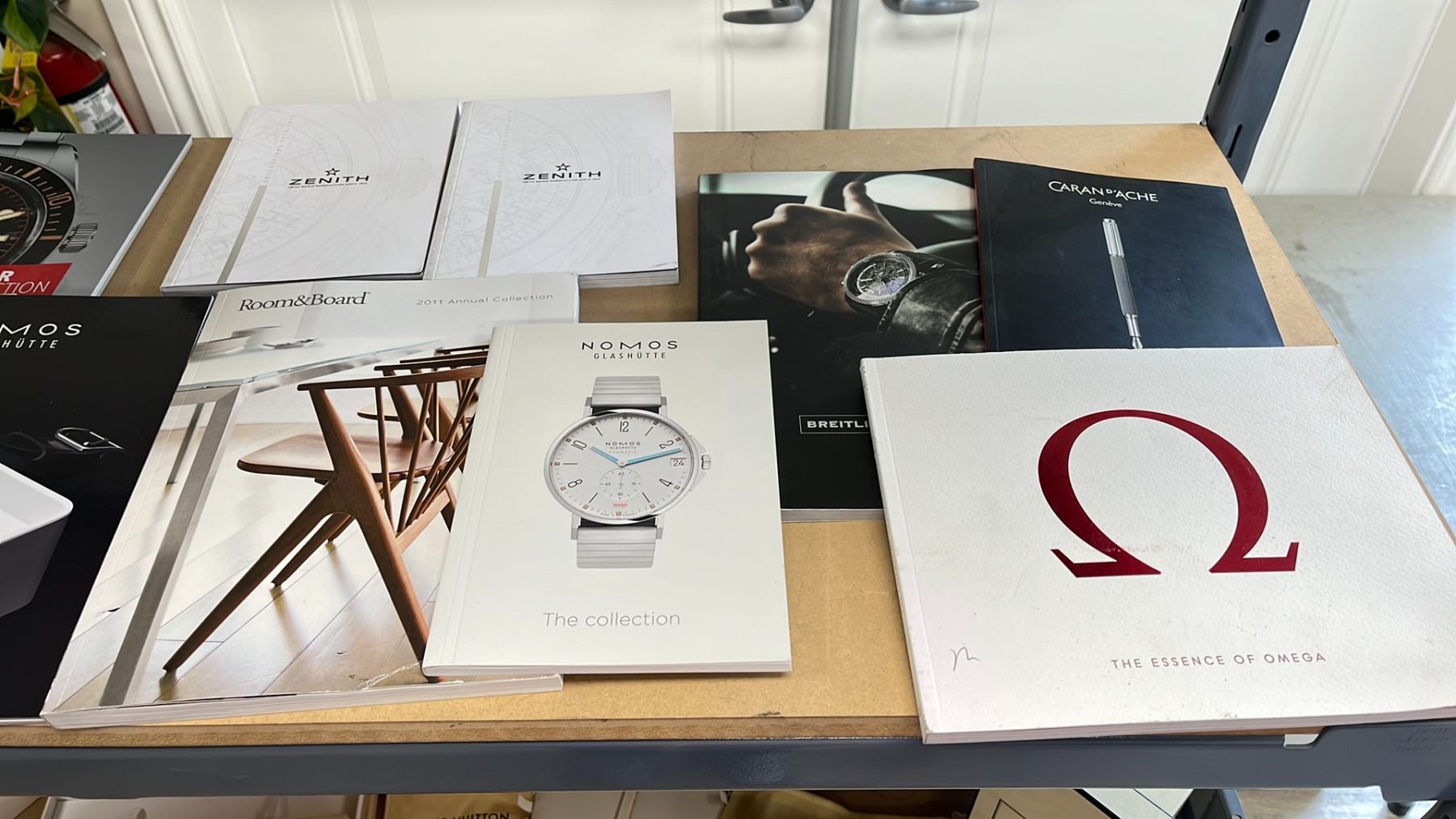 SHELFS OF DESIGNER PACKAGING, BAGS, BOXES FROM BRANDS SUCH AS LOUIS VUITTON, TIMED GOLD, LUGARO, LAMY, SEIKO AND OTHERS, WATCH MAGAZINES BY BRANDS ROLEX, ZENITH, ROLEX AND MORE. SHELFING NOT INCLUDED