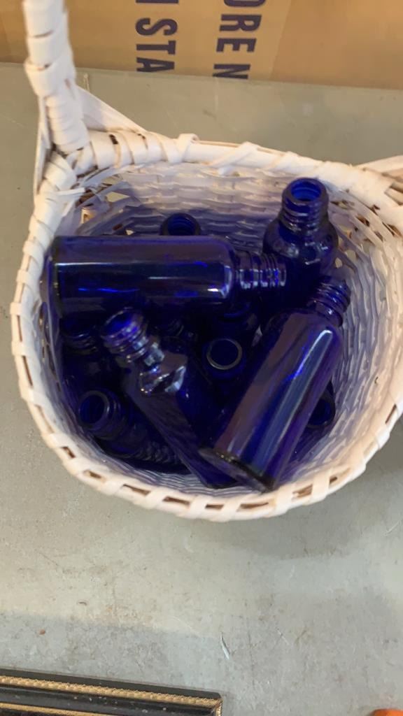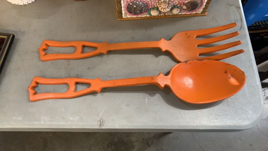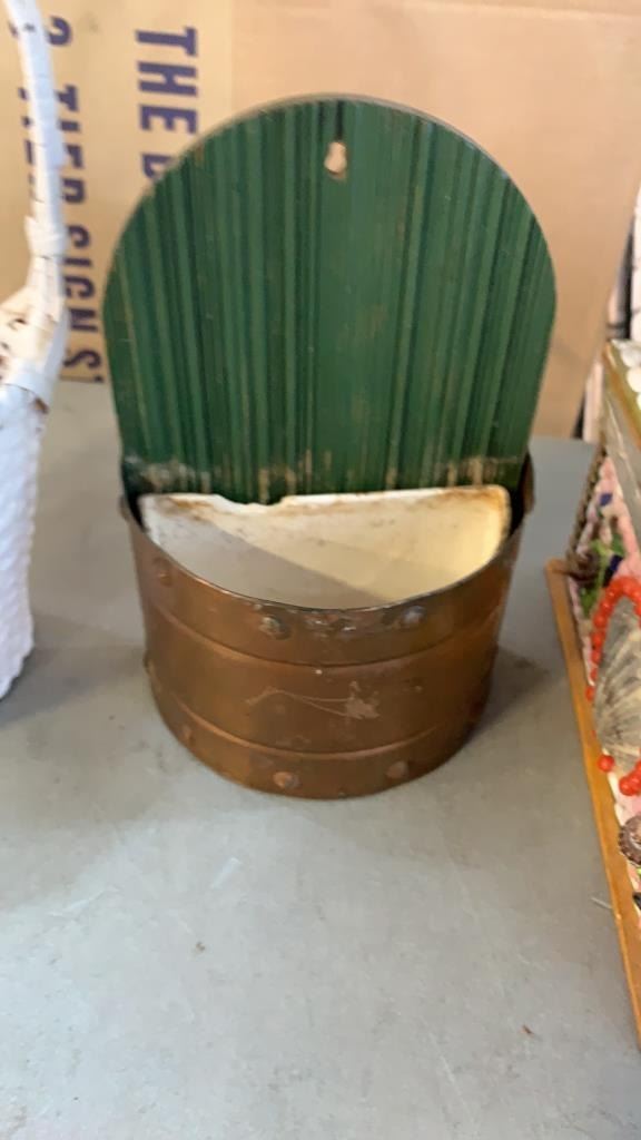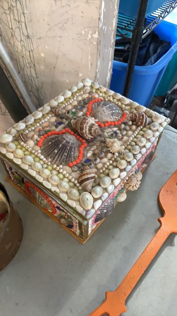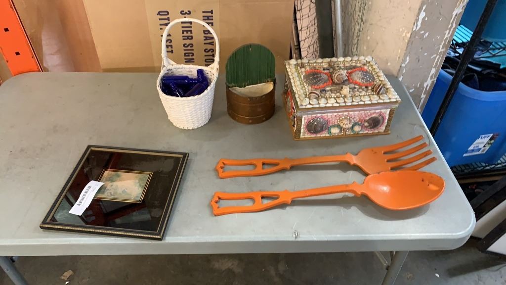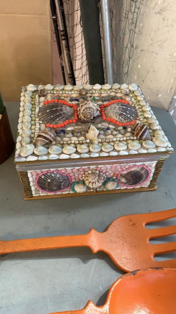 SHELL BOX WITH WOODEN SERVING UTENSILS, BOTTLES AND SMALL PLANTER