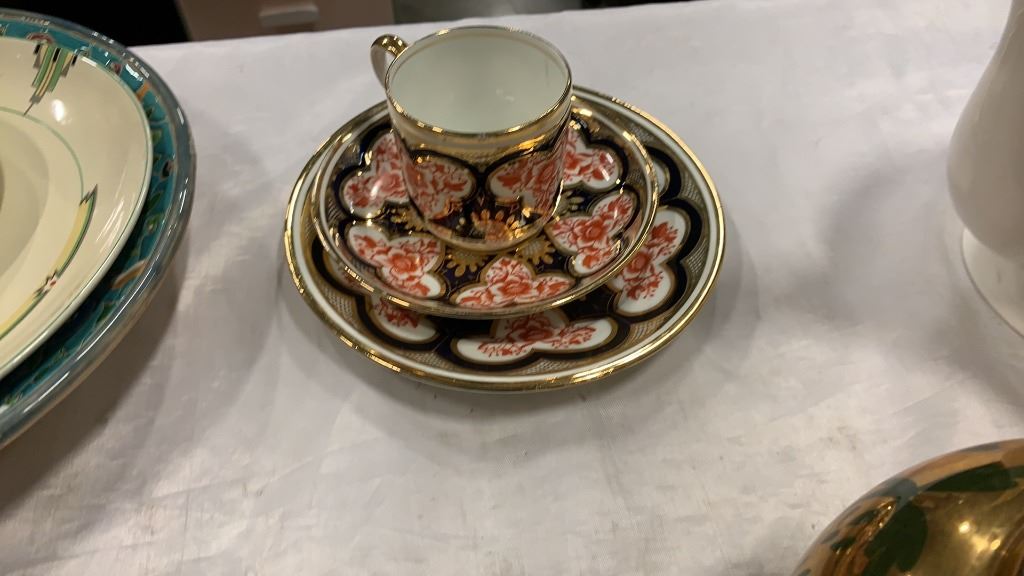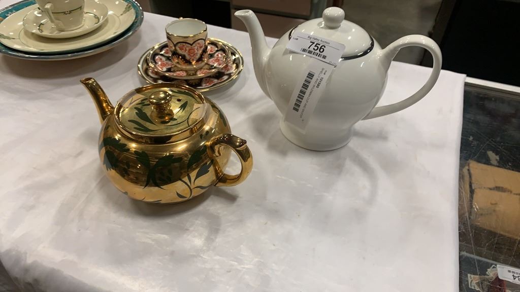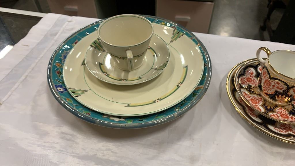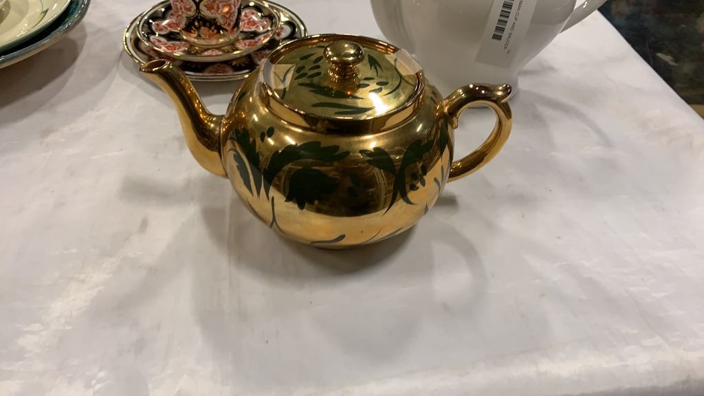 SHELLY AND WILEMAN CUP AND SAUCER SET, METRO NELSON WARE CUP AND SAUCER SET, GIBSON TEAPOT, MANTLES