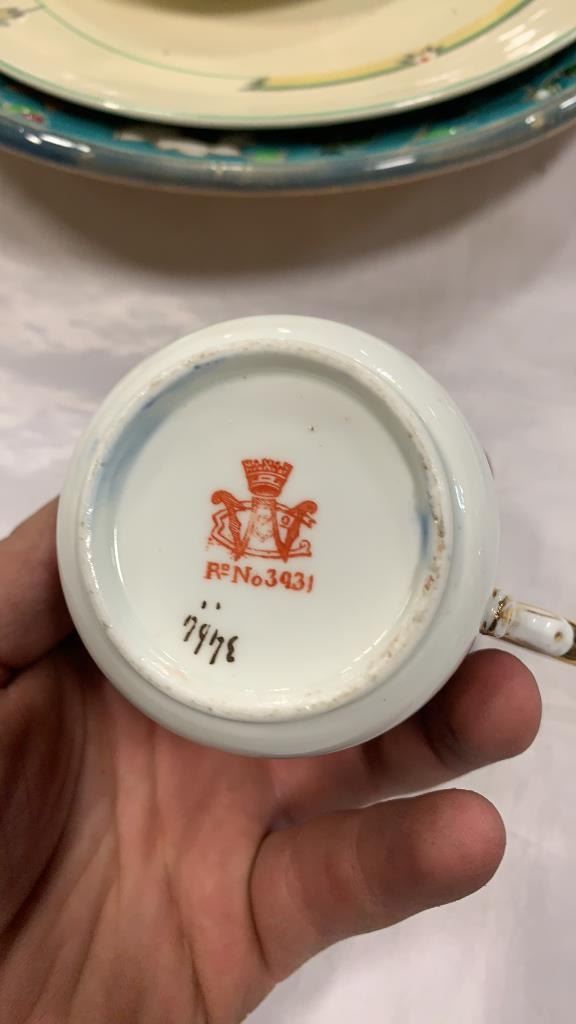 SHELLY AND WILEMAN CUP AND SAUCER SET, METRO NELSON WARE CUP AND SAUCER SET, GIBSON TEAPOT, MANTLES TEAPOT, AND POTTERY PALTTER