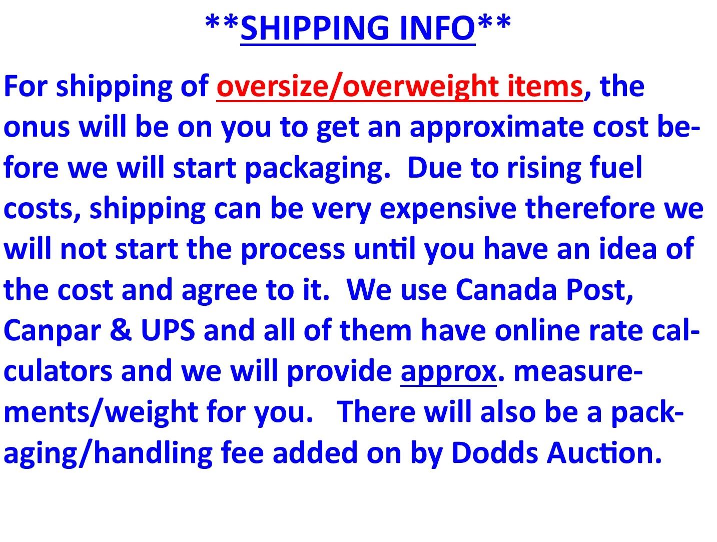 Shipping will be via Canada Post including insurance (unless advised otherwise) at the rate of $2.25/$100 and costs will be determined after the auction and charged to the credit card you registered with on Live Auction World.