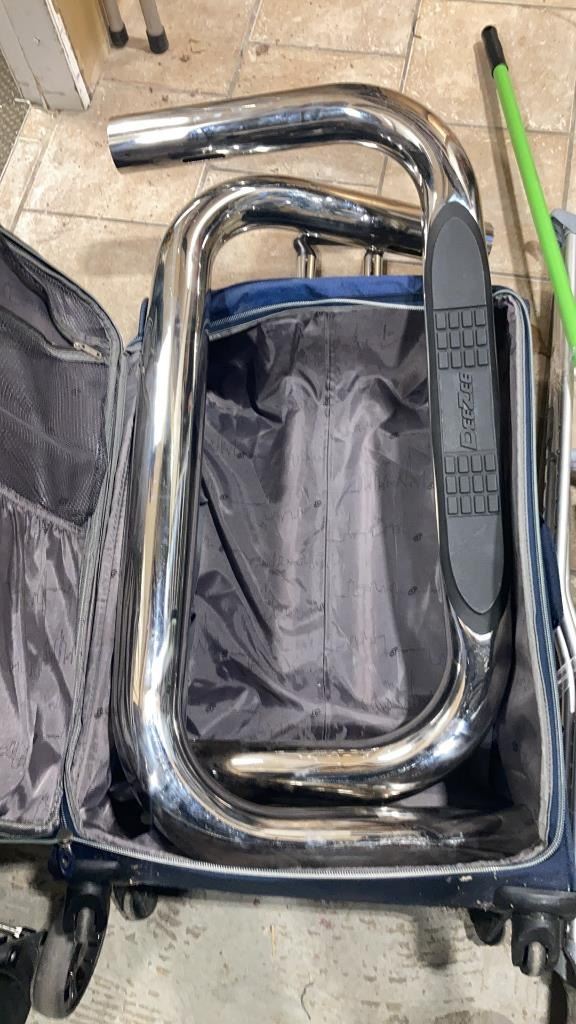 SHOPPING CART WITH YOGA MAT, SPORT RACKETS, CRUTCHES, SKIS, LUGGAGE BAG AND TRUCK STEP RAILS