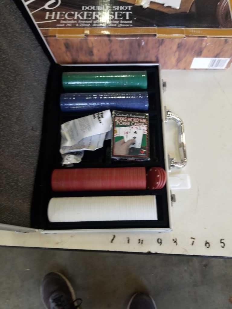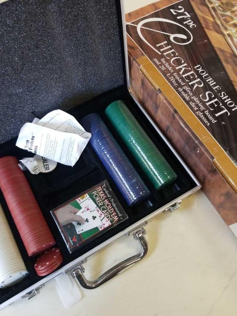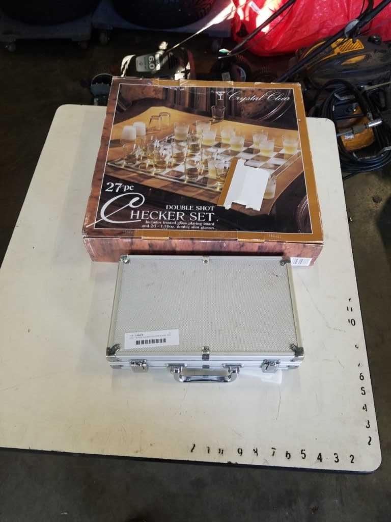 SHOT GLASS GLASS-CHECKER BOARD AND POKER SET IN CASE