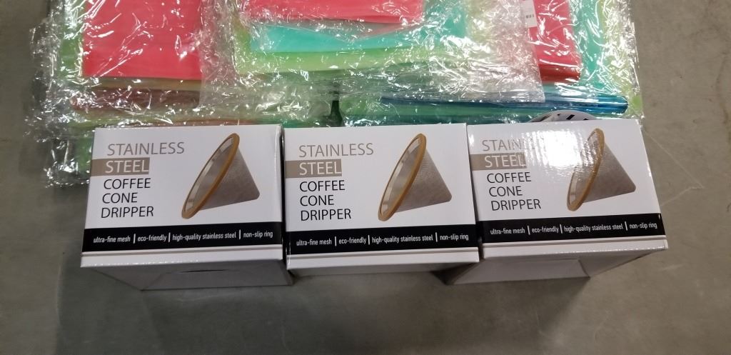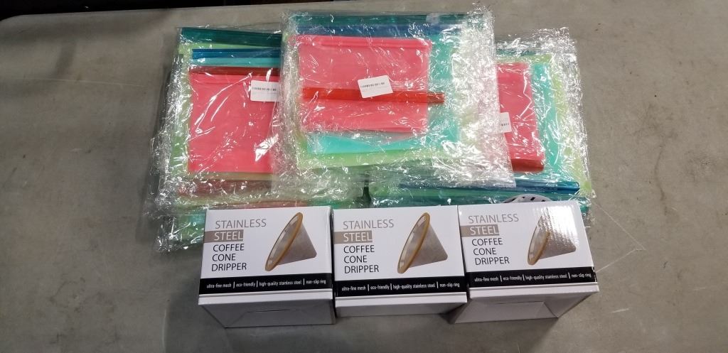 SILICONE FOOD STORAGE BAGS, 10 PACKAGES AND 3 STAINLESS STEEL COFFEE CONE DRIPPERS