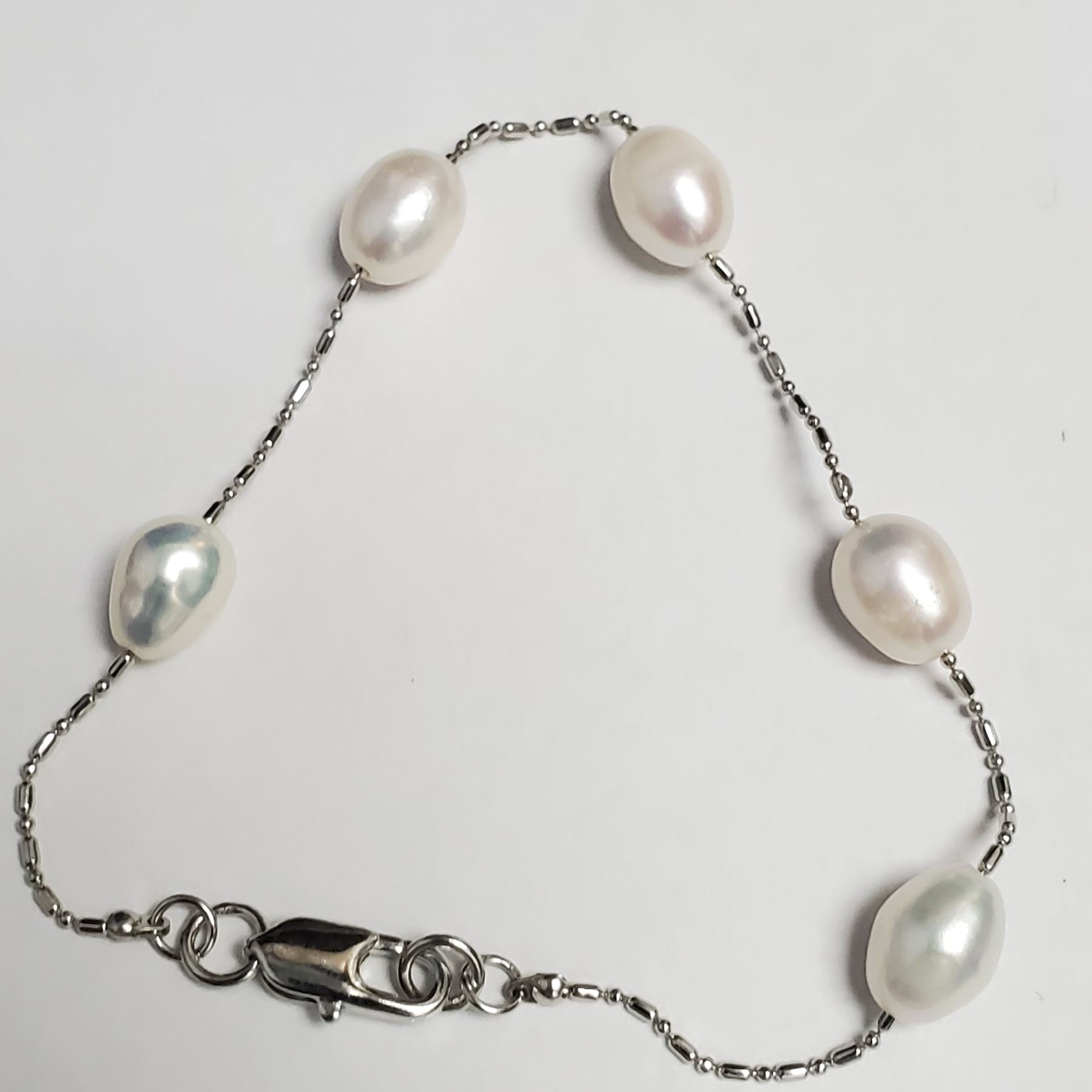 SILVER FRESH WATER PEARL BRACELET SILVER FRESHWATER PEARL 7.5" BRACELET. BRACELET HAS FIVE BEAUTIFUL PEARLS